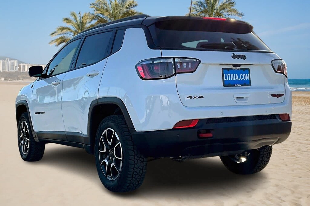 Bright White Clearcoat 2026 Jeep Compass Trailhawk 4WD 8-Speed Automatic 2.0L I4 DOHC FRESH OIL CHANGE, 4WD, 10.1 Touchscreen Display, 4-Wheel Disc Brakes, 4.398 Final Drive Ratio, 6 Speakers, ABS brakes, Air Conditioning, Alloy wheels, AM/FM radio: SiriusXM, Auto High-beam Headlights, Auto-dimming Rear-View mirror, Automatic temperature control, Brake assist, Bumpers: body-color, Compass, Delay-off headlights, Driver door bin, Driver vanity mirror, Dual front impact airbags, Dual front side impact airbags, Electronic Stability Control, Emergency communication system, Four wheel independent suspension, Front anti-roll bar, Front Bucket Seats, Front Center Armrest w/Storage, Front dual zone A/C, Front fog lights, Front License Plate Bracket, Front reading lights, Fully automatic headlights, Heated door mirrors, Heated front seats, Heated steering wheel, Illuminated entry, Knee airbag, Leather Shift Knob, Leather steering wheel, Low tire pressure warning, Occupant sensing airbag, Outside temperature display, Overhead airbag, Overhead console, Panic alarm, ParkView Rear Back-Up Camera, Passenger door bin, Passenger vanity mirror, Power door mirrors, Power driver seat, Power Liftgate, Power steering, Power windows, Premium Cloth/Leather Trim Bucket Seats, Quick Order Package 29E, Radio: Uconnect 5 w/10.1 Display, Rain sensing wipers, Rear anti-roll bar, Rear seat center armrest, Rear window defroster, Rear window wiper, Remote keyless entry, Security system, Speed control, Split folding rear seat, Spoiler, Steering wheel mounted audio controls, Tachometer, Telescoping steering wheel, Tilt steering wheel, Traction control, Trip computer, Turn signal indicator mirrors, Variably intermittent wipers, Wheels: 17 x 6.5 Painted Black Aluminum, 4WD.