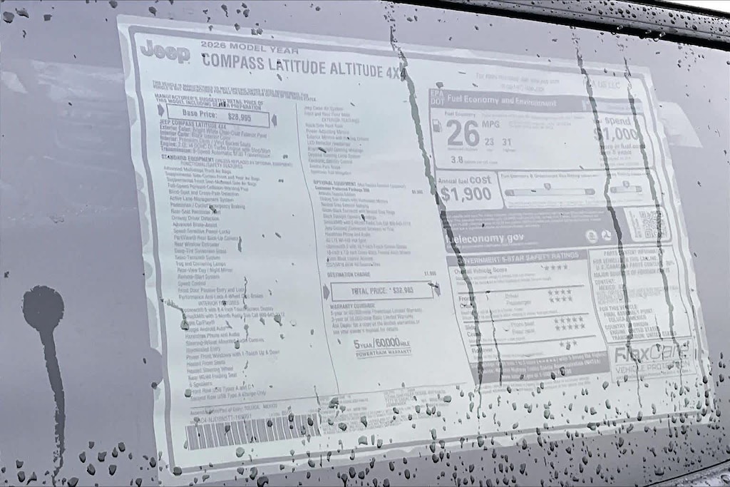 Lithia Chrysler Dodge Jeep Ram of Tri-Cities is pleased to offer this Bright White Clearcoat 2026 Jeep Compass Latitude for purchase, this vehicle is well equipped with many features including:Quick Order Package 29N Altitude (10.1 Touchscreen Display, Altitude Special Edition, Black Day Light Opening Moldings, Gloss Black Surround/Neutral Gray Rings, Neutral Gray Exterior Badging, Piano Black Interior Accents, Sliding Sun Visors with Illuminated Mirrors, and Wheels: 18 x 7 Gloss Black Painted Aluminum), 4WD, 17 x 7 Aluminum Wheels, 3.73 Final Drive Ratio, 4-Wheel Disc Brakes, 4G LTE Wi-Fi Hot Spot, 6 Speakers, ABS brakes, Air Conditioning, AM/FM radio: SiriusXM, Auto High-beam Headlights, Automatic temperature control, Bluetooth Handsfree Phone and Audio, Brake assist, Bumpers: body-color, Compass, Delay-off headlights, Driver door bin, Driver vanity mirror, Dual front impact airbags, Dual front side impact airbags, Electronic Stability Control, Emergency communication system: SiriusXM Guardian, Four wheel independent suspension, Front anti-roll bar, Front Bucket Seats, Front Center Armrest w/Storage, Front fog lights, Front License Plate Bracket, Front reading lights, Fully automatic headlights, Global Telematics Box Module, Heated door mirrors, Heated front seats, Heated steering wheel, Illuminated entry, Knee airbag, Leather Shift Knob, Leather steering wheel, Low tire pressure warning, Manufacture Statement of Origin, Occupant sensing airbag, Outside temperature display, Overhead airbag, Overhead console, Panic alarm, ParkView Rear Back-Up Camera, Passenger door bin, Passenger vanity mirror, Power door mirrors, Power steering, Power windows, Premium audio system: UConnect 5, Premium Cloth/Vinyl Bucket Seats, Radio: Uconnect 5 with 8.4 Display, Rear anti-roll bar, Rear seat center armrest, Rear window defroster, Rear window wiper, Remote keyless entry, Security system, SiriusXM Satellite Radio, Speed control, Split folding rear seat, Spoiler, Steering wheel mounted audio controls, Tachometer, Telescoping steering wheel, Tilt steering wheel, Traction control, Trip computer, and Variably intermittent wipers. 23/31 City/Highway MPG