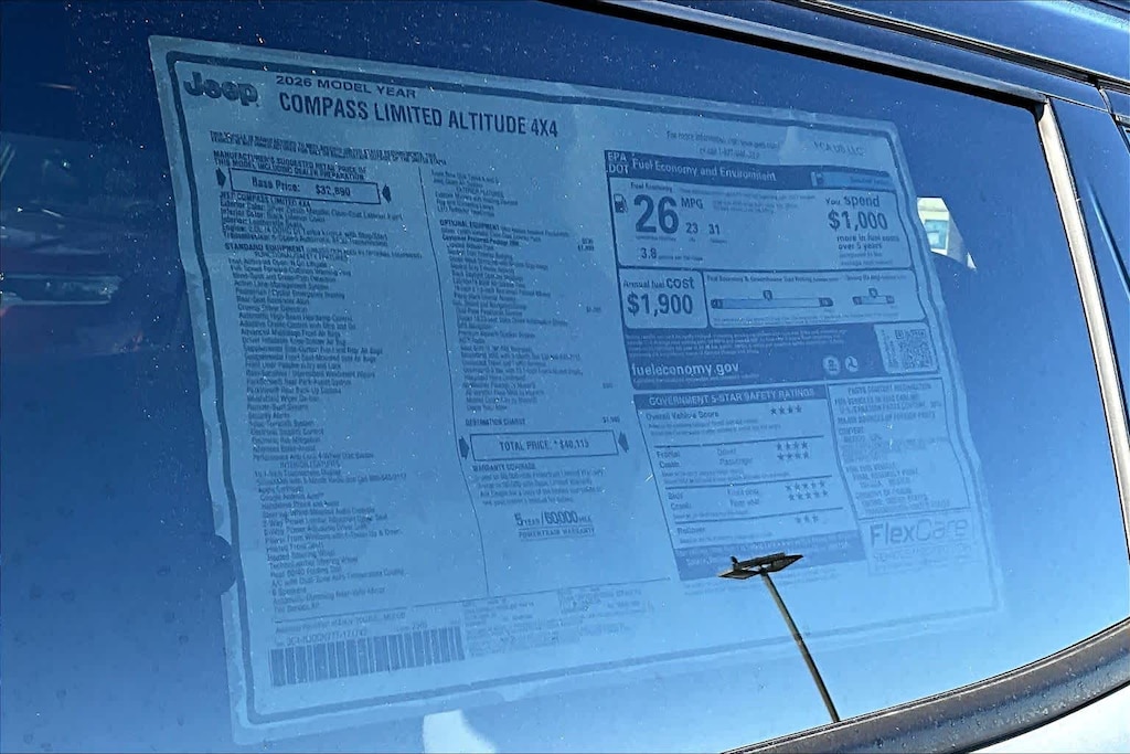 Lithia Chrysler Dodge Jeep Ram of Tri-Cities is pleased to offer this Silver Zynith Metallic Clearcoat 2026 Jeep Compass Limited for purchase, this vehicle is well equipped with many features including:Limited Altitude Pack (Black Day Light Opening Moldings, Gloss Black Surround/Neutral Gray Rings, Neutral Gray Exterior Accents, Neutral Gray Exterior Badging, Piano Black Interior Accents, and Wheels: 19 x 7.5 Aluminum Painted), MOPAR All Weather Package (MOPAR All-Weather Floor Mats and MOPAR Molded Cargo Tray), Quick Order Package 29W Limited Altitude, Sun, Sound and Navigation Group (10.1 Touchscreen Display, Alexa Built-In, Cluster 10.25 TFT Color Display, Connected Travel and Traffic Services, GPS Navigation, HD Radio, Integrated Voice Command with Bluetooth, Power Front/Fixed Rear Full Sunroof, Premium Alpine Speaker System, and SiriusXM with 360L), 4WD, 3.73 Final Drive Ratio, 4-Wheel Disc Brakes, 4G LTE Wi-Fi Hot Spot, 6 Speakers, ABS brakes, Air Conditioning, Alloy wheels, AM/FM radio: SiriusXM, Auto High-beam Headlights, Auto-dimming Rear-View mirror, Automatic temperature control, Brake assist, Bumpers: body-color, Compass, Delay-off headlights, Driver door bin, Driver vanity mirror, Dual front impact airbags, Dual front side impact airbags, Electronic Stability Control, Emergency communication system: SiriusXM Guardian, Four wheel independent suspension, Front anti-roll bar, Front Bucket Seats, Front Center Armrest w/Storage, Front dual zone A/C, Front fog lights, Front License Plate Bracket, Front reading lights, Fully automatic headlights, Global Telematics Box Module, Heated door mirrors, Heated front seats, Heated steering wheel, Illuminated entry, Knee airbag, Leather Shift Knob, Leather steering wheel, Leatherette Seats, Low tire pressure warning, Occupant sensing airbag, Outside temperature display, Overhead airbag, Overhead console, Panic alarm, ParkView Rear Back-Up Camera, Passenger door bin, Passenger vanity mirror, Power door mirrors, Power driver seat, Power Liftgate, Power steering, Power windows, Premium audio system: UConnect 5, Radio: Uconnect 5 with 10.1 Display, Rain sensing wipers, Rear anti-roll bar, Rear seat center armrest, Rear window defroster, Rear window wiper, Remote keyless entry, Security system, SiriusXM Guardian - Included Trail (B), SiriusXM Radio Service, Speed control, Split folding rear seat, Spoiler, Steering wheel mounted audio controls, Tachometer, Telescoping steering wheel, Tilt steering wheel, Traction control, Trip computer, Turn signal indicator mirrors, Variably intermittent wipers, and Wheels: 18 x 7 Painted Diamond Cut Aluminum. 23/31 City/Highway MPG