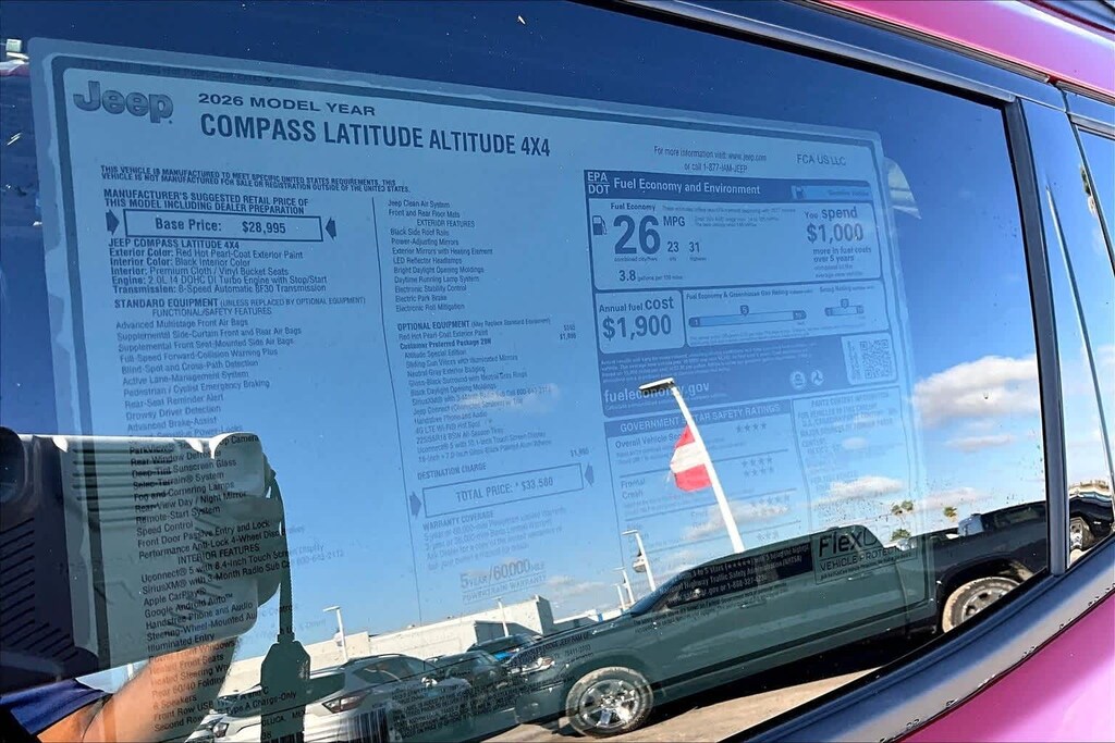 Red Hot Pearlcoat 2026 Jeep Compass Latitude 4WD 8-Speed Automatic 2.0L I4 DOHC FRESH OIL CHANGE, 4WD, 10.1 Touchscreen Display, 17 x 7 Aluminum Wheels, 3.73 Final Drive Ratio, 4-Wheel Disc Brakes, 4G LTE Wi-Fi Hot Spot, 6 Speakers, ABS brakes, Air Conditioning, Altitude Special Edition, AM/FM radio: SiriusXM, Auto High-beam Headlights, Automatic temperature control, Black Day Light Opening Moldings, Bluetooth Handsfree Phone and Audio, Brake assist, Bumpers: body-color, Compass, Delay-off headlights, Driver door bin, Driver vanity mirror, Dual front impact airbags, Dual front side impact airbags, Electronic Stability Control, Emergency communication system: SiriusXM Guardian, Four wheel independent suspension, Front anti-roll bar, Front Bucket Seats, Front Center Armrest w/Storage, Front fog lights, Front License Plate Bracket, Front reading lights, Fully automatic headlights, Global Telematics Box Module, Gloss Black Surround/Neutral Gray Rings, Heated door mirrors, Heated front seats, Heated steering wheel, Illuminated entry, Knee airbag, Leather Shift Knob, Leather steering wheel, Low tire pressure warning, Manufacture Statement of Origin, Neutral Gray Exterior Badging, Occupant sensing airbag, Outside temperature display, Overhead airbag, Overhead console, Panic alarm, ParkView Rear Back-Up Camera, Passenger door bin, Passenger vanity mirror, Piano Black Interior Accents, Power door mirrors, Power steering, Power windows, Premium audio system: UConnect 5, Premium Cloth/Vinyl Bucket Seats, Quick Order Package 29N Altitude, Radio: Uconnect 5 with 8.4 Display, Rear anti-roll bar, Rear seat center armrest, Rear window defroster, Rear window wiper, Remote keyless entry, Security system, SiriusXM Satellite Radio, Sliding Sun Visors with Illuminated Mirrors, Speed control, Split folding rear seat, Spoiler, Steering wheel mounted audio controls, Tachometer, Telescoping steering wheel, Tilt steering wheel, Traction control, Trip computer, Variably intermittent wipers, Wheels: 18 x 7 Gloss Black Painted Aluminum, 4WD.
