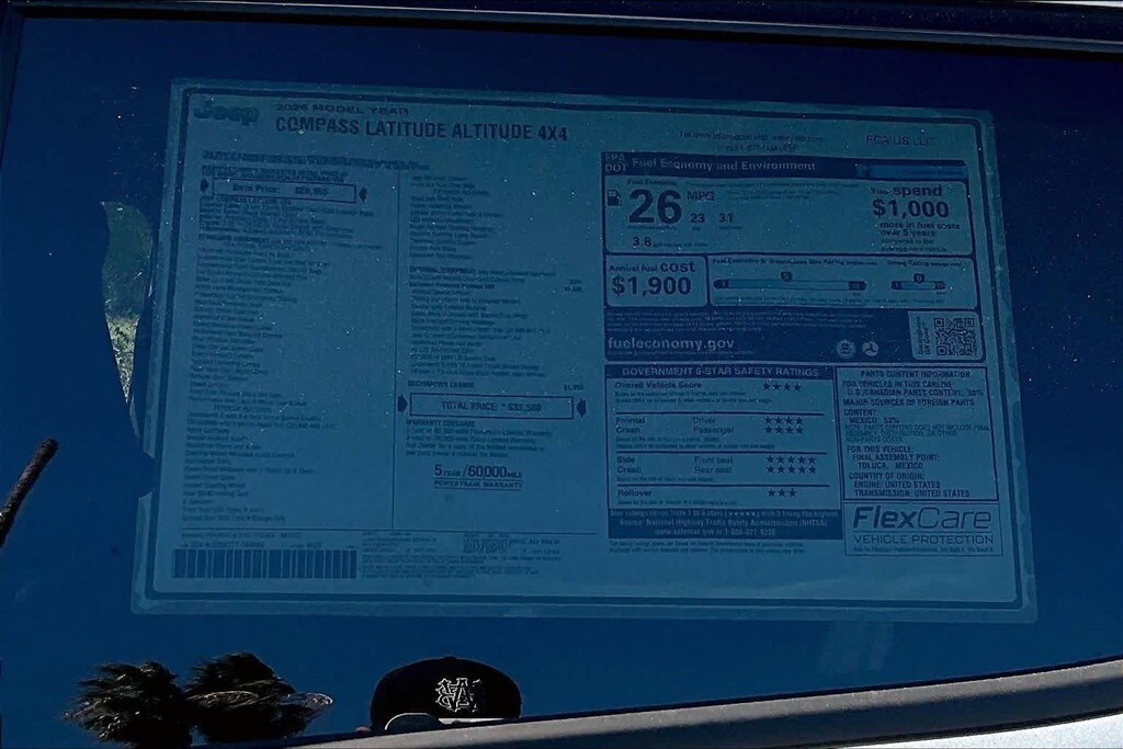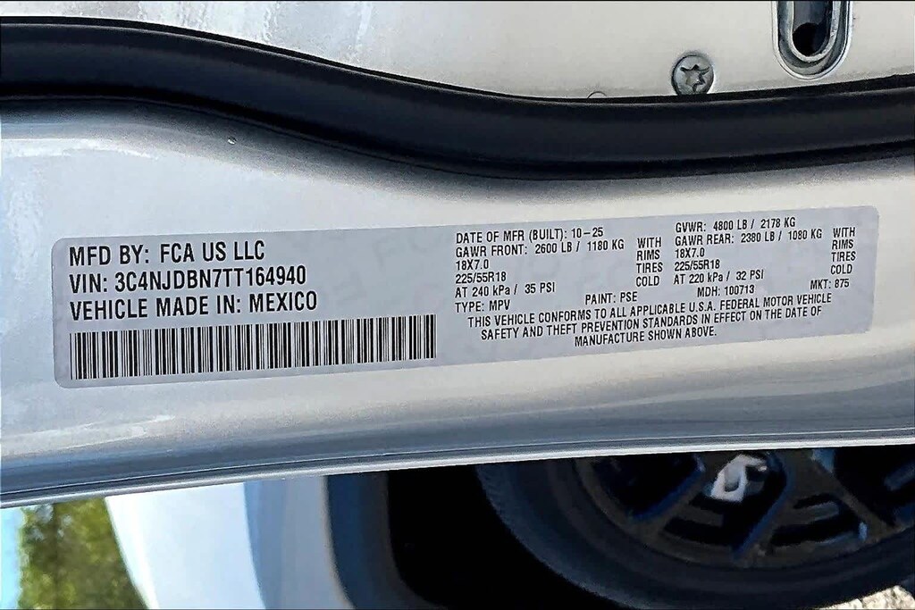 Silver Zynith Metallic Clearcoat 2026 Jeep Compass Latitude 4WD 8-Speed Automatic 2.0L I4 DOHC FRESH OIL CHANGE, 4WD, 10.1 Touchscreen Display, 17 x 7 Aluminum Wheels, 3.73 Final Drive Ratio, 4-Wheel Disc Brakes, 4G LTE Wi-Fi Hot Spot, 6 Speakers, ABS brakes, Air Conditioning, Altitude Special Edition, AM/FM radio: SiriusXM, Auto High-beam Headlights, Automatic temperature control, Black Day Light Opening Moldings, Bluetooth Handsfree Phone and Audio, Brake assist, Bumpers: body-color, Compass, Delay-off headlights, Driver door bin, Driver vanity mirror, Dual front impact airbags, Dual front side impact airbags, Electronic Stability Control, Emergency communication system: SiriusXM Guardian, Four wheel independent suspension, Front anti-roll bar, Front Bucket Seats, Front Center Armrest w/Storage, Front fog lights, Front License Plate Bracket, Front reading lights, Fully automatic headlights, Global Telematics Box Module, Gloss Black Surround/Neutral Gray Rings, Heated door mirrors, Heated front seats, Heated steering wheel, Illuminated entry, Knee airbag, Leather Shift Knob, Leather steering wheel, Low tire pressure warning, Manufacture Statement of Origin, Neutral Gray Exterior Badging, Occupant sensing airbag, Outside temperature display, Overhead airbag, Overhead console, Panic alarm, ParkView Rear Back-Up Camera, Passenger door bin, Passenger vanity mirror, Piano Black Interior Accents, Power door mirrors, Power steering, Power windows, Premium audio system: UConnect 5, Premium Cloth/Vinyl Bucket Seats, Quick Order Package 29N Altitude, Radio: Uconnect 5 with 8.4 Display, Rear anti-roll bar, Rear seat center armrest, Rear window defroster, Rear window wiper, Remote keyless entry, Security system, SiriusXM Satellite Radio, Sliding Sun Visors with Illuminated Mirrors, Speed control, Split folding rear seat, Spoiler, Steering wheel mounted audio controls, Tachometer, Telescoping steering wheel, Tilt steering wheel, Traction control, Trip computer, Variably intermittent wipers, Wheels: 18 x 7 Gloss Black Painted Aluminum, 4WD.
