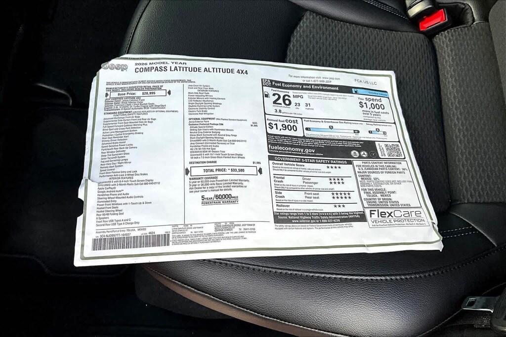 joose 2026 Jeep Compass Latitude 4WD 8-Speed Automatic 2.0L I4 DOHC FRESH OIL CHANGE, 4WD, 10.1 Touchscreen Display, 17 x 7 Aluminum Wheels, 3.73 Final Drive Ratio, 4-Wheel Disc Brakes, 4G LTE Wi-Fi Hot Spot, 6 Speakers, ABS brakes, Air Conditioning, Altitude Special Edition, AM/FM radio: SiriusXM, Auto High-beam Headlights, Automatic temperature control, Black Day Light Opening Moldings, Bluetooth Handsfree Phone and Audio, Brake assist, Bumpers: body-color, Compass, Delay-off headlights, Driver door bin, Driver vanity mirror, Dual front impact airbags, Dual front side impact airbags, Electronic Stability Control, Emergency communication system: SiriusXM Guardian, Four wheel independent suspension, Front anti-roll bar, Front Bucket Seats, Front Center Armrest w/Storage, Front fog lights, Front License Plate Bracket, Front reading lights, Fully automatic headlights, Global Telematics Box Module, Gloss Black Surround/Neutral Gray Rings, Heated door mirrors, Heated front seats, Heated steering wheel, Illuminated entry, Knee airbag, Leather Shift Knob, Leather steering wheel, Low tire pressure warning, Manufacture Statement of Origin, Neutral Gray Exterior Badging, Occupant sensing airbag, Outside temperature display, Overhead airbag, Overhead console, Panic alarm, ParkView Rear Back-Up Camera, Passenger door bin, Passenger vanity mirror, Piano Black Interior Accents, Power door mirrors, Power steering, Power windows, Premium audio system: UConnect 5, Premium Cloth/Vinyl Bucket Seats, Quick Order Package 29N Altitude, Radio: Uconnect 5 with 8.4 Display, Rear anti-roll bar, Rear seat center armrest, Rear window defroster, Rear window wiper, Remote keyless entry, Security system, SiriusXM Satellite Radio, Sliding Sun Visors with Illuminated Mirrors, Speed control, Split folding rear seat, Spoiler, Steering wheel mounted audio controls, Tachometer, Telescoping steering wheel, Tilt steering wheel, Traction control, Trip computer, Variably intermittent wipers, Wheels: 18 x 7 Gloss Black Painted Aluminum, 4WD.