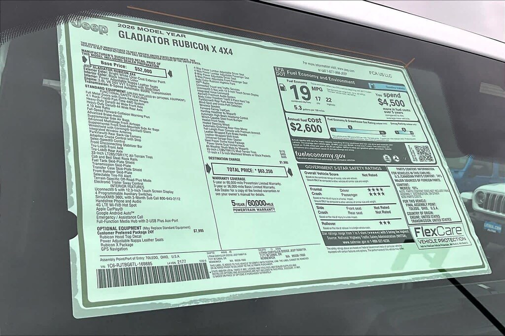 Lithia Chrysler Dodge Jeep Ram of Tri-Cities is pleased to offer this bright white clearcoat 2026 Jeep Gladiator Rubicon for purchase, this vehicle is well equipped with many features including:Quick Order Package 24Y Rubicon X (Alpine Premium Audio System, Auto High Beam Headlamp Control, Auto-Dimming Rear-View Mirror, Blind Spot and Cross Path Detection, Bluetooth Wireless Speaker, Body Color 3-Piece Hard Top, Body Color Rubicon Highline Flare, Freedom Panel Storage Bag, Full Length Floor Console Premium Armrest, Heated Front Seats, Heated Steering Wheel, Integrated Off-Road Camera, Integrated Voice Command with Bluetooth, Leather Wrapped Park Brake Handle, Leather Wrapped Shift Knob, MOPAR Hardtop Headliner, ParkSense Rear Park Assist System, Power 4-Way Driver Lumbar Adjust, Power 4-Way Passenger Lumbar Adjust, Power Adjust 8-Way Driver Seat, Power Adjust 8-Way Front Passenger Seat, Power Adjust Nappa Leather Seats, Premium Door Trim Panel, Radio: Uconnect 5 Navigation with 12.3 Display, Rear Armrest with Cupholder Seat, Rear Sliding Window, Rear Window Defroster, Rubicon Hood Top Decal, Steel Front Bumper, Universal Garage Door Opener, and USB Host Flip), Steel Power Dome Hood Package (Power Dome Dual Vented Hood), 110 Mph Vehicle Max Speed Calibration, 12.3 Touchscreen Display, 4-Wheel Disc Brakes, 4.10 Rear Axle Ratio, 4G LTE Wi-Fi Hot Spot, 8 Speakers, ABS brakes, Air Conditioning, Alexa Built-in, Alloy wheels, AM/FM radio: SiriusXM with 360L, Apple CarPlay, Apple CarPlay/Android Auto, Automatic temperature control, Brake assist, Cloth Low-Back Bucket Seats, Compass, Connectivity - US/Canada, Delay-off headlights, Driver door bin, Driver vanity mirror, Dual front impact airbags, Dual front side impact airbags, Electronic Stability Control, Emergency communication system: Jeep Connect, Front anti-roll bar, Front Bucket Seats, Front Center Armrest w/Storage, Front dual zone A/C, Front fog lights, Front License Plate Bracket, Front reading lights, Fully automatic headlights, Google Android Auto, Heated door mirrors, Illuminated entry, Integrated roll-over protection, Low tire pressure warning, Manufacturers Statement of Origin, MOPAR All-Weather Slush Mats, MOPAR Spray in Bedliner, Occupant sensing airbag, Outside temperature display, Overhead airbag, Panic alarm, Passenger door bin, Passenger vanity mirror, Performance Suspension, Power door mirrors, Power steering, Power windows, Radio data system, Radio: Uconnect 5 with 12.3 Display, Rear anti-roll bar, Rear reading lights, Remote keyless entry, Security system, Speed control, Split folding rear seat, Steering wheel mounted audio controls, Tachometer, Telescoping steering wheel, Tilt steering wheel, Traction control, Trip computer, Variably intermittent wipers, Voltmeter, Wheels: 17 x 7.5 Machined with Black Pockets, and Wheels: 17 x 7.5 Machined/Painted Black.