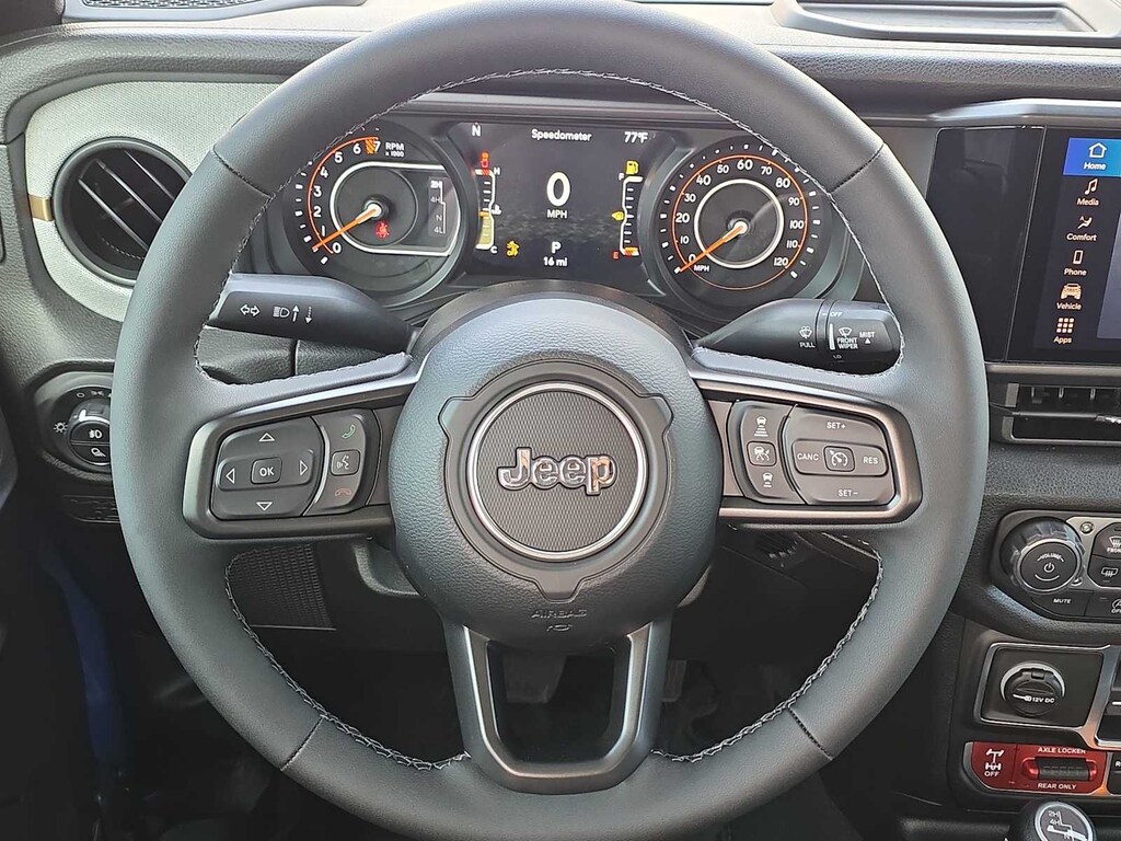 Inside the Willys cabin, our Convenience Packs heated cloth front seats, heated wrapped steering wheel, and remote-start system are at your service for rewarding comfort. They complement automatic climate control and modern technology for making the most of each trip. Highlights include a 12.3-inch touchscreen, a 7-inch driver display, an eight-speaker sound system, voice control, and smart connectivity with Apple CarPlay, Android Auto, Bluetooth, and WiFi/Alexa compatibility.