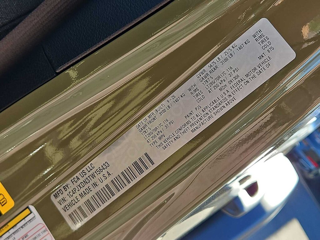 This Jeep comes with:Convenience Group (2-Door Passive Entry, Front Door Locks, Air Conditioning with Auto Temp Control, Air Filtering, Cluster 7.0 TFT Color Display, Emergency/Assistance Call, Heated Front Seats, Heated Steering Wheel, and Universal Garage Door Opener), Quick Order Package 22W Willys (4-Wheel Drive Swing Gate Decal, 7 and 4 Pin Wiring Harness, Advanced Brake Assist, Automatic Headlamps, Auxiliary Switches, Black Grille with Gloss Black Rings, Class II Receiver Hitch, Conventional Differential Front Axle, Corning Gorilla Glass, Dana M210 Wide HD Tube Front Axle, Dana M220 Wide Rear Axle, Daytime Running Lamps LED Accents, Deep Tint Sunscreen Windows, E-Locker Rear Axle, Enhanced Adaptive Cruise Control, Front LED Fog Lamps, Full Speed Forward Collision Warning Plus, Injection Molded Black Rear Bumper, LED Premium Reflector Headlamps, Mold in Color Bumper with Gloss Black, Molded in Color Rubicon Highline Flare, MOPAR All-Weather Floor Mats, Off-Road Plus Mode, Power Heated Mirrors, Premium Wrapped Steering Wheel, Security Alarm, Sun Visors with Illuminated Vanity Mirrors, Wheels: 17 x 7.5 Painted Black, Willys Suspension, and Willys Hood Decal), Safety Group (Auto High Beam Headlamp Control, Blind Spot and Cross Path Detection, LED Taillamps, and ParkSense Rear Park Assist System), Steel Power Dome Hood Package (Power Dome Dual Vented Hood), 12.3 Touchscreen Display, 4-Wheel Disc Brakes, 4G LTE Wi-Fi Hot Spot, 8 Speakers, ABS brakes, Air Conditioning, AM/FM radio: SiriusXM with 360L, Apple CarPlay, Apple CarPlay/Android Auto, Aux Battery, Black 3-Piece Hard Top, Brake assist, Compass, Connectivity - US/Canada, Delay-off headlights, Driver door bin, Driver vanity mirror, Dual front impact airbags, Dual front side impact airbags, Electronic Stability Control, For More Info, Call 800-643-2112, Freedom Panel Storage Bag, Front anti-roll bar, Front Bucket Seats, Front Center Armrest w/Storage, Front fog lights, Front reading lights, Google Android Auto, Illuminated entry, Integrated Center Stack Radio, Integrated roll-over protection, Jeep Trail Rated Kit, Low tire pressure warning, Manufacture Statement of Origin, No Soft Top, Non-Lock Fuel Cap Without Discriminator, Normal Duty Suspension, Occupant sensing airbag, Outside temperature display, Overhead airbag, Panic alarm, ParkView Rear Back-Up Camera, Passenger door bin, Passenger vanity mirror, Power steering, Power windows, Radio data system, Radio: Uconnect 5 with 12.3 Display, Rear anti-roll bar, Rear reading lights, Rear Window Defroster, Rear Window Wiper/Washer, Remote keyless entry, SiriusXM Radio Service, SiriusXM with 360L, Speed control, Split folding rear seat, Steering wheel mounted audio controls, Stop-Start Dual Battery System, Tachometer, Telescoping steering wheel, Tilt steering wheel, Traction control, Trip computer, Variably intermittent wipers, and Wheels: 17 x 7.5 Black Steel Styled. Prices do not include Protection Package + includes Vehicle Tint at $599, Door Edge Guards at $399, Wheel Locks at $199, PermaPlate at $700, LoJack at $1,199 and Etch at $899. Price does not include $699 Dealer Documentation Fee, taxes, and license fee. Price includes: $1000 - 2026 West BC Conquest Bonus Cash. Exp. 02/02/2026 $1500 - 2026 National Select Inventory Bonus Cash . Exp. 01/04/2027
