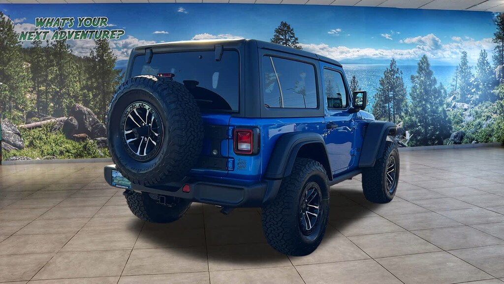 QUICK ORDER PACKAGE 22W WILLYS 2.0L I4 DOHC DI Turbo Engine w/ESS, 8-Speed Automatic 850RE Transmission, 7 & 4 Pin Wiring Harness, Conventional Differential Front Axle, 4-Wheel Drive Swing Gate Decal, Black Grille, Injection Molded Black Rear Bumper, Dana M210 Wide HD Tube Front Axle, Daytime Running Lamps LED Accents, Front LED Fog Lamps, LED Premium Reflector Headlamps, E-Locker Rear Axle, Corning Gorilla Glass, Security Alarm, Class II Receiver Hitch, Mold In Color Bumper w/Gloss Black, Advanced Brake Assist, Automatic Headlamps, Off-Road Plus Mode, Willys Hood Decal, Full Speed Forward Collision Warning Plus, Rock Protection Sill Rails, Power Heated Mirrors, Enhanced Adaptive Cruise Control, Auxiliary Switches, Dana M220 Wide Rear Axle, Molded in Color Rubicon Highline Flare, Premium, XTREME 35 TIRE PACKAGE LT315/70R17C 113/110S Tires, Dana M220 Wide Full Floating Rear Axle, Wheel Flare Extensions, MOPAR Tire Relocation Kit, 17 x 8 Machined Wheels w/Black Pockets, Conventional Differential Front Axle, 5,650 lbs GVWR, 4.56 Rear Axle Ratio, Injection Molded Black Rear Bumper, Delete 4-Wheel Drive Swing Gate Decal, 35 Tire Suspension, MOPAR Hinge-Gate Reinforcement, MOPAR Jack Spacer, Molded in Color Rubicon Highline Flare, 8-SPEED AUTOMATIC 850RE TRANSMISSION Adaptive Cruise Control w/Stop, Anti-Lock 4-Wheel Disc Brakes, Selec-Speed Control, BLACK 3-PIECE HARD TOP Freedom Panel Storage Bag, Rear Window Defroster, Rear Window Wiper/Washer, 2.0L I4 DOHC DI TURBO ENGINE W/ESS. Jeep Willys with Hydro Blue Pearlcoat exterior and Black interior features a 4 Cylinder Engine with 270 HP at 5250 RPM*.