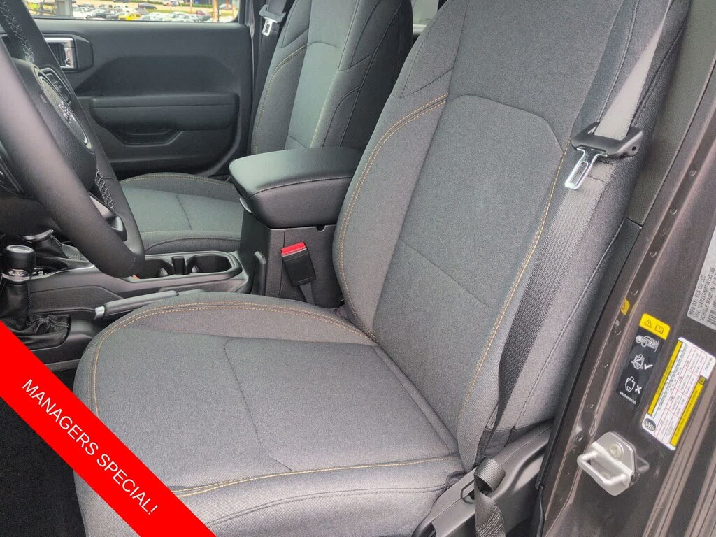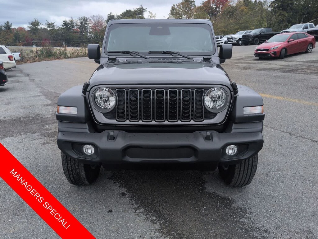 Wrangler Sport S is nicely equipped with Convenience Group (2-Door Passive Entry, Front Door Locks, Air Conditioning with Auto Temp Control, Air Filtering, Cluster 7.0 TFT Color Display, Emergency/Assistance Call, Heated Front Seats, Heated Steering Wheel, and Universal Garage Door Opener), Quick Order Package 22S Sport S (Advanced Brake Assist, Automatic Headlamps, Corning Gorilla Glass, Deep Tint Sunscreen Windows, Enhanced Adaptive Cruise Control, Full Speed Forward Collision Warning Plus, Power Heated Mirrors, Premium Wrapped Steering Wheel, Security Alarm, Sun Visors with Illuminated Vanity Mirrors, and Wheels: 17 x 7.5 Gray), 12.3 Touchscreen Display, 3.45 Overall Top Gear Ratio, 4-Wheel Disc Brakes, 4G LTE Wi-Fi Hot Spot, 8 Speakers, ABS brakes, Air Conditioning, Alpine Premium Audio System, AM/FM radio: SiriusXM with 360L, Apple CarPlay, Apple CarPlay/Android Auto, Aux Battery, Black 3-Piece Hard Top, Brake assist, Compass, Connectivity - US/Canada, Delay-off headlights, Driver door bin, Driver vanity mirror, Dual front impact airbags, Dual front side impact airbags, Electronic Stability Control, For More Info, Call 800-643-2112, Freedom Panel Storage Bag, Front anti-roll bar, Front Bucket Seats, Front Center Armrest w/Storage, Front fog lights, Front reading lights, Google Android Auto, Illuminated entry, Integrated Center Stack Radio, Integrated roll-over protection, Low tire pressure warning, No Soft Top, Non-Lock Fuel Cap Without Discriminator, Normal Duty Suspension, Occupant sensing airbag, Outside temperature display, Overhead airbag, Panic alarm, ParkView Rear Back-Up Camera, Passenger door bin, Passenger vanity mirror, Power steering, Power windows, Radio data system, Radio: Uconnect 5 with 12.3 Display, Rear anti-roll bar, Rear reading lights, Rear Window Defroster, Rear Window Wiper/Washer, Remote keyless entry, SiriusXM Radio Service, SiriusXM with 360L, Speed control, Split folding rear seat, Steering wheel mounted audio controls, Stop-Start Dual Battery System, Tachometer, Telescoping steering wheel, Tilt steering wheel, Traction control, Trip computer, Variably intermittent wipers, Wheels: 17 x 7.5 Black Steel Styled, and Wheels: 17 x 7.5 Machined with Black Pockets.