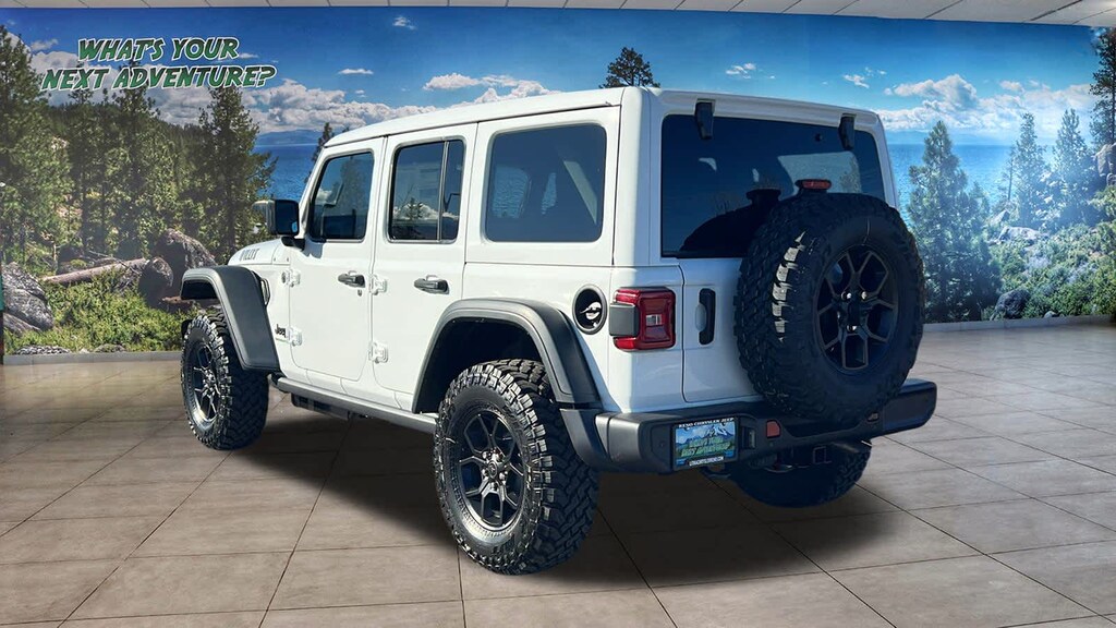 QUICK ORDER PACKAGE 24W WILLYS 3.6L V6 24V VVT UPG I Engine w/ESS, 8-Speed Automatic 850RE Transmission, 7 & 4 Pin Wiring Harness, Conventional Differential Front Axle, 4-Wheel Drive Swing Gate Decal, Black Grille, Injection Molded Black Rear Bumper, Dana M210 Wide HD Tube Front Axle, Daytime Running Lamps LED Accents, Front LED Fog Lamps, LED Premium Reflector Headlamps, E-Locker Rear Axle, Corning Gorilla Glass, Security Alarm, Class II Receiver Hitch, Mold In Color Bumper w/Gloss Black, Advanced Brake Assist, Automatic Headlamps, Off-Road Plus Mode, Willys Hood Decal, Full Speed Forward Collision Warning Plus, Rock Protection Sill Rails, Power Heated Mirrors, Enhanced Adaptive Cruise Control, Auxiliary Switches, Dana M220 Wide Rear Axle, Molded in Color Rubicon Highline Flare, Premium, 8-SPEED AUTOMATIC 850RE TRANSMISSION Adaptive Cruise Control w/Stop, Anti-Lock 4-Wheel Disc Brakes, Integrated Radar Camera Module (IRCM), Dana M200 Rear Axle, Selec-Speed Control, SKY 1-TOUCH POWER TOP Rear Window Defroster, Rear Window Wiper/Washer, Removable Rear Quarter Windows, Power Top Quarter Window Storage Bag, SAFETY GROUP ParkSense Rear Park Assist System, Auto High Beam Headlamp Control, Blind Spot & Cross Path Detection, LED Taillamps, Injection Molded Black Rear Bumper, CONVENIENCE GROUP Emergency/Assistance Call, 2-Door Passive Entry, Front Door Locks, Cluster 7.0 TFT Color Display, Universal Garage Door Opener, Heated Front Seats, Air Conditioning w/Auto Temp Control, Heated Steering Wheel, Air Filtering, ALPINE PREMIUM AUDIO SYSTEM, 3.6L V6 24V VVT UPG I ENGINE W/ESS Engine Oil Cooler (STD). Jeep Willys with Bright White Clearcoat exterior and Black interior features a V6 Cylinder Engine with 285 HP at 6400 RPM*. Approx. Original Base Sticker Price: $56,700*.