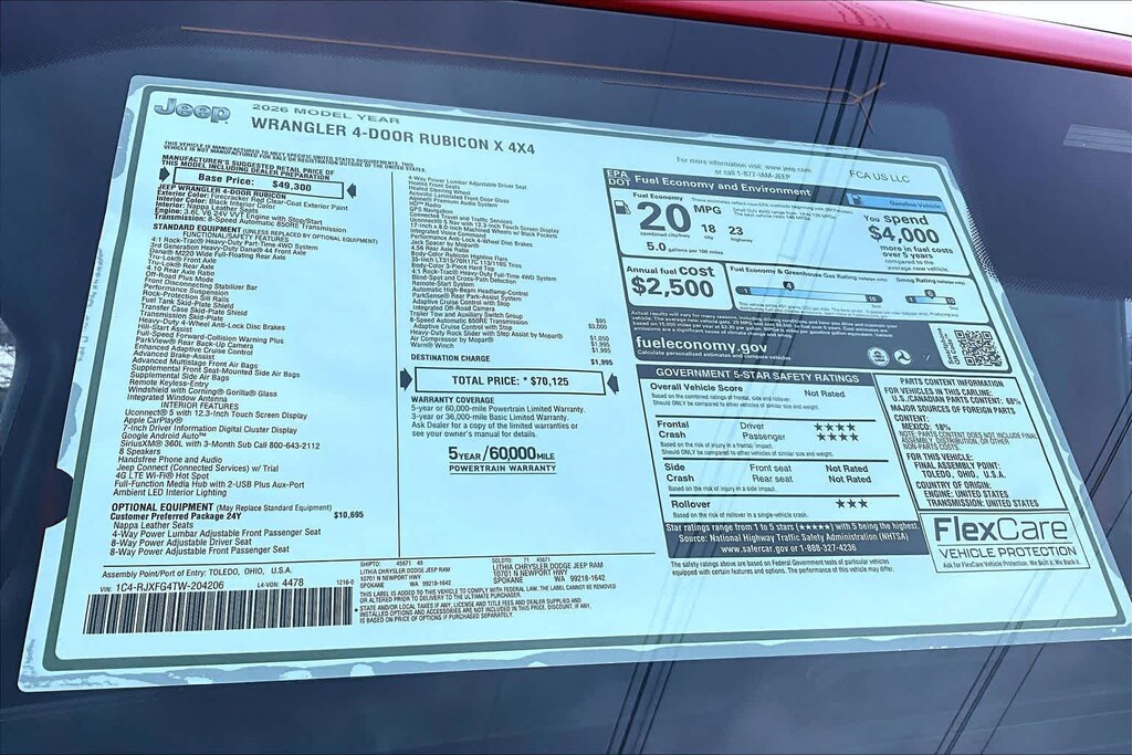 QUICK ORDER PACKAGE 24Y RUBICON X 3.6L V6 24V VVT UPG I Engine w/ESS, 8-Speed Automatic 850RE Transmission, Blind Spot & Cross Path Detection, Rear View Auto Dim Mirror, Heated Front Seats, Integrated Voice Command w/Bluetooth®, Connected Travel & Traffic Services, Acoustic Front Seat Area Carpet, Heated Steering Wheel, Steel Front Bumper, Integrated Off-Road Camera, HD Radio, Freedom Panel Storage Bag, Rear Window Defroster, Rear Window Wiper/Washer, Auto High Beam Headlamp Control, Universal Garage Door Opener, Acoustic Laminated Front Door Glass, ParkSense Rear Park Assist System, Trailer Tow Prep Package, Steel Rear Bumper, 8-SPEED AUTOMATIC 850RE TRANSMISSION LT315/70R17C 113/110S Tires, Remote Start System, Wheel Flare Extensions, 4:1 Rock-Trac HD Full Time 4WD System, MOPAR Tire Relocation Kit, Anti-Lock 4-Wheel Disc Perf Brakes, 17 x 8 Machined Wheels w/Black Pockets, 4.56 Rear Axle Ratio, 35 Tire Suspension, MOPAR Hinge-Gate Reinforcement, MOPAR Jack Spacer, Adaptive Cruise Control w/Stop, Selec-Speed Control, MOPAR HD ROCK SLIDER W/STEP ASSIST, 3.6L V6 24V VVT UPG I ENGINE W/ESS Engine Oil Cooler (STD). Jeep Rubicon X with Firecracker Red Clearcoat exterior and Black interior features a V6 Cylinder Engine with 285 HP at 6400 RPM*.