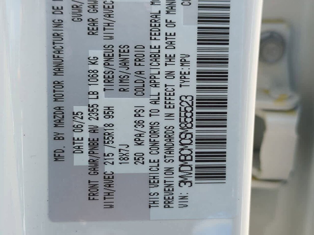 4-Wheel Disc Brakes, 6 Speakers, ABS brakes, Air Conditioning, Alloy wheels, AM/FM radio, AppLink/Apple CarPlay and Android Auto, Auto High-beam Headlights, Automatic temperature control, Brake assist, Bumpers: body-color, Cargo Tray, Compass, Delay-off headlights, Driver door bin, Driver vanity mirror, Dual front impact airbags, Dual front side impact airbags, Electronic Stability Control, Emergency communication system: Mazda Connected Services (3-year trial subscription included), Exterior Parking Camera Rear, Front anti-roll bar, Front Bucket Seats, Front Center Armrest, Front dual zone A/C, Front reading lights, Front wheel independent suspension, Fully automatic headlights, Heated door mirrors, Heated Front Bucket Seats, Heated front seats, High Wall All-Weather Floor Mats, Illuminated entry, Knee airbag, Leather Shift Knob, Leather steering wheel, Leatherette Seat Trim, Low tire pressure warning, MAZDA CONNECT Infotainment System, Memory seat, Occupant sensing airbag, Outside temperature display, Overhead airbag, Overhead console, Panic alarm, Passenger door bin, Passenger vanity mirror, Power door mirrors, Power driver seat, Power moonroof, Power steering, Power windows, Radio data system, Radio: AM/FM Audio System, Rain sensing wipers, Rear seat center armrest, Rear side impact airbag, Rear window defroster, Rear window wiper, Remote keyless entry, Snowflake White Pearl Mica Paint Charge, Speed control, Speed-sensing steering, Split folding rear seat, Spoiler, Steering wheel mounted audio controls, Tachometer, Telescoping steering wheel, Tilt steering wheel, Traction control, Trip computer, Turn signal indicator mirrors, Variably intermittent wipers, Wheel Locks, and Wheels: 18 x 7J Aluminum Alloy. Price includes: $1000 - Customer Cash. Exp. 02/02/2026