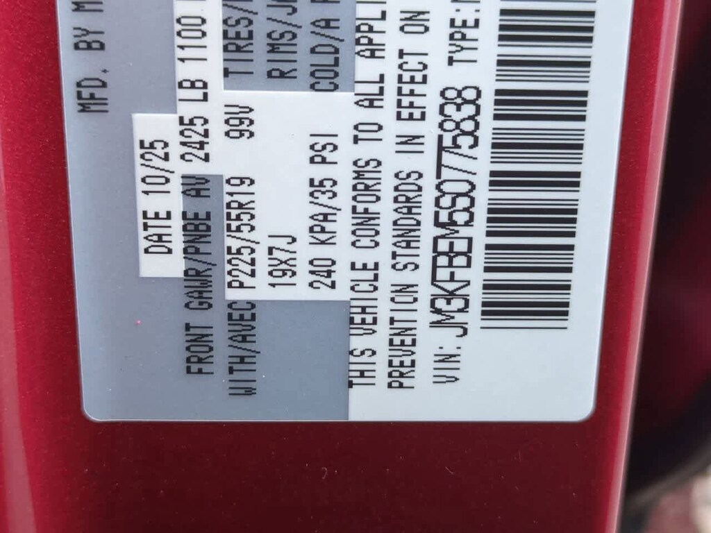 Roof Rails & Cross Bars Package, 10 Speakers, 4-Wheel Disc Brakes, ABS brakes, Air Conditioning, Alloy wheels, AM/FM radio: SiriusXM, AppLink/Apple CarPlay and Android Auto, Auto High-beam Headlights, Auto-dimming Rear-View mirror, Automatic temperature control, Brake assist, Bumpers: body-color, Delay-off headlights, Driver door bin, Driver vanity mirror, Dual front impact airbags, Dual front side impact airbags, E911 Automatic Emergency Notification, Electronic Stability Control, Emergency communication system: MAZDA CONNECT, Four wheel independent suspension, Front anti-roll bar, Front Bucket Seats, Front Center Armrest w/Storage, Front dual zone A/C, Front reading lights, Fully automatic headlights, Garage door transmitter: HomeLink, Heads-Up Display, Heated door mirrors, Heated front seats, Heated rear seats, Heated steering wheel, Heated/Ventilated Front Bucket Seats, Illuminated entry, Infotainment System Voice Command, Leather Seat Trim, Leather Shift Knob, Leather steering wheel, Low tire pressure warning, Memory seat, Multifunction Commander Control, Occupant sensing airbag, Outside temperature display, Overhead airbag, Overhead console, Pandora, Panic alarm, Passenger door bin, Passenger vanity mirror, Power door mirrors, Power driver seat, Power Liftgate, Power moonroof, Power passenger seat, Power steering, Power windows, Radio Broadcast Data System Program Information, Radio data system, Radio: AM/FM/HD Audio System, Rain sensing wipers, Rear anti-roll bar, Rear reading lights, Rear seat center armrest, Rear window defroster, Rear window wiper, Remote keyless entry, SMS Text Msg Audio Delivery & Reply, Soul Red Crystal Metallic Paint, Speed control, Speed-sensing steering, Split folding rear seat, Spoiler, Steering wheel mounted audio controls, Tachometer, Telescoping steering wheel, Tilt steering wheel, Traction control, Trip computer, Turn signal indicator mirrors, Variably intermittent wipers, Ventilated front seats, and Wheels: 19 x 7J Aluminum Alloy. Price includes: $2500 - Customer Cash. Exp. 02/02/2026