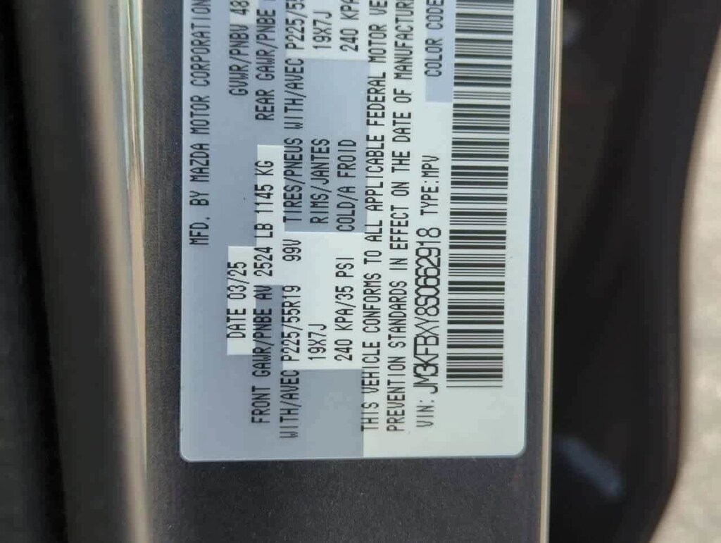 Roof Rails & Cross Bars Package, 10 Speakers, 4-Wheel Disc Brakes, ABS brakes, Air Conditioning, All-Weather Floor Mats, Alloy wheels, AM/FM radio: SiriusXM, AppLink/Apple CarPlay and Android Auto, Auto High-beam Headlights, Auto-dimming Rear-View mirror, Automatic temperature control, Brake assist, Bumpers: body-color, Cargo Net, Cargo Tray, Delay-off headlights, Driver door bin, Driver vanity mirror, Dual front impact airbags, Dual front side impact airbags, E911 Automatic Emergency Notification, Electronic Stability Control, Emergency communication system: MAZDA CONNECT, First Aid Kit, Four wheel independent suspension, Front & Rear Splash Guards, Front anti-roll bar, Front Bucket Seats, Front Center Armrest w/Storage, Front dual zone A/C, Front reading lights, Fully automatic headlights, Garage door transmitter: HomeLink, Genuine wood dashboard insert, Genuine wood door panel insert, Heads-Up Display, Heated door mirrors, Heated front seats, Heated rear seats, Heated steering wheel, Heated/Ventilated Front Bucket Seats, Illuminated entry, Infotainment System Voice Command, Leather Shift Knob, Leather steering wheel, Low tire pressure warning, Machine Gray Metallic Paint, Mazda Navigation System, Memory seat, Multifunction Commander Control, Nappa Leather Seat Trim, Navigation system: MAZDA CONNECT, Occupant sensing airbag, Outside temperature display, Overhead airbag, Overhead console, Pandora, Panic alarm, Passenger door bin, Passenger vanity mirror, Power door mirrors, Power driver seat, Power Liftgate, Power moonroof, Power passenger seat, Power steering, Power windows, Radio Broadcast Data System Program Information, Radio data system, Radio: AM/FM/HD Audio System, Rain sensing wipers, Rear anti-roll bar, Rear reading lights, Rear seat center armrest, Rear window defroster, Rear window wiper, Remote keyless entry, SMS Text Msg Audio Delivery & Reply, Speed control, Speed-sensing steering, Split folding rear seat, Spoiler, Steering wheel mounted audio controls, Tachometer, Telescoping steering wheel, Tilt steering wheel, Traction control, Trip computer, Turn signal indicator mirrors, Variably intermittent wipers, Ventilated front seats, Wheel Locks, and Wheels: 19 x 7J Aluminum Alloy. Price includes: $2500 - Customer Cash. Exp. 02/02/2026