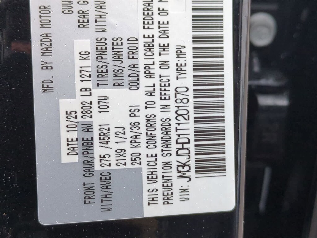 12 Speakers, 4-Wheel Disc Brakes, ABS brakes, Air Conditioning, Alloy wheels, AM/FM radio: SiriusXM, Auto High-beam Headlights, Auto-dimming door mirrors, Auto-dimming Rear-View mirror, Automatic temperature control, Black Cross Bars, Brake assist, Bumpers: body-color, Compass, Delay-off headlights, Driver door bin, Driver vanity mirror, Dual front impact airbags, Dual front side impact airbags, E911 Automatic Emergency Notification, Electronic Stability Control, Emergency communication system: MAZDA CONNECT, Exterior Parking Camera Rear, Four wheel independent suspension, Front anti-roll bar, Front Bucket Seats, Front Center Armrest w/Storage, Front dual zone A/C, Front reading lights, Fully automatic headlights, Garage door transmitter: HomeLink, Heads-Up Display, Heated door mirrors, Heated front seats, Heated rear seats, Heated steering wheel, Heated/Ventilated Front Bucket Seats, Illuminated entry, Infotainment System Voice Command, Knee airbag, Leather Seat Trim, Leather Shift Knob, Leather steering wheel, Low tire pressure warning, Mazda Connected Services, Mazda Online Navigation, Memory seat, Navigation system: MAZDA CONNECT, Occupant sensing airbag, Outside temperature display, Overhead airbag, Overhead console, Panic alarm, Passenger door bin, Passenger vanity mirror, Power door mirrors, Power driver seat, Power Liftgate, Power moonroof, Power passenger seat, Power steering, Power windows, Premium Carpet Floor Mats, Radio Broadcast Data System Program Information, Radio data system, Radio: AM/FM with Bose Premium Audio Sound System, Rain sensing wipers, Rear air conditioning, Rear anti-roll bar, Rear reading lights, Rear seat center armrest, Rear window defroster, Rear window wiper, Remote keyless entry, SMS Text Message Audio Delivery and Reply, Speed control, Speed-sensing steering, Split folding rear seat, Spoiler, Steering wheel mounted audio controls, Tachometer, Telescoping steering wheel, Tilt steering wheel, Traction control, Trip computer, Variably intermittent wipers, Ventilated front seats, and Wheels: 21 x 9.5J Aluminum Alloy. Price includes: $2000 - Customer Cash. Exp. 03/02/2026