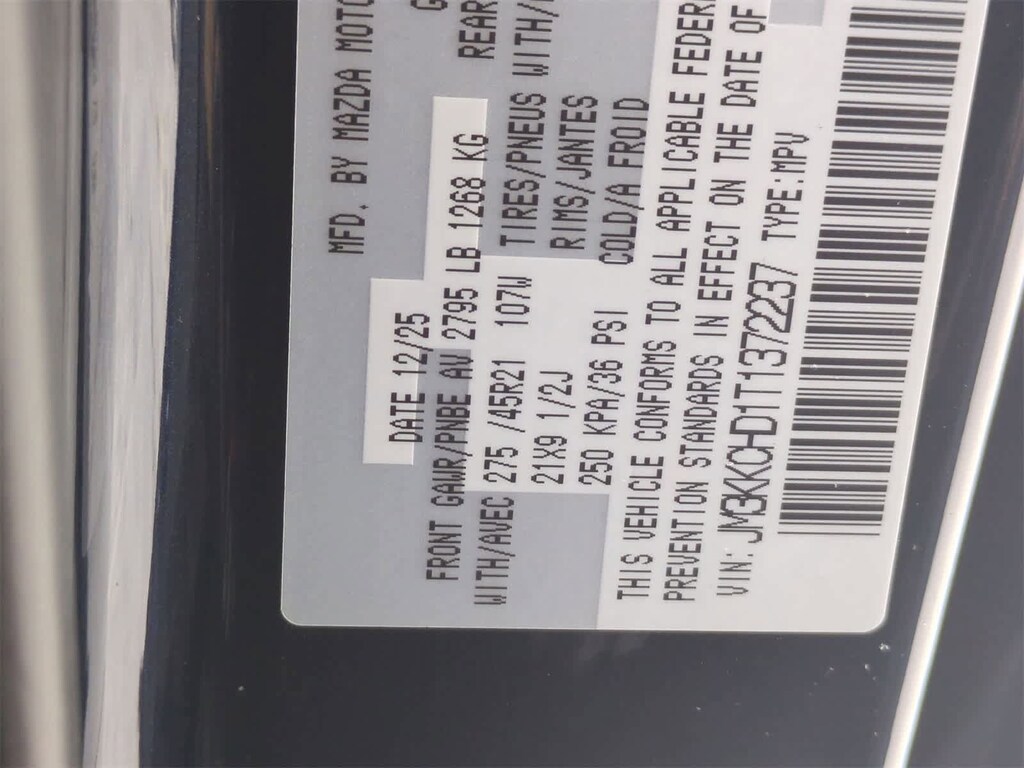 12 Speakers, 2nd-Row Captains Chairs, 3rd row seats: bench, 4-Wheel Disc Brakes, ABS brakes, Air Conditioning, Alloy wheels, AM/FM radio: SiriusXM, Auto High-beam Headlights, Auto-dimming door mirrors, Auto-dimming Rear-View mirror, Automatic temperature control, Brake assist, Bumpers: body-color, Compass, Cross Bars - Black, Delay-off headlights, Driver door bin, Driver vanity mirror, Dual front impact airbags, Dual front side impact airbags, E911 Automatic Emergency Notification, Electronic Stability Control, Emergency communication system: MAZDA CONNECT, Exterior Parking Camera Rear, Four wheel independent suspension, Front anti-roll bar, Front Bucket Seats, Front Center Armrest w/Storage, Front dual zone A/C, Front reading lights, Fully automatic headlights, Garage door transmitter: HomeLink, Heads-Up Display, Heated door mirrors, Heated front seats, Heated rear seats, Heated steering wheel, Heated/Ventilated Front Bucket Seats, Illuminated entry, Infotainment System Voice Command, Knee airbag, Leather Seat Trim, Leather Shift Knob, Leather steering wheel, Low tire pressure warning, Mazda Connected Services, Mazda Online Navigation, Memory seat, Navigation system: MAZDA CONNECT, Occupant sensing airbag, Outside temperature display, Overhead airbag, Overhead console, Panic alarm, Passenger door bin, Passenger vanity mirror, Power door mirrors, Power driver seat, Power Liftgate, Power moonroof, Power passenger seat, Power steering, Power windows, Radio Broadcast Data System Program Information, Radio data system, Radio: : AM/FM w/HD/Bose 12-Speaker Sound System, Rain sensing wipers, Rear air conditioning, Rear anti-roll bar, Rear reading lights, Rear seat center armrest, Rear window defroster, Rear window wiper, Remote keyless entry, SMS Text Msg Audio Delivery and Reply, Speed control, Speed-sensing steering, Split folding rear seat, Spoiler, Steering wheel mounted audio controls, Tachometer, Telescoping steering wheel, Tilt steering wheel, Traction control, Trip computer, Turn signal indicator mirrors, Variably intermittent wipers, Ventilated front seats, and Wheels: 21 x 9.5J Aluminum Alloy with Black Metal Finish. Price includes: $2000 - Customer Cash. Exp. 03/02/2026