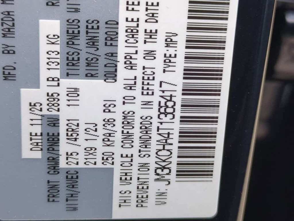 2.5L 4-Cylinder, 12 Speakers, 2nd-Row Captains Chairs, 3rd row seats: bench, 4-Wheel Disc Brakes, ABS brakes, Air Conditioning, Alloy wheels, AM/FM radio: SiriusXM, Auto High-beam Headlights, Auto-dimming door mirrors, Auto-dimming Rear-View mirror, Automatic temperature control, Brake assist, Bumpers: body-color, Cargo Blocks, Compass, Delay-off headlights, Digital Rearview Mirror w/HomeLink, Driver door bin, Driver vanity mirror, Dual front impact airbags, Dual front side impact airbags, E911 Automatic Emergency Notification, Electronic Stability Control, Emergency communication system: MAZDA CONNECT, Exterior Parking Camera Rear, Four wheel independent suspension, Front anti-roll bar, Front Bucket Seats, Front Center Armrest w/Storage, Front dual zone A/C, Front reading lights, Fully automatic headlights, Garage door transmitter: HomeLink, Heads-Up Display, Heated door mirrors, Heated front seats, Heated rear seats, Heated steering wheel, Heated/Ventilated Front Bucket Seats, Illuminated entry, Infotainment System Voice Command, Knee airbag, Leather Seat Trim, Leather Shift Knob, Leather steering wheel, Low tire pressure warning, Mazda Connected Services, Mazda Online Navigation, Memory seat, Navigation system: Mazda Online Navigation, Occupant sensing airbag, Outside temperature display, Overhead airbag, Overhead console, Panic alarm, Passenger door bin, Passenger vanity mirror, Power door mirrors, Power driver seat, Power Liftgate, Power moonroof, Power passenger seat, Power steering, Power windows, Radio Broadcast Data System Program Information, Radio data system, Radio: AM/FM w/HD/Bose 12-Speaker Sound System, Rain sensing wipers, Rear air conditioning, Rear anti-roll bar, Rear reading lights, Rear seat center armrest, Rear window defroster, Rear window wiper, Remote keyless entry, SMS Text Msg Audio Delivery & Reply, Speed control, Speed-sensing steering, Split folding rear seat, Spoiler, Steering wheel mounted audio controls, Tachometer, Telescoping steering wheel, Tilt steering wheel, Traction control, Trip computer, Turn signal indicator mirrors, Variably intermittent wipers, Ventilated front seats, and Wheels: 21 x 9.5J Black Metallic Aluminum Alloy. Price includes: $1500 - Customer Cash. Exp. 02/02/2026