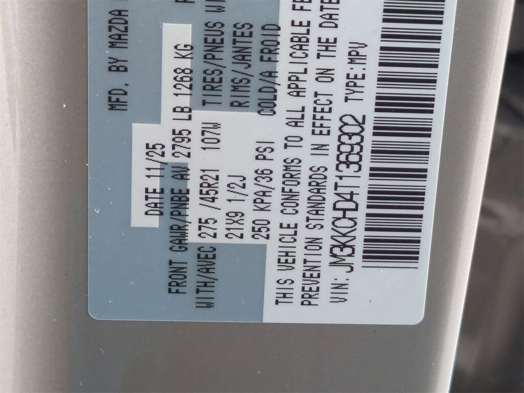 12 Speakers, 3rd row seats: bench, 4-Wheel Disc Brakes, ABS brakes, Air Conditioning, Alloy wheels, AM/FM radio: SiriusXM, Auto High-beam Headlights, Auto-dimming door mirrors, Auto-dimming Rear-View mirror, Automatic temperature control, Brake assist, Bumpers: body-color, Cargo Net, Cargo Tray with Seatback Protection - Captain Chairs, Compass, Delay-off headlights, Driver door bin, Driver vanity mirror, Dual front impact airbags, Dual front side impact airbags, E911 Automatic Emergency Notification, Electronic Stability Control, Emergency communication system: MAZDA CONNECT, Exterior Parking Camera Rear, Four wheel independent suspension, Front anti-roll bar, Front Bucket Seats, Front Center Armrest w/Storage, Front dual zone A/C, Front reading lights, Fully automatic headlights, Garage door transmitter: HomeLink, Heads-Up Display, Heated door mirrors, Heated front seats, Heated rear seats, Heated steering wheel, Heated/Ventilated Front Bucket Seats, Illuminated entry, Infotainment System Voice Command, Knee airbag, Leather Seat Trim, Leather Shift Knob, Leather steering wheel, Low tire pressure warning, Mazda Connected Services, Mazda Online Navigation, Memory seat, Navigation system: MAZDA CONNECT, Occupant sensing airbag, Outside temperature display, Overhead airbag, Overhead console, Panic alarm, Passenger door bin, Passenger vanity mirror, Power door mirrors, Power driver seat, Power Liftgate, Power moonroof, Power passenger seat, Power steering, Power windows, Radio Broadcast Data System Program Information, Radio data system, Radio: : AM/FM w/HD/Bose 12-Speaker Sound System, Rain sensing wipers, Rear air conditioning, Rear anti-roll bar, Rear reading lights, Rear seat center armrest, Rear window defroster, Rear window wiper, Remote keyless entry, SMS Text Msg Audio Delivery and Reply, Speed control, Speed-sensing steering, Split folding rear seat, Spoiler, Steering wheel mounted audio controls, Tachometer, Telescoping steering wheel, Tilt steering wheel, Traction control, Trip computer, Turn signal indicator mirrors, Variably intermittent wipers, Ventilated front seats, and Wheels: 21 x 9.5J Aluminum Alloy with Black Metal Finish. Price includes: $2000 - Customer Cash. Exp. 03/02/2026