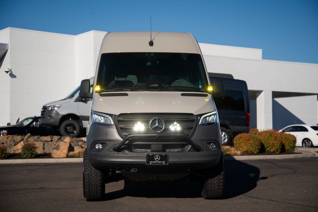 This 2025 Mercedes-Benz Sprinter 2500 Cargo 144 WB 4MATIC® has been highly upfitted with the Agile Off-Road RIP Kit. This includes OFF ROAD HOOD STRUTS, OFF ROAD PUSH BARS, PUSHBAR LIGHT BRACKET, BAJA LIGHTS, COWL LIGHTS, DIFF COVER, ANTI-SHEER SHOCKS, OFF ROAD SKID PLATES, WHEELS, AND TIRES.