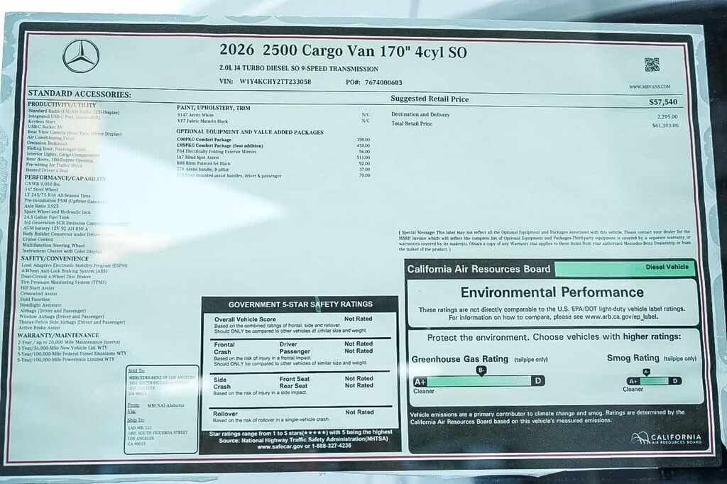 Arctic White 2026 Mercedes-Benz Sprinter 2500 Cargo 170 WB High Roof RWD 9-Speed Automatic 2.0L 4-Cylinder