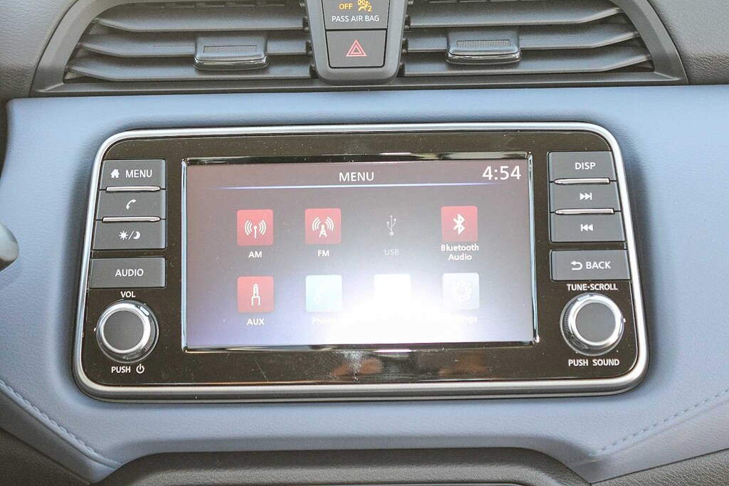 Back-Up Camera, iPod/MP3 Input, Bluetooth®, Aluminum Wheels, Keyless Start, Apple CarPlay®, Smart Device Integration, Cross-Traffic Alert, Blind Spot Monitor. MP3 Player, Keyless Entry, Remote Trunk Release, Child Safety Locks, Steering Wheel Controls. Nissan SV with Aspen White Tricoat exterior and Graphite interior features a 4 Cylinder Engine with 122 HP at 6000 RPM*.