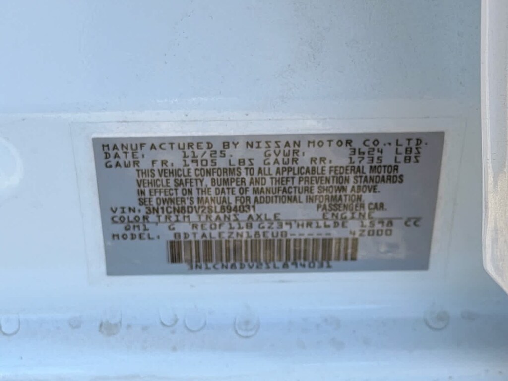 Trunk Package (Shopping Bag Hooks and Trunk Net), 15 Steel Wheels w/Full Wheel Covers, 4 Speakers, ABS brakes, Air Conditioning, AM/FM radio, Auto High-beam Headlights, Brake assist, Bumpers: body-color, Carpeted Floor Mats, Cloth Seat Trim, Delay-off headlights, Driver door bin, Driver vanity mirror, Dual front impact airbags, Dual front side impact airbags, Electronic Stability Control, Front anti-roll bar, Front Bucket Seats, Front reading lights, Front wheel independent suspension, Fully automatic headlights, Illuminated entry, Knee airbag, Low tire pressure warning, Occupant sensing airbag, Outside temperature display, Overhead airbag, Panic alarm, Passenger door bin, Passenger vanity mirror, Power door mirrors, Power steering, Power windows, Radio data system, Radio: AM/FM Audio System, Rear Parking Sensors, Rear side impact airbag, Rear window defroster, Speed control, Splash Guards, Steering wheel mounted audio controls, Tachometer, Telescoping steering wheel, Tilt steering wheel, Traction control, Trip computer, and Variably intermittent wipers. Price includes: $750 - Nissan MY25 Bonus Cash. Exp. 03/02/2026