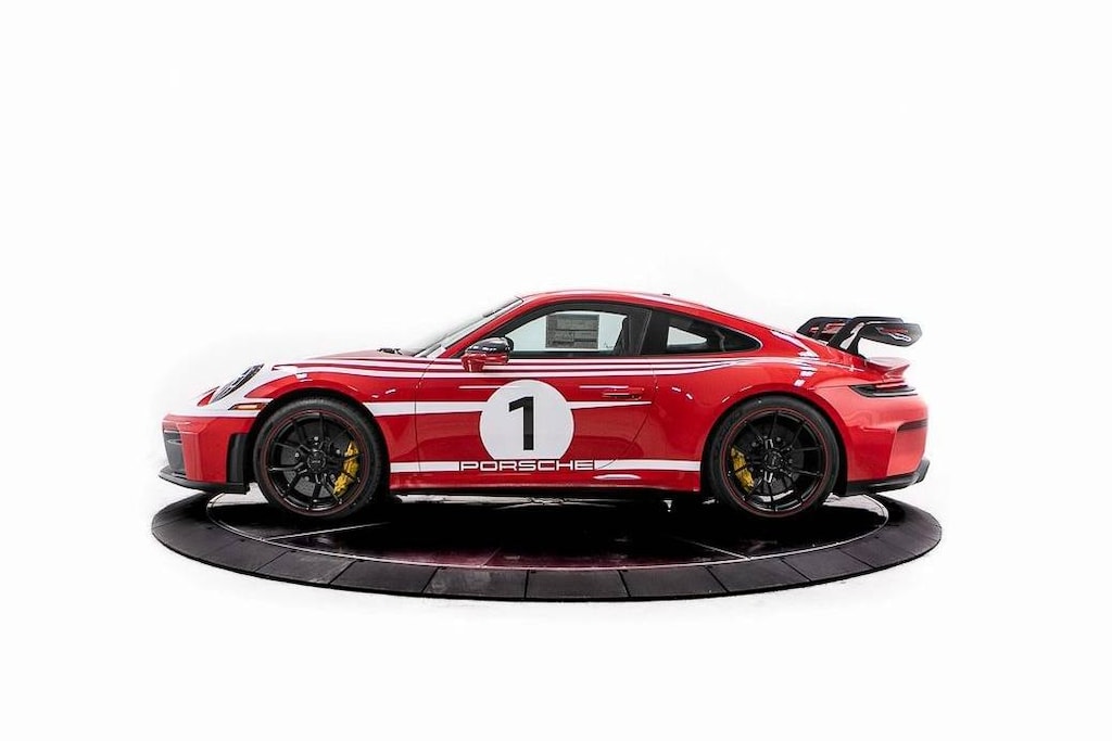 Guards Red 2026 Porsche 911 GT3 RWD 4.0L H6 DOHC 24V LEV3-LEV160 502hp 18-Way Adaptive Sport Seats Plus, 4-Way Sport Seats Plus, 4-Wheel Disc Brakes, 8 Speakers, 911 Design Wrap, ABS brakes, Adaptive suspension, Air Conditioning, Alloy wheels, Ambient Lighting, Automatic temperature control, BORN IN FLACHT Under Door Puddle Light Projectors, BOSE Surround Sound System, Brake assist, Bumpers: body-color, Chrono Package, Chrono Stopwatch Dial in Guards Red, Delay-off headlights, Driver door bin, Driver vanity mirror, Dual front impact airbags, Dual front side impact airbags, Electronic Stability Control, Emergency communication system, Exclusive Design Fuel Cap, Exclusive Design Taillights, Exterior Parking Camera Rear, Four wheel independent suspension, Front Air Intake Grille with Weissach Package Logo, Front anti-roll bar, Front Axle Lift System, Front Bucket Seats, Front Center Armrest, Front dual zone A/C, Front Lid and Roof in Exterior Colour, Front reading lights, Fully automatic headlights, Garage door transmitter: HomeLink, GT Sport Steering Wheel in Leather, HD-Matrix Design LED Headlights in Black, Heated door mirrors, Heated front seats, Illuminated Bespoke Matte Carbon Fiber Door Sill Guards, Illuminated entry, Ionizer, Leather/Race-Tex Seat Trim, Low tire pressure warning, Navigation system: Porsche Communication Management (PCM), Occupant sensing airbag, Outside temperature display, Overhead airbag, Overhead console, ParkAssist Rear, Passenger door bin, Passenger vanity mirror, Porsche Ceramic Composite Brake, Porsche Communication Management, Power door mirrors, Power driver seat, Power passenger seat, Power steering, Power windows, Preparation For Front and Rear Porsche Dashcam, Radio data system, Rear anti-roll bar, Rear fog lights, Rear window defroster, Remote keyless entry, Seat Belts in Guards Red, Security system, Sound Package Plus, Speed control, Speed-sensing steering, Spoiler, Sport steering wheel, Steering wheel mounted audio controls, Storage Net in Passenger Footwell, Tachometer, Telescoping steering wheel, Tilt steering wheel, Traction control, Trip computer, Variably intermittent wipers, Weissach Package Logo on Rear Wing Endplates, Wheels Painted in Satin Black with Guards Red Outer Lip, Wheels: 20 Front/21 Rear 911 GT3.