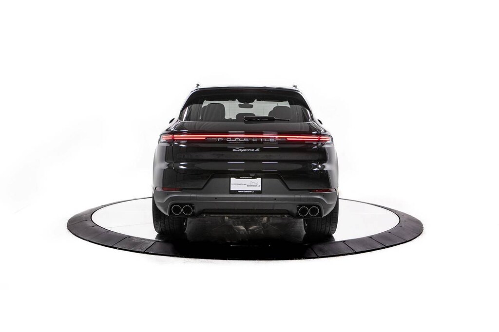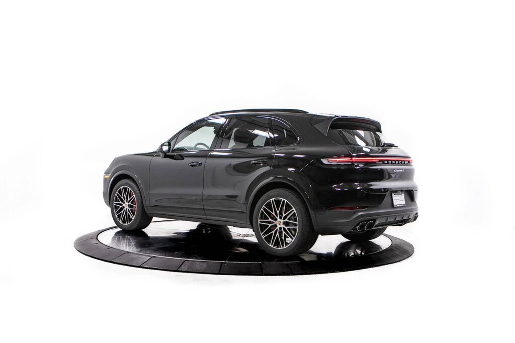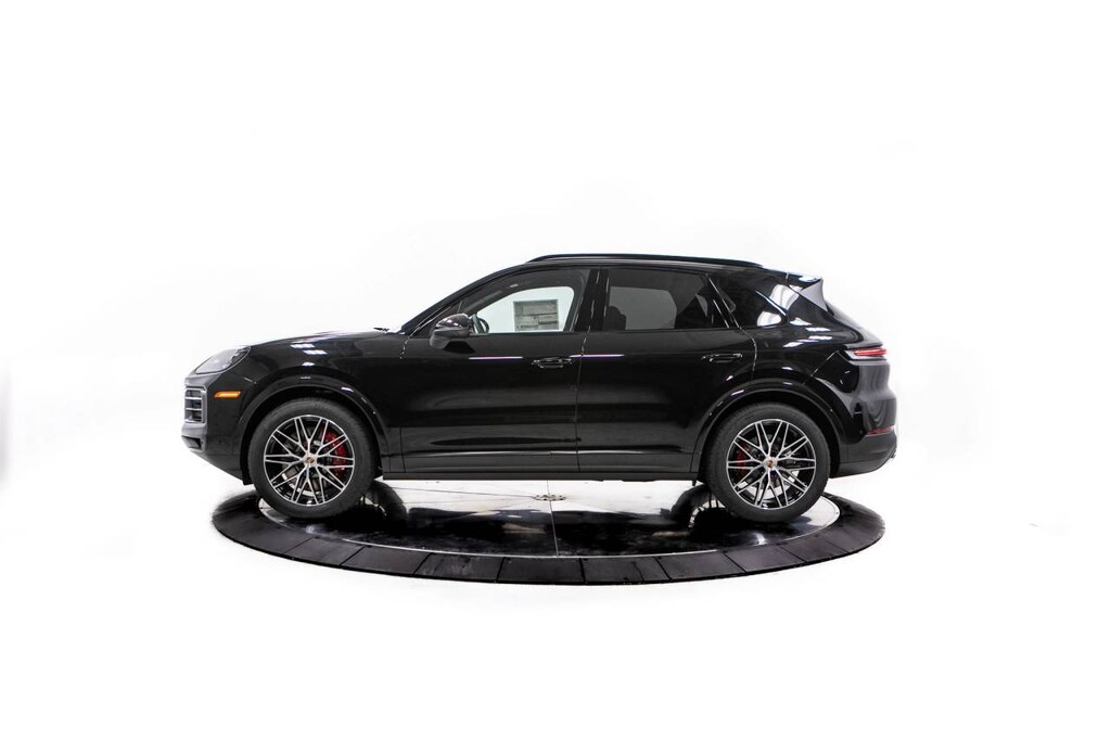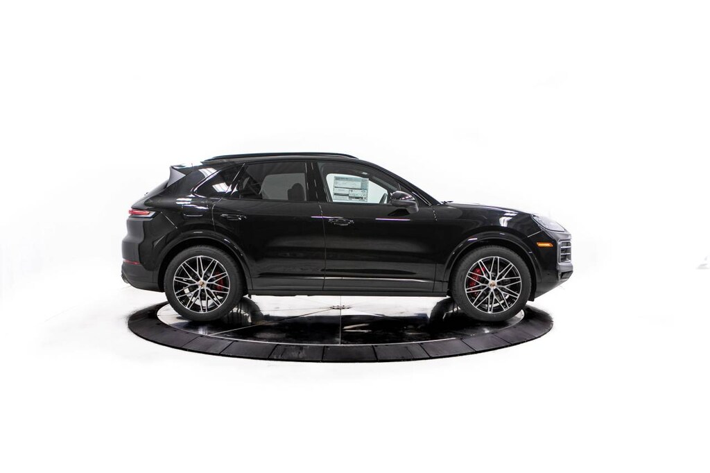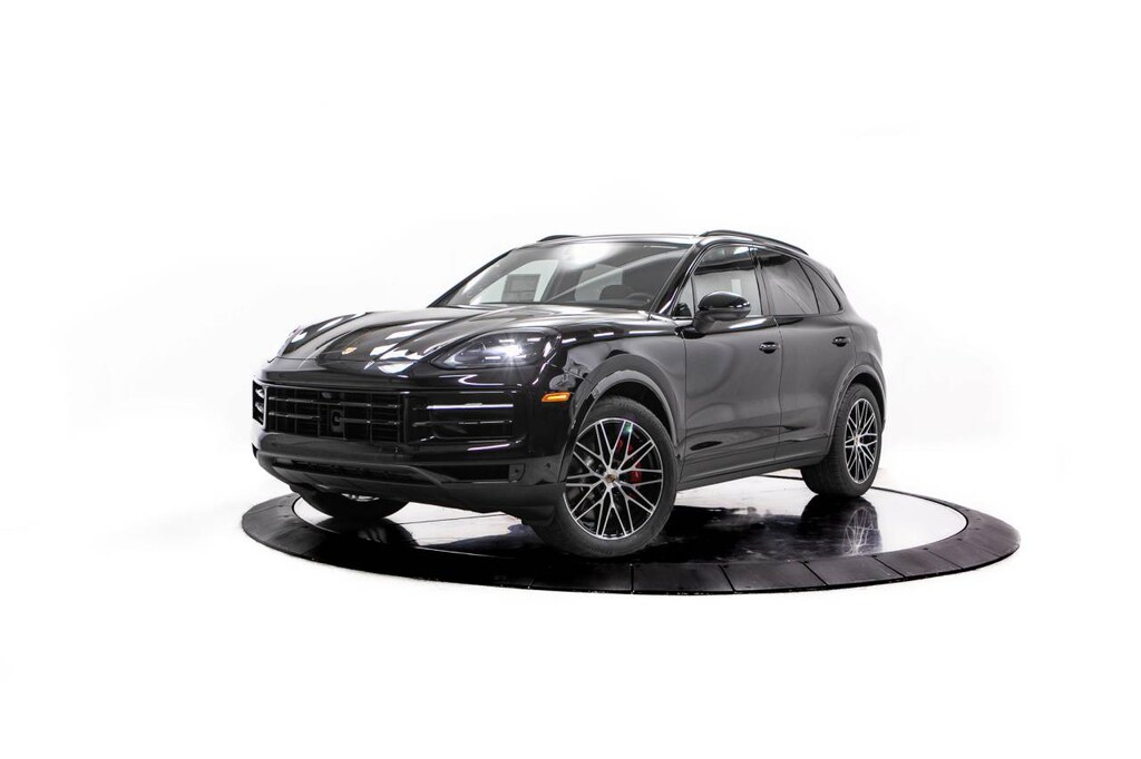 Black 2026 Porsche Cayenne S AWD 8-Speed Automatic with Tiptronic V8 Black Leather, 10 Speakers, 4-Wheel Disc Brakes, 8-Way Power Seats, ABS brakes, Adaptive Cruise Control with Lane Keep Assist (LKA), Adaptive suspension, Air Conditioning, Air Quality System, Alloy wheels, AM/FM radio: SiriusXM w/360L, Apple CarPlay & Android Auto, Artificial Leather Seat Trim, Audio memory, Auto-dimming door mirrors, Auto-dimming Rear-View mirror, Automatic temperature control, BOSE Surround Sound System, Brake assist, Bumpers: body-color, Compass, Delay-off headlights, Driver door bin, Driver vanity mirror, Dual front impact airbags, Dual front side impact airbags, Electronic Stability Control, Exterior Parking Camera Rear, Four wheel independent suspension, Front anti-roll bar, Front Bucket Seats, Front Center Armrest, Front dual zone A/C, Front reading lights, Fully automatic headlights, Garage door transmitter: HomeLink, Heated door mirrors, Heated front seats, Heated steering wheel, HVAC memory, Illuminated entry, Knee airbag, Leather steering wheel, Low tire pressure warning, Memory seat, Navigation System, Occupant sensing airbag, Outside temperature display, Overhead airbag, Overhead console, Panic alarm, Panoramic Roof System, Passenger door bin, Passenger vanity mirror, Porsche Communication Management, Power door mirrors, Power driver seat, Power Liftgate, Power passenger seat, Power steering, Power windows, Premium Package, Radio data system, Rain sensing wipers, Rear anti-roll bar, Rear fog lights, Rear Heated Seats, Rear reading lights, Rear seat center armrest, Rear side impact airbag, Rear window defroster, Rear window wiper, Remote keyless entry, Roof Rails in Black Aluminum Finish, Security system, Speed control, Speed-sensing steering, Split folding rear seat, Spoiler, Sport Tailpipes in Dark Bronze, Steering wheel mounted audio controls, Tachometer, Telescoping steering wheel, Tilt steering wheel, Traction control, Trip computer, Turn signal indicator mirrors, Variably intermittent wipers, Voltmeter, Wheels: 20 Cayenne S, Wheels: 21 RS Spyder Design, Window Trim in High Gloss Black, Black Leather.