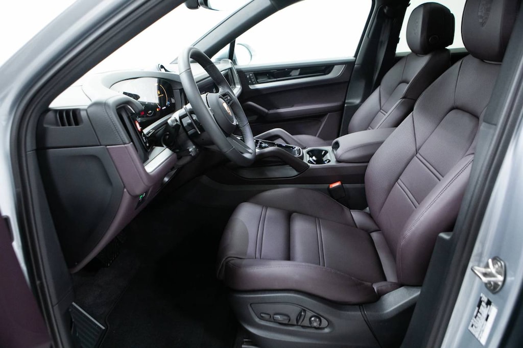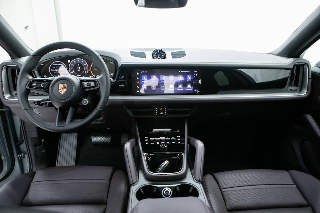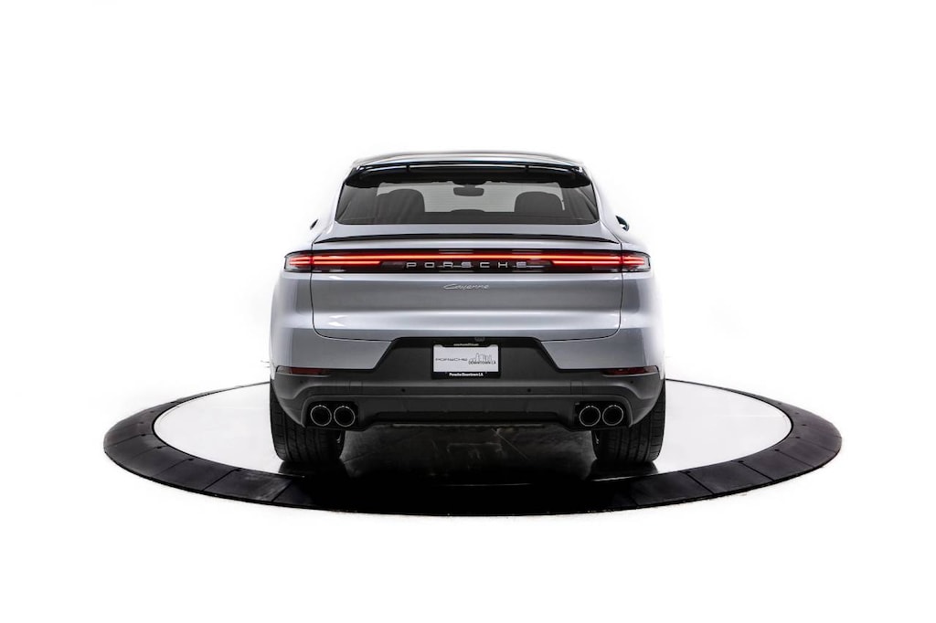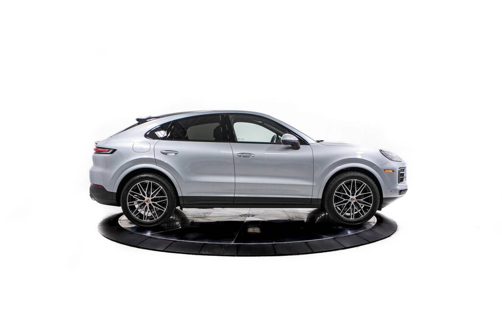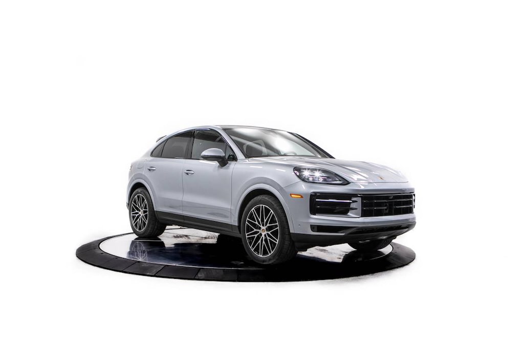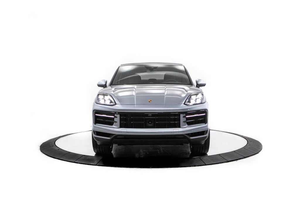 Silver 2026 Porsche Cayenne Coupe AWD 8-Speed Automatic with Tiptronic 3.0L V6 10 Speakers, 14-Way Power Seats with Comfort Memory, 4-Wheel Disc Brakes, 4-Zone Climate Control, 8-Way Sport Seats, ABS brakes, Adaptive Cruise Control with Lane Keep Assist (LKA), Adaptive suspension, Air Conditioning, Alloy wheels, AM/FM radio: SiriusXM w/360L, Apple CarPlay & Android Auto, Audio memory, Auto-dimming door mirrors, Auto-dimming Rear-View mirror, Automatic temperature control, BOSE Surround Sound System, Brake assist, Bumpers: body-color, Compass, Delay-off headlights, Driver door bin, Driver vanity mirror, Dual front impact airbags, Dual front side impact airbags, Electronic Stability Control, Exterior Parking Camera Rear, Four wheel independent suspension, Front anti-roll bar, Front Bucket Seats, Front Center Armrest, Front dual zone A/C, Front reading lights, Front Ventilated Seats, Fully automatic headlights, Garage door transmitter: HomeLink, HD-Matrix Design LED Headlights, Heated door mirrors, Heated front seats, Heated GT Sport Steering Wheel in Leather, Heated steering wheel, HVAC memory, Illuminated entry, Knee airbag, Leather Seat Trim, Leather steering wheel, Low tire pressure warning, Memory seat, Navigation System, Occupant sensing airbag, Outside temperature display, Overhead airbag, Overhead console, Panic alarm, Passenger door bin, Passenger vanity mirror, Porsche Communication Management, Porsche Crest on Front Headrests, Power door mirrors, Power driver seat, Power Liftgate, Power passenger seat, Power steering, Power windows, Premium Package Plus, Radio data system, Rain sensing wipers, Rear anti-roll bar, Rear Comfort Seats (2+1), Rear fog lights, Rear Heated Seats, Rear reading lights, Rear seat center armrest, Rear side impact airbag, Rear window defroster, Remote keyless entry, Roof Spoiler in High Gloss Black, Security system, Speed control, Speed-sensing steering, Split folding rear seat, Spoiler, Sport Tailpipes in Dark Bronze, Steering wheel mounted audio controls, Tachometer, Telescoping steering wheel, Tilt steering wheel, Traction control, Trip computer, Turn signal indicator mirrors, Under Door Puddle Light Projectors, Variably intermittent wipers, Voltmeter, Wheels: 20 Cayenne Design, Wheels: 21 RS Spyder Design.