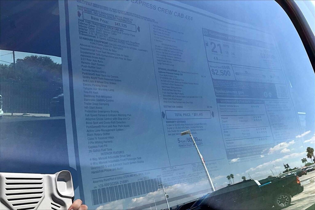 Bright White Clearcoat 2025 Ram 1500 Tradesman 4WD 8-Speed Automatic 3.6L V6 24V VVT FRESH OIL CHANGE, 3.21 Rear Axle Ratio, 4 Way Front Headrests, 4-Wheel Disc Brakes, 40/20/40 Split Bench Seat, 6 Speakers, ABS brakes, Air Conditioning, AM/FM radio, Apple CarPlay/Android Auto, Auto High-beam Headlights, Black Exterior Mirrors, Brake assist, Bridgestone Brand Tires, Compass, Delay-off headlights, Driver door bin, Dual front impact airbags, Dual front side impact airbags, Electronic Stability Control, Exterior Mirrors w/Heating Element, Front anti-roll bar, Front Center Armrest, Front License Plate Bracket, Front reading lights, Front wheel independent suspension, Fully automatic headlights, Heated door mirrors, Heavy Duty Vinyl 40/20/40 Split Bench Seat, Illuminated entry, Low tire pressure warning, Manual Adjust 4-Way Driver Seat, Manual Adjust 4-Way Front Passenger Seat, Manual Folding Exterior Mirrors, Manufacturers Statement of Origin, Occupant sensing airbag, Outside temperature display, Overhead airbag, Overhead console, Panic alarm, ParkView Rear Back-Up Camera, Passenger door bin, Passenger vanity mirror, Power door mirrors, Power steering, Power windows, Radio data system, Radio: Uconnect 5 W w/8.4 Display, RAM Grille Badge - Black, Rear anti-roll bar, Rear step bumper, Remote keyless entry, Speed control, Tachometer, Telescoping steering wheel, Tilt steering wheel, Traction control, Variably intermittent wipers, Voltmeter, Wheels: 18 x 7.5 Steel Painted, Wheels: 20 x 9.0 Aluminum Polished Painted.