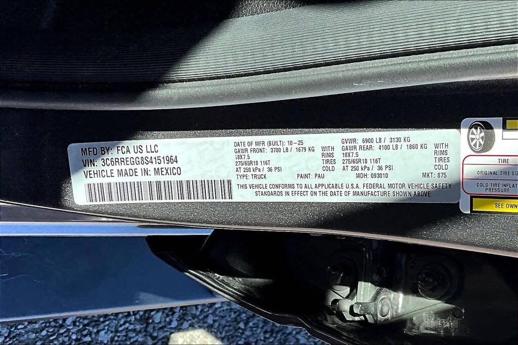Granite Crystal Metallic Clearcoat 2025 Ram 1500 Tradesman RWD 8-Speed Automatic 3.6L V6 24V VVT FRESH OIL CHANGE, 2nd Row In Floor Storage Bins, 3 Rear Seat Head Restraints, 3.21 Rear Axle Ratio, 4 Way Front Headrests, 4-Wheel Disc Brakes, 40/20/40 Split Bench Seat, 6 Speakers, ABS brakes, Air Conditioning, AM/FM radio, Apple CarPlay/Android Auto, Auto High-beam Headlights, Black Exterior Mirrors, Brake assist, Cloth Bench Seat, Compass, Delay-off headlights, Driver door bin, Dual front impact airbags, Dual front side impact airbags, Electronic Stability Control, Exterior Mirrors w/Heating Element, Front & Rear Floor Mats, Front anti-roll bar, Front Center Armrest, Front Center Seat Cushion Storage, Front License Plate Bracket, Front reading lights, Front Seat Back Map Pockets, Front wheel independent suspension, Fully automatic headlights, Heated door mirrors, Heavy Duty Vinyl 40/20/40 Split Bench Seat, Illuminated entry, Low tire pressure warning, Manual Adjust 4-Way Driver Seat, Manual Adjust 4-Way Front Passenger Seat, Manual Folding Exterior Mirrors, Manufacturers Statement of Origin, Occupant sensing airbag, Outside temperature display, Overhead airbag, Overhead console, Panic alarm, ParkView Rear Back-Up Camera, Passenger door bin, Passenger vanity mirror, Power door mirrors, Power steering, Power windows, Quick Order Package 23A Tradesman, Radio data system, Radio: Uconnect 5 W w/8.4 Display, Rear 60/40 Folding Seat, Rear anti-roll bar, Rear Power Sliding Window, Rear step bumper, Remote keyless entry, Seat Parts Module II, SiriusXM Satellite Radio, Speed control, Tachometer, Telescoping steering wheel, Tilt steering wheel, Traction control, Tradesman Level 1 Equipment Group, Variably intermittent wipers, Voltmeter, Wheels: 18 x 7.5 Steel Painted.