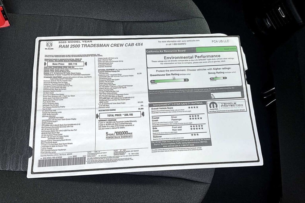 Bright White Clearcoat 2025 Ram 2500 Tradesman 4WD 8-Speed Automatic 6.7L I6 FRESH OIL CHANGE, 115V Auxiliary Front Power Outlet, 12 Touchscreen Display, 2 Way Rear Headrest Seat, 4 Way Front Headrests, 4-Wheel Disc Brakes, 40/20/40 Split Bench Seat, 400W Inverter, 4G LTE Wi-Fi Hot Spot, 6 Speakers, ABS brakes, Air Conditioning, Air Conditioning ATC w/Dual Zone Control, Alexa Built-In, AM/FM radio: SiriusXM, Anti-Spin Differential Rear Axle, Apple CarPlay, Apple CarPlay/Android Auto, Auto-Dimming Rear-View Mirror, Black Exterior Mirrors, Black Wheel Center Hub, Brake assist, Carpet Floor Covering, Clearance Lamps, Cloth 40/20/40 Bench Seat, Compass, Connected Travel & Traffic Services, Connectivity - US/Canada, Delay-off headlights, Disassociated Touchscreen Display, Driver door bin, Dual front impact airbags, Dual front side impact airbags, Electronic Stability Control, Emergency Vehicle Alert System (EVAS), Exterior 115V AC Outlet, Exterior Mirrors Courtesy Lamps, Exterior Mirrors w/Heating Element, Exterior Mirrors w/Supplemental Signals, Front & Rear Floor Mats, Front anti-roll bar, Front Armrest w/Cupholders, Front Center Armrest w/Storage, Front fog lights, Front License Plate Bracket, Front reading lights, Fully automatic headlights, Global Telematics Box Module (TBM), Google Android Auto, GPS Antenna Input, GPS Navigation, HD Radio, Heavy Duty Vinyl 40/20/40 Split Bench Seat, Illuminated entry, Integrated Voice Command w/Bluetooth, Low tire pressure warning, Manual Adjust 4-Way Driver Seat, Manual Adjust 4-Way Front Passenger Seat, Manual Folding Exterior Mirrors, Manual Telescoping Mirrors, Manufacturers Statement of Origin, Mirror Running Lights, Mopar Black Tubular Side Steps, Occupant sensing airbag, Off-Road Info Pages, Outside temperature display, Overhead airbag, Overhead console, Panic alarm, ParkSense Front/Rear Park Assist System, ParkView Rear Back-Up Camera, Passenger door bin, Passenger vanity mirror, Power Adjust Mirrors, Power Adjustable Convex Aux Mirrors, Power Heated Folding Telescope Mirrors, Power steering, Power windows, Quick Order Package 24A Tradesman, Radio data system, Radio: Uconnect 5 Nav w/12.0 Display, Radio: Uconnect 5 w/8.4 Display, Rear anti-roll bar, Rear Folding Seat, Rear Power Sliding Window, Rear step bumper, Rear window defroster, Remote keyless entry, Remote USB Port - Charge Only, Selectable Tire Fill Alert, SiriusXM Radio Service, SiriusXM w/360L, Speed control, Storage Tray, Tachometer, Tilt steering wheel, Tinted Acoustic Windshield Glass, Traction control, Tradesman Level 1 Equipment Group, Trailer Tow Pages, Variably intermittent wipers, Voltmeter, Wheels: 17 x 7.5 Black Steel Styled. Price includes: $2000 - 2025 National Bonus Cash . Exp. 02/02/2026