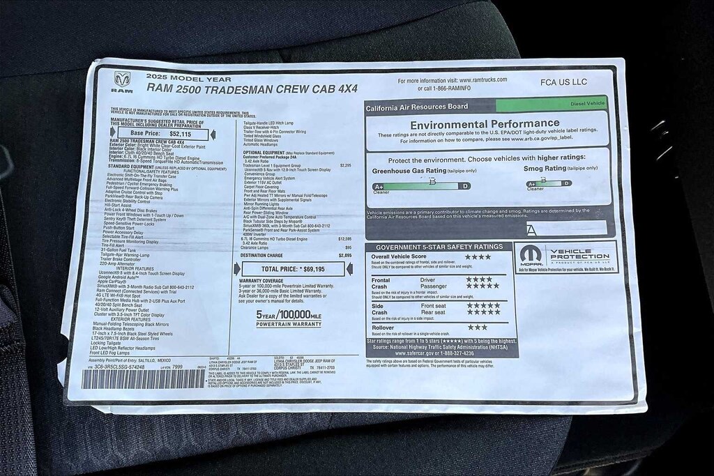 New Price! Bright White Clearcoat 2025 Ram 2500 Tradesman 4WD 8-Speed Automatic 6.7L I6 FRESH OIL CHANGE, 115V Auxiliary Front Power Outlet, 12 Touchscreen Display, 2 Way Rear Headrest Seat, 4 Way Front Headrests, 4-Wheel Disc Brakes, 40/20/40 Split Bench Seat, 400W Inverter, 4G LTE Wi-Fi Hot Spot, 6 Speakers, ABS brakes, Air Conditioning, Air Conditioning ATC w/Dual Zone Control, Alexa Built-In, AM/FM radio: SiriusXM, Anti-Spin Differential Rear Axle, Apple CarPlay, Apple CarPlay/Android Auto, Auto-Dimming Rear-View Mirror, Black Exterior Mirrors, Black Wheel Center Hub, Brake assist, Carpet Floor Covering, Clearance Lamps, Cloth 40/20/40 Bench Seat, Compass, Connected Travel & Traffic Services, Connectivity - US/Canada, Delay-off headlights, Disassociated Touchscreen Display, Driver door bin, Dual front impact airbags, Dual front side impact airbags, Electronic Stability Control, Emergency Vehicle Alert System (EVAS), Exterior 115V AC Outlet, Exterior Mirrors Courtesy Lamps, Exterior Mirrors w/Heating Element, Exterior Mirrors w/Supplemental Signals, Front & Rear Floor Mats, Front anti-roll bar, Front Armrest w/Cupholders, Front Center Armrest w/Storage, Front fog lights, Front License Plate Bracket, Front reading lights, Fully automatic headlights, Global Telematics Box Module (TBM), Google Android Auto, GPS Antenna Input, GPS Navigation, HD Radio, Heavy Duty Vinyl 40/20/40 Split Bench Seat, Illuminated entry, Integrated Voice Command w/Bluetooth, Low tire pressure warning, Manual Adjust 4-Way Driver Seat, Manual Adjust 4-Way Front Passenger Seat, Manual Folding Exterior Mirrors, Manual Telescoping Mirrors, Manufacturers Statement of Origin, Mirror Running Lights, Mopar Black Tubular Side Steps, Occupant sensing airbag, Off-Road Info Pages, Outside temperature display, Overhead airbag, Overhead console, Panic alarm, ParkSense Front/Rear Park Assist System, ParkView Rear Back-Up Camera, Passenger door bin, Passenger vanity mirror, Power Adjust Mirrors, Power Adjustable Convex Aux Mirrors, Power Heated Folding Telescope Mirrors, Power steering, Power windows, Quick Order Package 24A Tradesman, Radio data system, Radio: Uconnect 5 Nav w/12.0 Display, Radio: Uconnect 5 w/8.4 Display, Rear anti-roll bar, Rear Folding Seat, Rear Power Sliding Window, Rear step bumper, Rear window defroster, Remote keyless entry, Remote USB Port - Charge Only, Selectable Tire Fill Alert, SiriusXM Radio Service, SiriusXM w/360L, Speed control, Storage Tray, Tachometer, Tilt steering wheel, Tinted Acoustic Windshield Glass, Traction control, Tradesman Level 1 Equipment Group, Trailer Tow Pages, Variably intermittent wipers, Voltmeter, Wheels: 17 x 7.5 Black Steel Styled. Price includes: $2000 - 2025 National Bonus Cash . Exp. 02/02/2026 $2000 - 2025 National Select Inventory Bonus Cash w/ 3FV . Exp. 02/02/2026