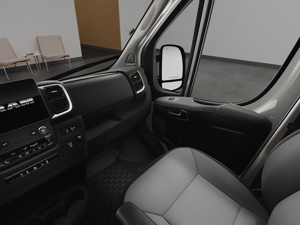 Quick Order Package 24G SLT (115V Auxiliary Power Outlet, 12V Rear Auxiliary Power Outlet, Ambient LED Interior Lighting, Chrome Front Grille, Cowl Aesthetic Cover, Exterior Mirrors w/Heating Element, Instrument Panel Bright Bezels, Power Adjust Mirrors, Power Folding/Heated Mirrors, Power-Adjustable Convex Auxiliary Mirrors, Power-Folding Mirrors, Rear Cargo LED Lamp, and Remote Start System), Safety Group (Digital Rearview Mirror w/Autodim, Intelligent Speed Assist (ISA), and Lane Departure Warning Plus), Storage Group (Cargo Net, Shelf Above Roof Trim, and Underseat Storage Tray), 4 Speakers, 4-Wheel Disc Brakes, ABS brakes, Adaptive Cruise Control w/Stop & Go, Air Conditioning, Alloy wheels, AM/FM radio: SiriusXM, Apple CarPlay/Android Auto, Auto High-beam Headlights, Black/Gray Seats, Bodyside moldings, Brake assist, Cloth Bucket Seats, Driver door bin, Driver Seat Armrest, Drivers Seat Mounted Armrest, Dual front impact airbags, Electronic Stability Control, Emergency communication system, Exterior Mirrors w/Supplemental Signals, Front anti-roll bar, Front Bucket Seats, Front fog lights, Front reading lights, Front wheel independent suspension, Fully automatic headlights, Heated door mirrors, Heated front seats, Heavy Duty Suspension, Illuminated entry, Low tire pressure warning, Manufacturers Statement of Origin, Navigation System, Occupant sensing airbag, Outside temperature display, Overhead airbag, Overhead console, ParkView Rear Back-Up Camera, Passenger door bin, Passenger seat mounted armrest, Power door mirrors, Power steering, Power windows, Radio: Uconnect 5 Nav w/10.1 Display, Rain sensing wipers, Rain Sensitive Windshield Wipers, Rear anti-roll bar, Remote keyless entry, Security system, Speed control, Steering wheel mounted audio controls, Telescoping steering wheel, Traction control, Trip computer, Turn signal indicator mirrors, Variably intermittent wipers, and Wheels: 16 x 6 Painted Silver Aluminum Bluetooth Backup Camera. Ceramic Gray Clearcoat 2025 Ram ProMaster 3500 EV FWD 1-Speed Automatic Electric Motor