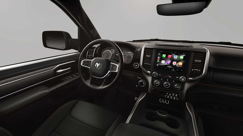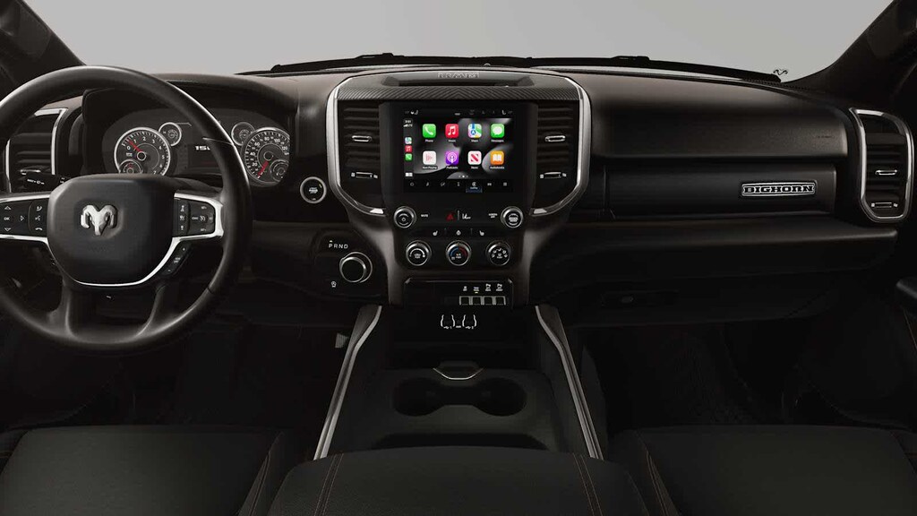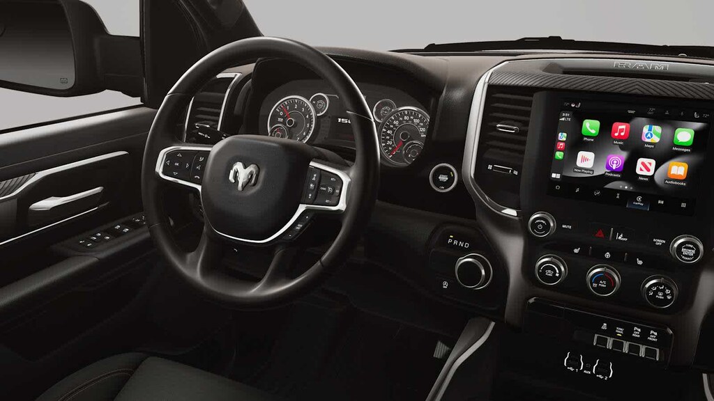 Prepare to be impressed with our Big Horn cabin, starting with our Level 1 Equipment Packages universal garage door opener, power adjustable pedals, power sliding rear window, comfortable heated cloth seats, a heated leather-wrapped steering wheel, air conditioning, a RAM Clean-Air System, keyless access, push-button ignition, cruise control, door-sill scuff plates, and clever cargo space. The 8.4-inch touchscreen features voice control, Bluetooth, and a six-speaker sound system for intelligent infotainment.
