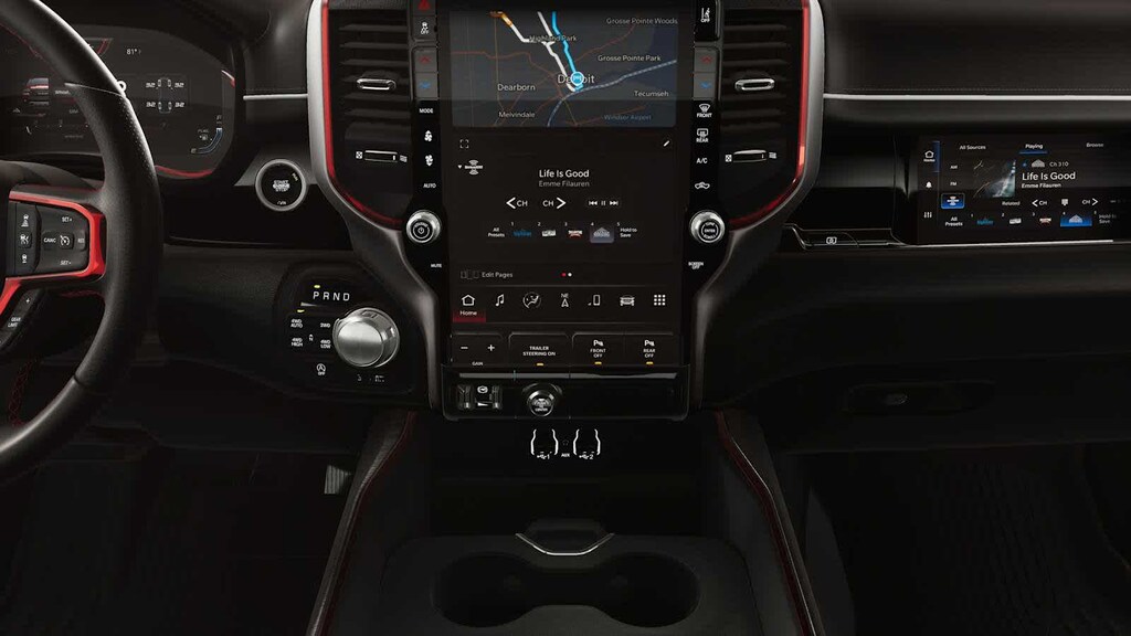 Our Rebel cabin is ready for rough terrain, thanks to its Level 2 Equipment Pack, which features heated/ventilated luxury leather front seats, eight-way power adjustment for the driver, heated rear seats, a heated-wrapped steering wheel, dual-zone automatic climate control, 12V/115V outlets, a power rear window, and remote start. Off-Road Info Pages enhance the infotainment system with Uconnect 5 14.4-inch touchscreen display, full-color navigation, WiFi compatibility, Android Auto/Apple CarPlay, Bluetooth, voice control, dual wireless charging, and a nineteen-speaker Harman Kardon audio sound system.