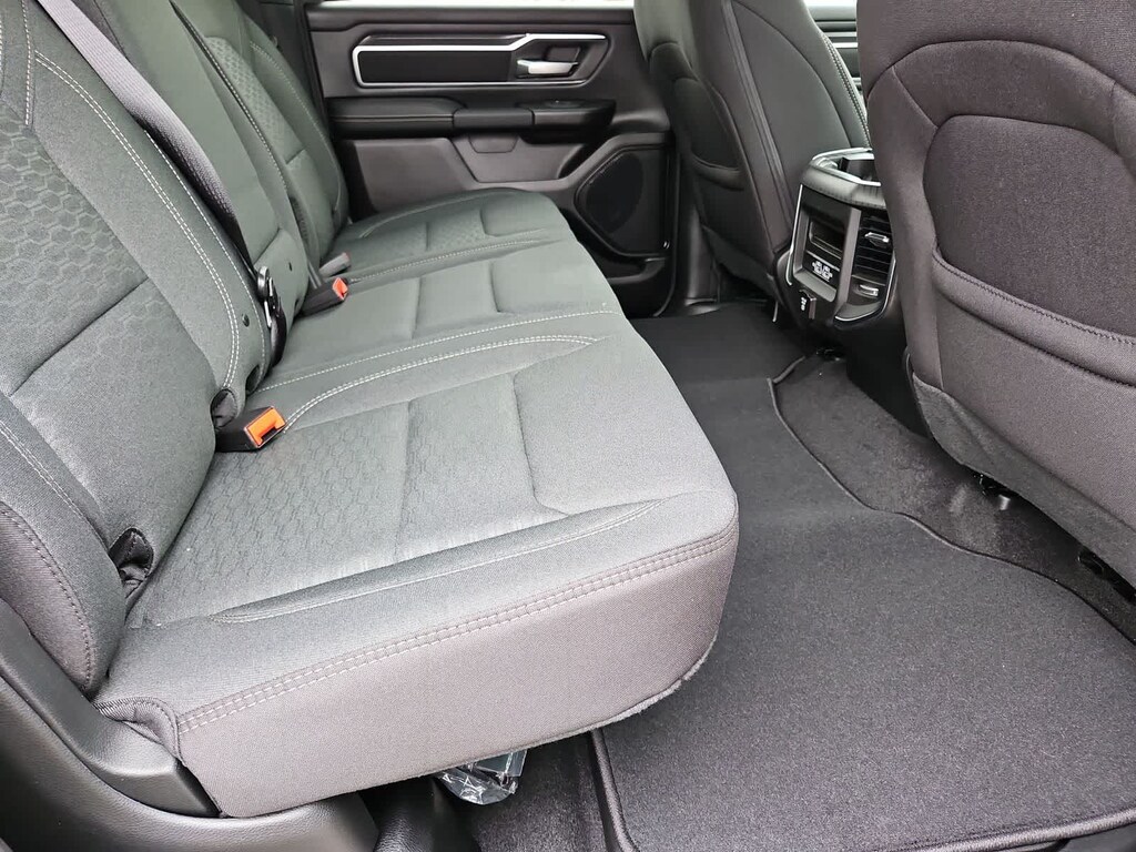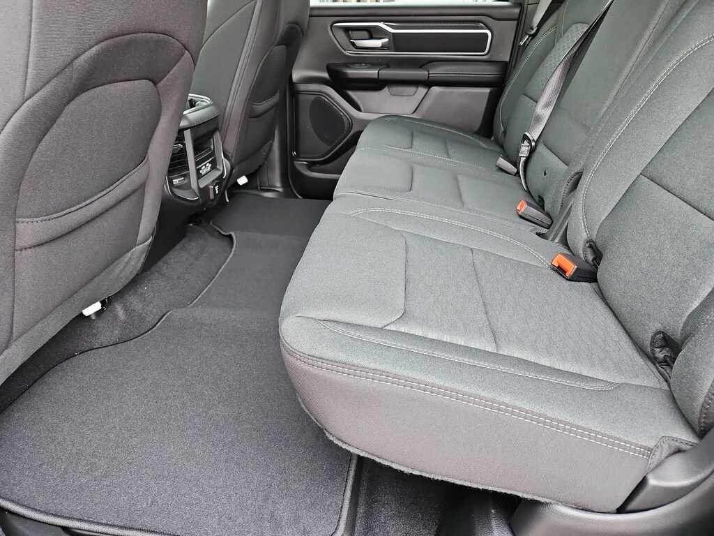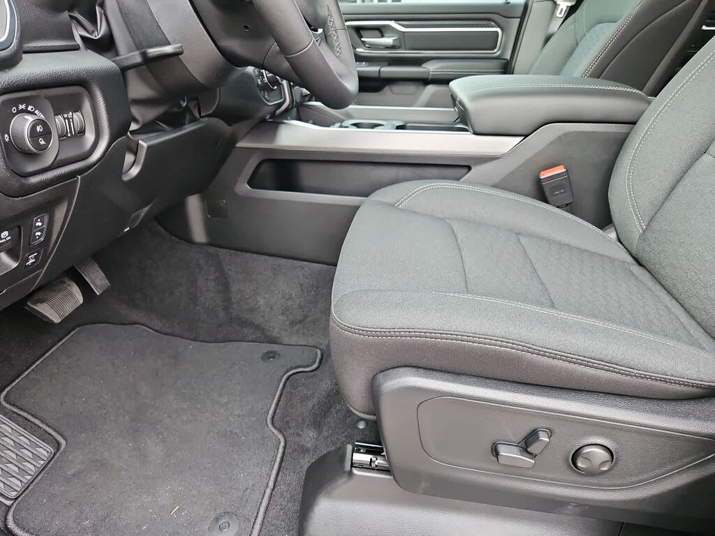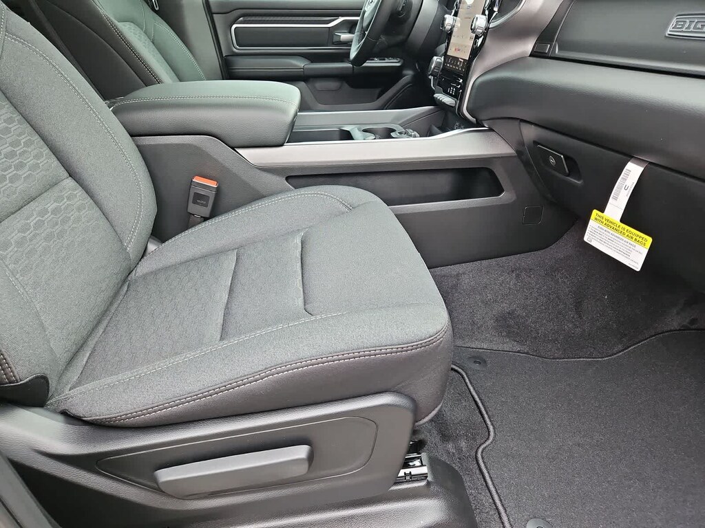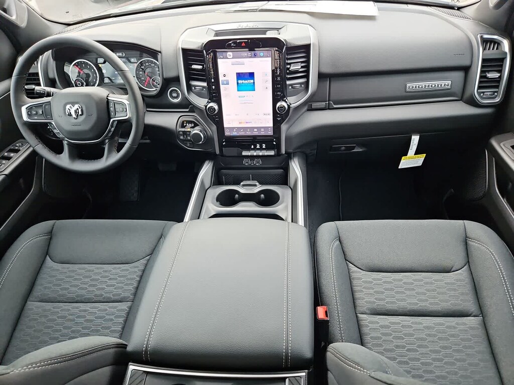 Our Big Horn cabin has been tailored to fit your needs, with the Level 2 Equipment Packages heated deluxe cloth seats, a heated leather-wrapped steering wheel, universal home remote, power adjustable pedals, power sliding rear window, dual climate control, a RAM Clean-Air System, keyless access, push-button ignition, cruise control, door-sill scuff plates, and clever cargo space, and a Uconnect 5 with 12.0-inch touchscreen features voice control, Bluetooth, and a nine-speaker sound system for intelligent infotainment.
