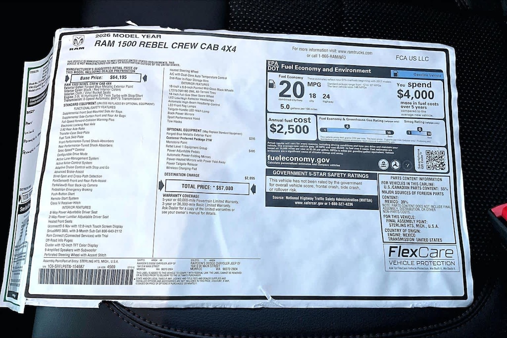 Lithia Chrysler Dodge Jeep Ram of Tri-Cities is pleased to offer this Forged Blue Metallic 2026 Ram 1500 Rebel for purchase, this vehicle is well equipped with many features including:Quick Order Package 21W Rebel, Rebel Level 1 Equipment Group (Auto Power-Folding Mirrors, Auto-Dimming Exterior Driver Mirror, Black Exterior Mirrors, Black Premium Power Mirrors, Convex Wide-Angle Exterior Mirror Insert, Exterior Mirrors Courtesy Lamps, Exterior Mirrors with Heating Element, Exterior Mirrors with Supplemental Signals, Power Adjustable Pedals, Rear Window Defroster, Remote Tailgate Release, and Wireless Charging Pad), 10 Speakers, 3.92 Rear Axle Ratio, 4 Way Front Headrests, 4-Wheel Disc Brakes, 4G LTE Wi-Fi Hot Spot, ABS brakes, Active Noise Control System, Air Conditioning, Alloy wheels, AM/FM radio: SiriusXM with 360L, Apple CarPlay, Apple CarPlay/Android Auto, Auto High-beam Headlights, Auto-dimming Rear-View mirror, Automatic temperature control, Brake assist, Bucket Seats, Cloth/Vinyl Bucket Seats, Compass, Connected Travel and Traffic Services, Connectivity - US/Canada, Delay-off headlights, Disassociated Touchscreen Display, Driver door bin, Driver vanity mirror, Dual front impact airbags, Dual front side impact airbags, Electronic Stability Control, Front anti-roll bar, Front Bucket Seats, Front Center Armrest w/Storage, Front dual zone A/C, Front fog lights, Front License Plate Bracket, Front reading lights, Front Seat Back Map Pockets, Front wheel independent suspension, Full Length Upgraded Floor Console, Fully automatic headlights, Garage door transmitter, Global Telematics Box Module, Google Android Auto, GPS Antenna Input, GPS Navigation, HD Radio, Heated door mirrors, Heated Front Seats, Heated front seats, Heated Steering Wheel, Heated steering wheel, Illuminated entry, Integrated Center Stack Radio, Integrated Voice Command with Bluetooth, Leather steering wheel, Low tire pressure warning, Manual Folding Exterior Mirrors, Manufacturers Statement of Origin, Navigation System, Occupant sensing airbag, Off-Road Information Pages, Outside temperature display, Overhead airbag, Overhead console, Panic alarm, ParkView Rear Back-Up Camera, Passenger door bin, Passenger vanity mirror, Power 2-Way Driver Lumbar Adjust, Power Adjust 8-Way Driver Seat, Power door mirrors, Power driver seat, Power steering, Power windows, Radio data system, Radio: Uconnect 5 Navigation with 12.0 Display, Rear 60/40 Folding Seat, Rear anti-roll bar, Rear seat center armrest, Rear step bumper, Remote keyless entry, SiriusXM Radio Service, SiriusXM with 360L, Speed control, Split folding rear seat, Steering wheel mounted audio controls, Tachometer, Telescoping steering wheel, Tilt steering wheel, Traction control, Trip computer, USB Host Flip, Variably intermittent wipers, Voltmeter, and Wheels: 18 x 8.0 Painted Mid-Gloss Black.