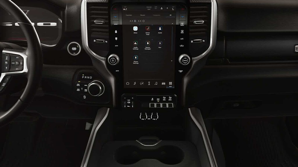 Many rewarding details are standard in our Big Horn cabin, starting with the Level 2 Equipment Packs universal garage door opener, power adjustable pedals, power sliding rear window, a dual pane panoramic sunroof, comfortable heated deluxe cloth seats, a heated leather-wrapped steering wheel, dual climate control, air conditioning, a RAM Clean-Air System, keyless access, push-button ignition, cruise control, remote start, door-sill scuff plates, clever cargo space, a 7-inch color display, Uconnect 5 with a 12.0-inch touchscreen, features voice control, Bluetooth, and a nine-speaker sound system for intelligent infotainment.