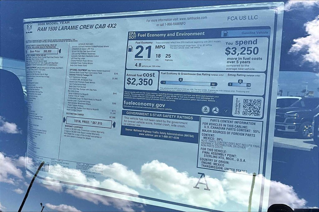 New Price! Diamond Black Crystal Pearlcoat 2026 Ram 1500 Laramie RWD 8-Speed Automatic 3.0L I6 FRESH OIL CHANGE, 10 Speakers, 3.21 Rear Axle Ratio, 4-Wheel Disc Brakes, 4G LTE Wi-Fi Hot Spot, ABS brakes, Accent Color Premium Power Mirrors, Air Conditioning, Alloy wheels, AM/FM radio: SiriusXM with 360L, Apple CarPlay/Android Auto, Audio memory, Auto High-beam Headlights, Auto Power-Folding Mirrors, Auto-dimming door mirrors, Auto-Dimming Exterior Driver Mirror, Auto-dimming Rear-View mirror, Automatic temperature control, Bed Utility Group, Black Interior Accents, Black Painted Exterior Mirrors Caps, Body Color Front Bumper, Body Color Rear Bumper with Step Pads, Brake assist, Bridgestone Brand Tires, Bumpers: chrome, Chrome Exterior Mirrors, Compass, Connected Travel and Traffic Services, Connectivity - US/Canada, Convex Wide-Angle Exterior Mirror Insert, Delay-off headlights, Driver door bin, Driver vanity mirror, Dual front impact airbags, Dual front side impact airbags, Electronic Stability Control, Exterior 115V AC Outlet, Exterior Mirrors Courtesy Lamps, Exterior Mirrors with Heating Element, Exterior Mirrors with Memory, Exterior Mirrors with Supplemental Signals, Exterior Parking Camera Rear, Front anti-roll bar, Front Bucket Seats, Front Center Armrest w/Storage, Front dual zone A/C, Front fog lights, Front License Plate Bracket, Front reading lights, Front wheel independent suspension, Fully automatic headlights, Garage door transmitter, GPS Navigation, Grille Surround 3 Body Color Tex 2 Black, Heated door mirrors, Heated front seats, Heated rear seats, Heated steering wheel, Illuminated entry, Integrated Center Stack Radio, Integrated Voice Command with Bluetooth, Laramie Level 1 Equipment Group, Leather steering wheel, Leather Trimmed Bucket Seats, Low tire pressure warning, Manufacturers Statement of Origin, Memory seat, MOPAR 4 Adjustable Cargo Tie-Down Hooks, MOPAR Front and Rear Rubber Floor Mats, MOPAR Spray in Bedliner, Multi-Function Tailgate, Navigation System, Occupant sensing airbag, Outside temperature display, Overhead airbag, Overhead console, Panic alarm, Passenger door bin, Passenger vanity mirror, Power door mirrors, Power driver seat, Power passenger seat, Power steering, Power windows, Quick Order Package 21H Laramie, Radio data system, Radio: Uconnect 5 Navigation with 12.0 Display, Rain Sensitive Windshield Wipers, RAM Grille Badge - Chrome, RAMs Head Badge, Rear anti-roll bar, Rear reading lights, Rear seat center armrest, Rear step bumper, Remote keyless entry, Remote Tailgate Release, Security system, SiriusXM Radio Service, SiriusXM with 360L, Speed control, Split folding rear seat, Sport Appearance Package, Sport Performance Hood, Steering wheel mounted audio controls, Tachometer, Telescoping steering wheel, Tilt steering wheel, Traction control, Trip computer, Turn signal indicator mirrors, USB Host Flip, Variably intermittent wipers, Ventilated front seats, Voltmeter, Wheels: 20 x 9 Premium Paint/Polish. Price includes: $1000 - 2026 Central BC SFS Retail Bonus Cash . Exp. 01/20/2026 $3500 - 2026 National Retail Consumer Cash . Exp. 02/02/2026
