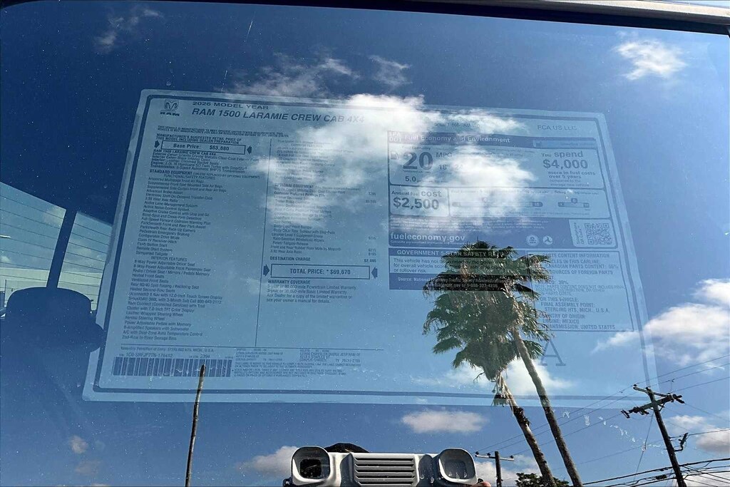 Granite Crystal Metallic Clearcoat 2026 Ram 1500 Laramie 4WD 8-Speed Automatic 3.0L I6 FRESH OIL CHANGE, 10 Speakers, 4-Wheel Disc Brakes, 4G LTE Wi-Fi Hot Spot, ABS brakes, Accent Color Premium Power Mirrors, Active Noise Control System, Air Conditioning, Alloy wheels, AM/FM radio: SiriusXM with 360L, Apple CarPlay/Android Auto, Audio memory, Auto High-beam Headlights, Auto Power-Folding Mirrors, Auto-dimming door mirrors, Auto-Dimming Exterior Driver Mirror, Auto-dimming Rear-View mirror, Automatic temperature control, Black Painted Exterior Mirrors Caps, Body Color Front Bumper, Body Color Rear Bumper with Step Pads, Brake assist, Bumpers: chrome, Chrome Exterior Mirrors, Compass, Connected Travel and Traffic Services, Connectivity - US/Canada, Convex Wide-Angle Exterior Mirror Insert, Delay-off headlights, Dome Dual LED Reading Lamp, Driver door bin, Driver vanity mirror, Dual front impact airbags, Dual front side impact airbags, Dual-Pane Panoramic Sunroof, Electronic Stability Control, Exterior Mirrors Courtesy Lamps, Exterior Mirrors with Heating Element, Exterior Mirrors with Memory, Exterior Mirrors with Supplemental Signals, Front anti-roll bar, Front Bucket Seats, Front Center Armrest w/Storage, Front dual zone A/C, Front fog lights, Front License Plate Bracket, Front reading lights, Front wheel independent suspension, Fully automatic headlights, Garage door transmitter, GPS Navigation, Grille Surround 3 Body Color Tex 4 Chrome, Heated door mirrors, Heated front seats, Heated rear seats, Heated steering wheel, Illuminated entry, Integrated Center Stack Radio, Integrated Voice Command with Bluetooth, Laramie Level 1 Equipment Group, Laramie Southwest Edition, Leather steering wheel, Leather Trimmed Bucket Seats, LED Dome/Reading Lamp, Low tire pressure warning, Manufacturers Statement of Origin, Memory seat, MOPAR Front and Rear Rubber Floor Mats, MOPAR Lockable Console Storage, Navigation System, Occupant sensing airbag, Off-Road Information Pages, Outside temperature display, Overhead airbag, Overhead console, Panic alarm, ParkView Rear Back-Up Camera, Passenger door bin, Passenger vanity mirror, Power Deployable Running Boards, Power door mirrors, Power driver seat, Power passenger seat, Power steering, Power windows, Quick Order Package 21H Laramie, Radio data system, Radio: Uconnect 5 Navigation with 12.0 Display, Rain Sensitive Windshield Wipers, RAM Grille Badge - Chrome, Rear anti-roll bar, Rear reading lights, Rear seat center armrest, Rear step bumper, Remote keyless entry, Remote Tailgate Release, Security system, SiriusXM Radio Service, SiriusXM with 360L, Speed control, Split folding rear seat, Steering wheel mounted audio controls, Tachometer, Telescoping steering wheel, Tilt steering wheel, Tow Hooks, Traction control, Trailer Brake Control, Trip computer, Turn signal indicator mirrors, USB Host Flip, Variably intermittent wipers, Ventilated front seats, Voltmeter, Wheels: 20 x 9 Premium Paint/Polish. Price includes: $1000 - 2026 Central BC SFS Retail Bonus Cash . Exp. 01/20/2026 $3500 - 2026 National Retail Consumer Cash . Exp. 02/02/2026