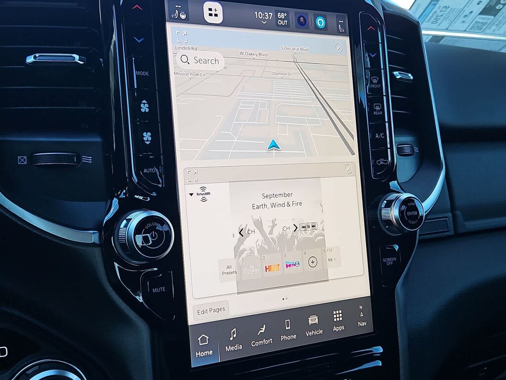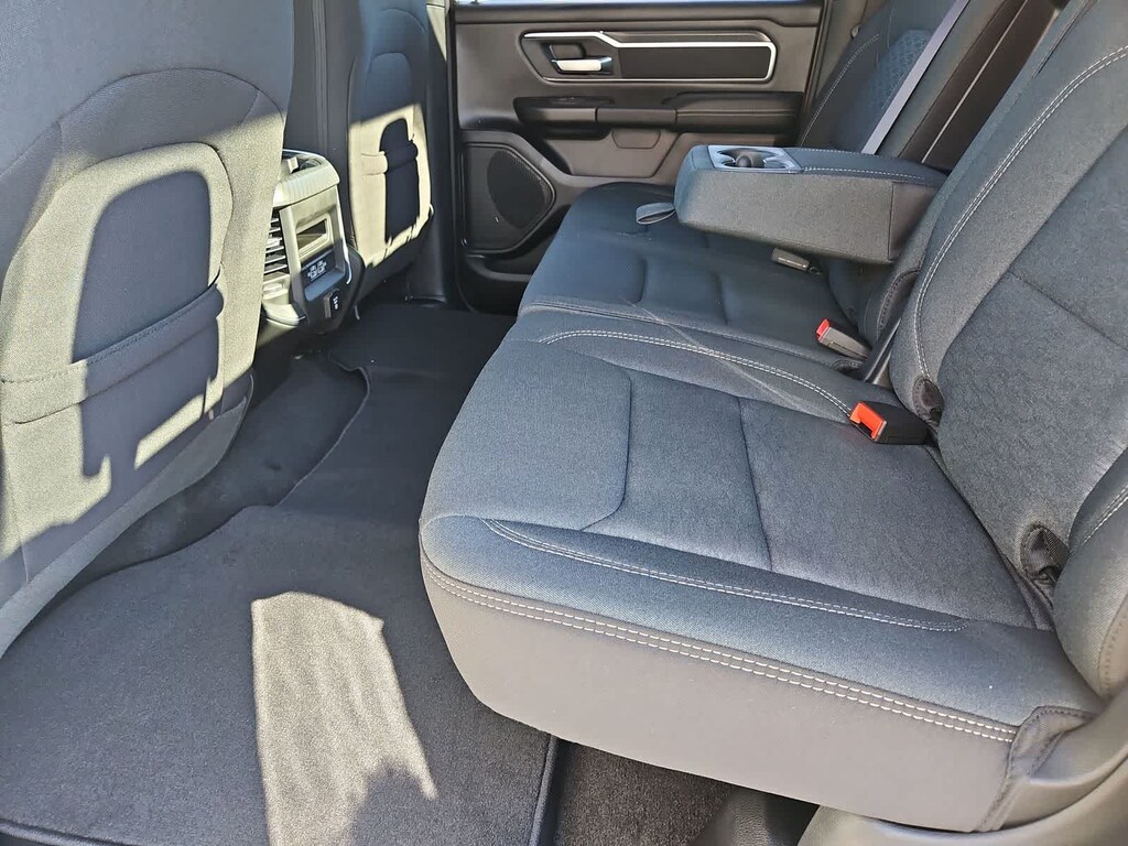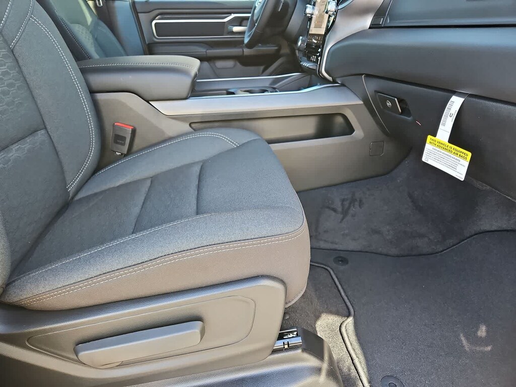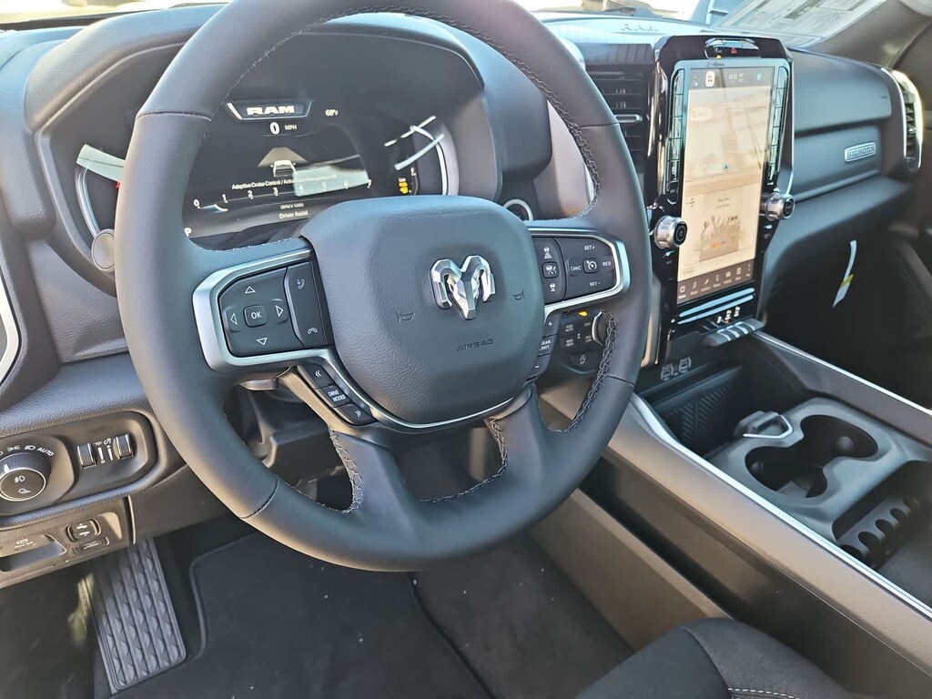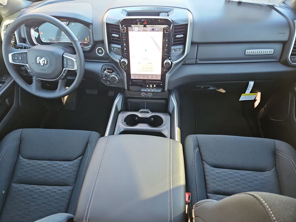 Many rewarding details are standard in our Big Horn cabin: cloth seats, a leather-wrapped steering wheel, air conditioning, remote keyless access with push-button ignition, and cruise control. The infotainment system features an 8.4-inch touchscreen with Bluetooth, voice-interactive Uconnect 5 technology, and a 6-speaker audio system.