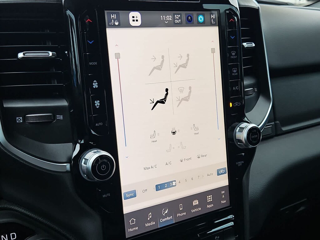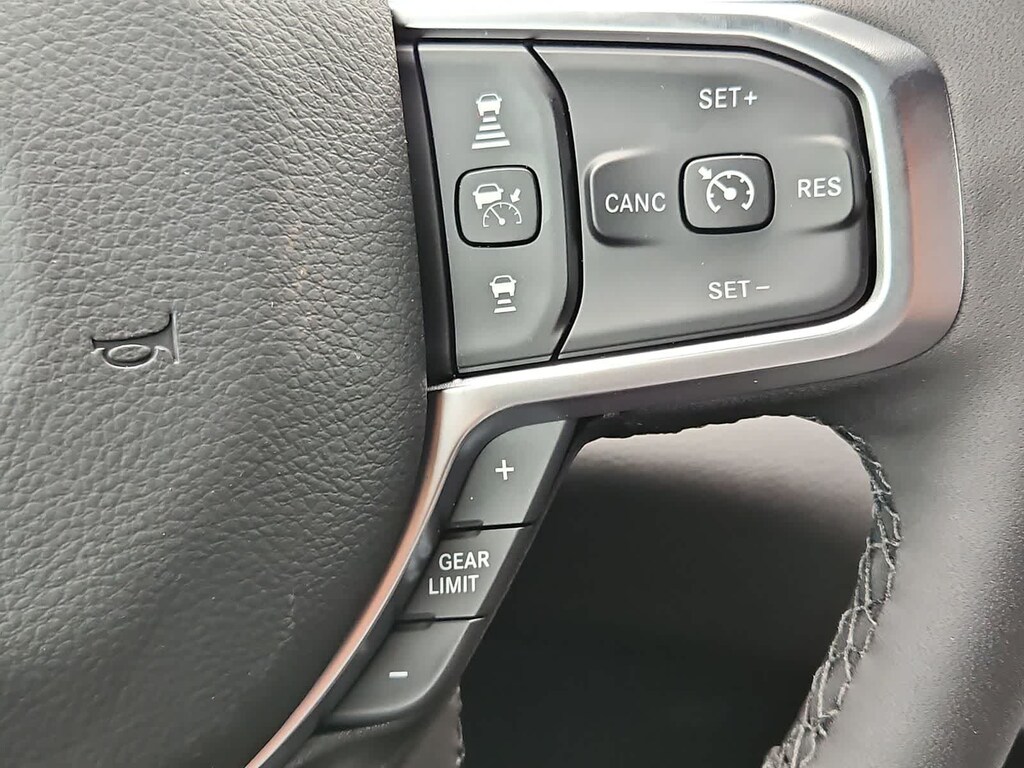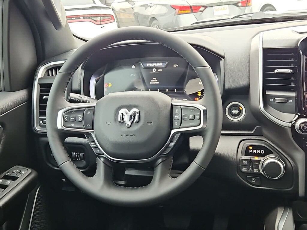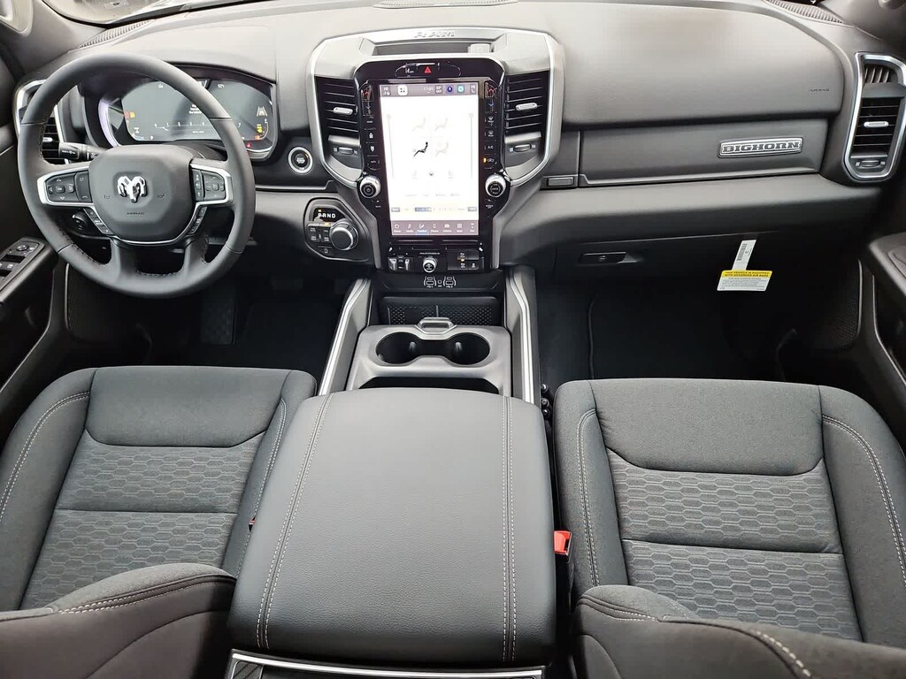 Our Big Horn cabin has been tailored to fit your needs, with the Level 2 Equipment Packages heated deluxe cloth seats, a heated leather-wrapped steering wheel, universal home remote, power adjustable pedals, power sliding rear window, dual climate control, a RAM Clean-Air System, keyless access, push-button ignition, cruise control, door-sill scuff plates, and clever cargo space, and a Uconnect 5 with 12.0-inch touchscreen features voice control, Bluetooth, and a nine-speaker sound system for intelligent infotainment.