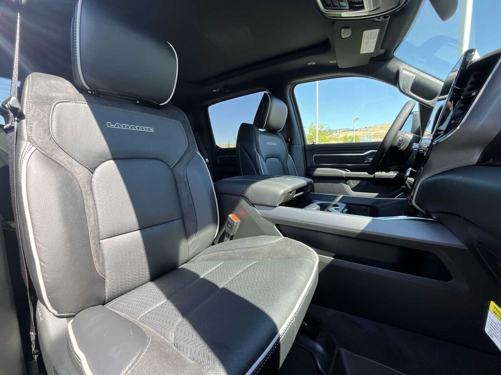 LARAMIE LEVEL 2 EQUIPMENT GROUP Rain Sensitive Windshield Wipers, Front Passenger Interactive Display, Secondary Active Grille Shutters, Smartphone As A Key Capable, 14.4 Touchscreen Display, Dual Wireless Charging Pad, Radio: Uconnect 5 Nav w/14.4 Display, harman/kardon® 19 Speaker Premium Sound, Cluster 12 TFT Color Display, Power Tailgate, DUAL-PANE PANORAMIC SUNROOF LED Dome/Reading Lamp, Dome Dual LED Reading Lamp, MOPAR FRONT & REAR RUBBER FLOOR MATS, TRANSMISSION: 8-SPEED AUTOMATIC (8HP75) (STD), ENGINE: 3.0L I6 HURRICANE SO TWIN TURBO ESS (STD). Ram Laramie with Forged Blue Metallic exterior and Black interior features a Straight 6 Cylinder Engine with 420 HP at 5200 RPM*.
