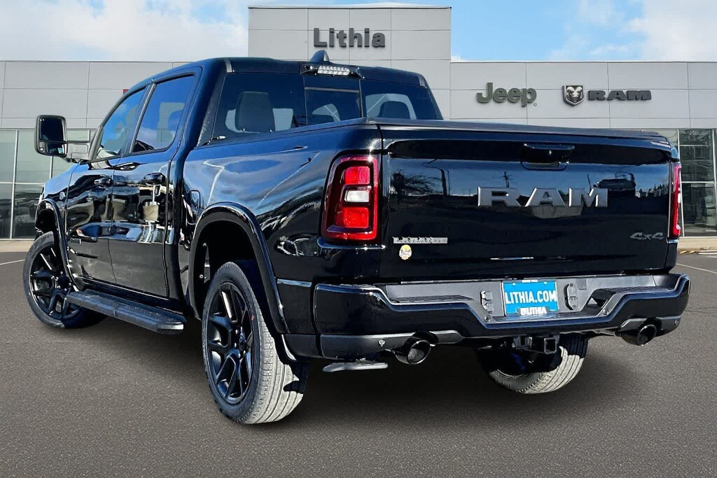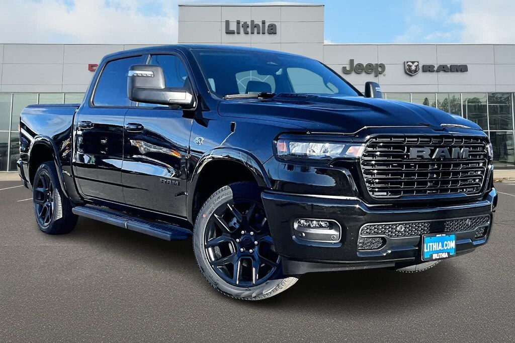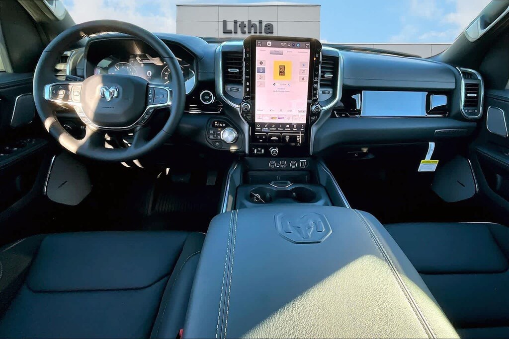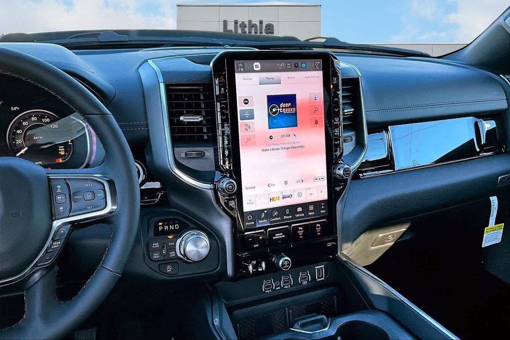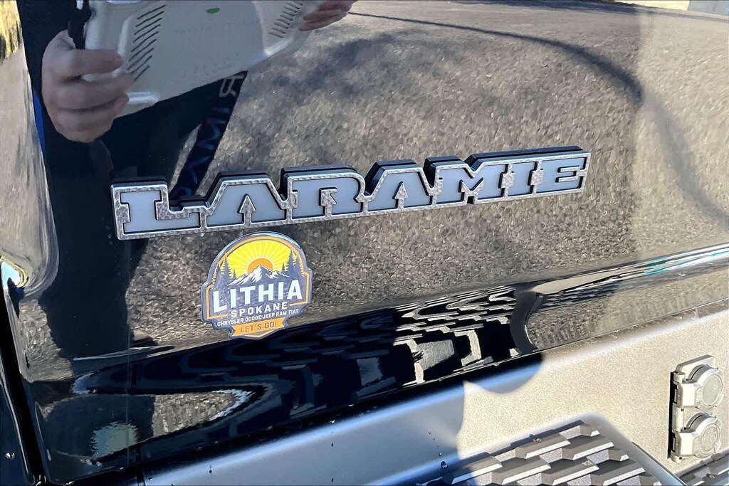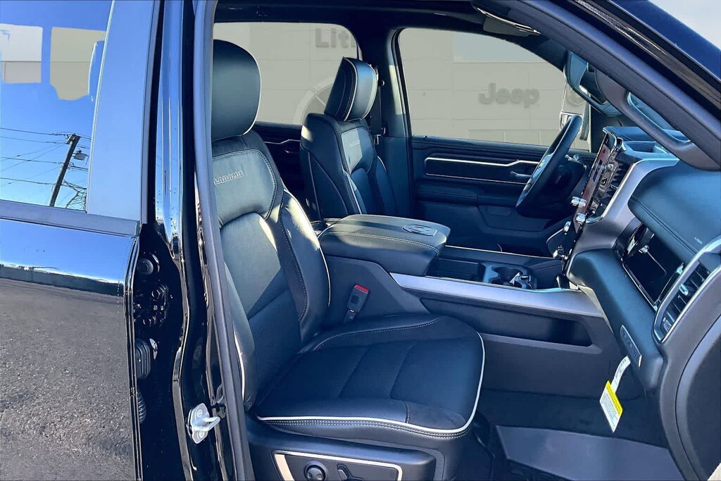 NIGHT EDITION Black Headlamp Bezels, Wheels: 22 x 9 Forged Aluminum, Tires: 285/45R22XL BSW All Season, Pirelli Brand Tires, Proximity Approach/Departure Lamps, Anti-Spin Differential Rear Axle, Accent Color Door Handles, Black Interior Accents, Body Color Front Bumper, Grille Surround 3 Black Texture 2 Black, Body Color Rear Bumper w/Step Pads, RAM Grille Badge - Black, Black Painted Exterior Mirrors Caps, Exterior Mirrors Approach Lamps, Accent Color Premium Power Mirrors, Sport Performance Hood, Black Exterior Truck Badging, Accent Color Tailgate Handle, Dual Exhaust w/Black Tips, Black Tail Lamp Bezels, ADVANCED SAFETY GROUP II Exterior Mirrors Approach Lamps, Active Driving Assist System, Surround View Camera System, Evasive Steer Assist, Drowsy Driver Detection, Intersection Collision Assist System, Traffic Sign Recognition, 12-Way/1-Way Trailer Connector, LARAMIE LEVEL 2 EQUIPMENT GROUP Rain Sensitive Windshield Wipers, 14.4 Touchscreen Display, Front Passenger Interactive Display, Radio: Uconnect 5 Nav w/14.4 Display, harman/kardon® 19 Speaker Premium Sound, Cluster 12 TFT Color Display, Power Tailgate, DUAL-PANE PANORAMIC SUNROOF LED Dome/Reading Lamp, Dome Dual LED Reading Lamp, ENGINE: 5.7L V8 HEMI MDS VVT ETORQUE 48V Belt Starter Generator, Heavy Duty Engine Cooling, Passive Tuned Mass Damper, Delete Alternator, Passive Cold End Exhaust, 18 Aluminum Spare Wheel, TECHNOLOGY GROUP Head Up Display, LED CHMSL Lamp, 12-Way/1-Way Trailer Connector, BED UTILITY GROUP MOPAR Spray In Bedliner, MOPAR 4 Adjustable Cargo Tie-Down Hooks, Exterior 115V AC Outlet, TRI-FOLD TONNEAU COVER, MOPAR BLACK TUBULAR SIDE STEPS, MOPAR FRONT & REAR RUBBER FLOOR MATS, TRANSMISSION: 8-SPEED AUTOMATIC (8HP75) (STD). Ram Laramie with Diamond Black Crystal Pearlcoat exterior and Black interior features a 8 Cylinder Engine with 395 HP at 5600 RPM*.