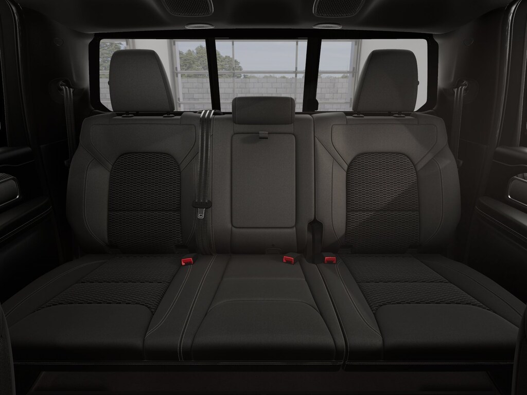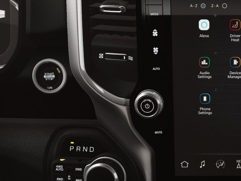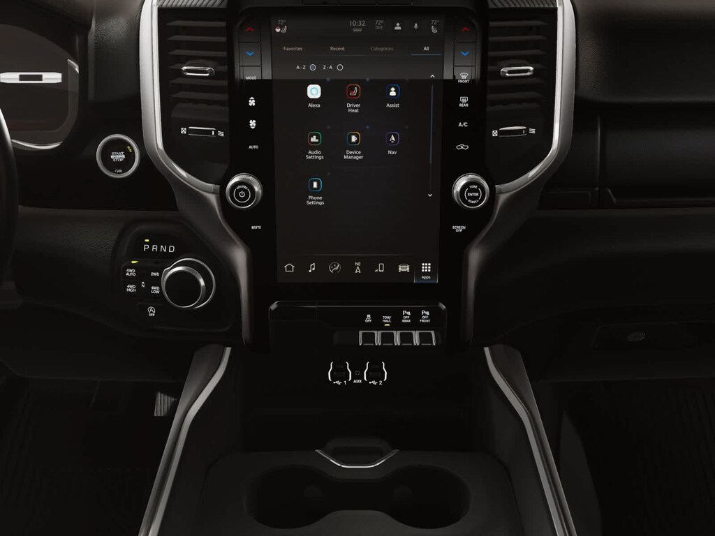 Our Big Horn cabin has been tailored to fit your needs, with the Level 2 Equipment Packages heated deluxe cloth seats, a heated leather-wrapped steering wheel, universal home remote, power adjustable pedals, power sliding rear window, dual climate control, a RAM Clean-Air System, keyless access, push-button ignition, cruise control, door-sill scuff plates, and clever cargo space, and a Uconnect 5 with 12.0-inch touchscreen features voice control, Bluetooth, and a nine-speaker sound system for intelligent infotainment.