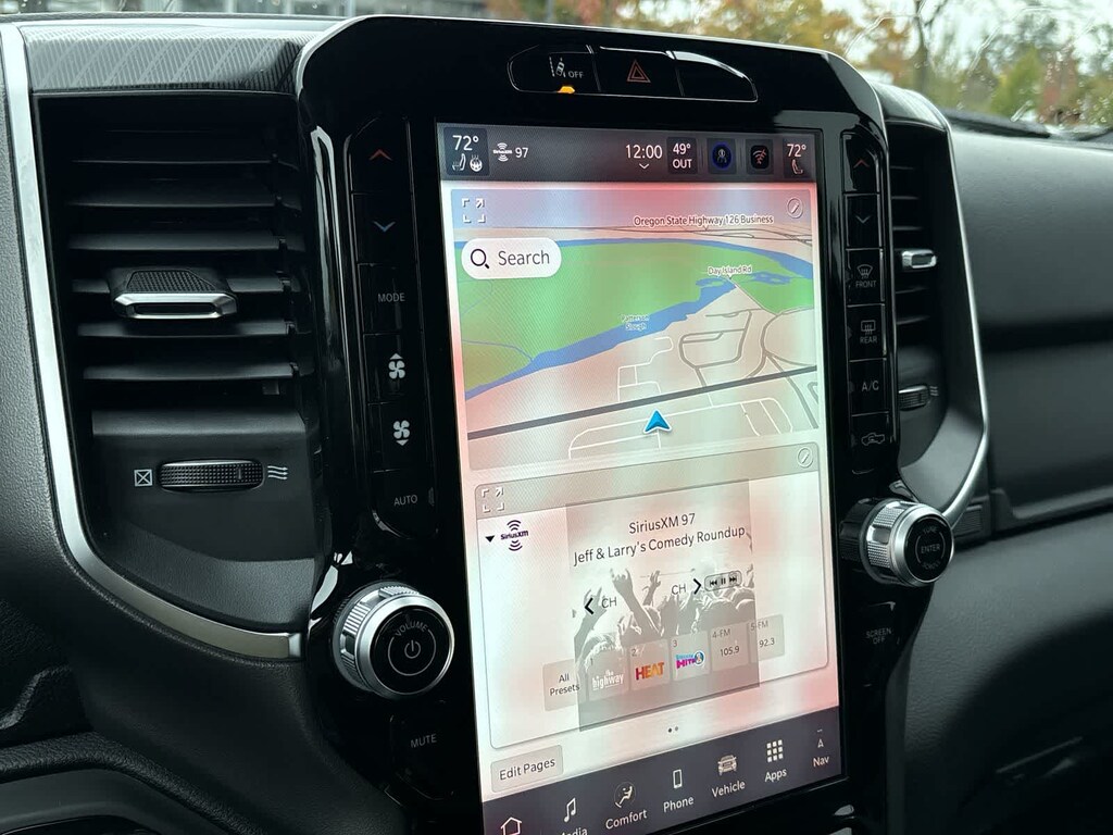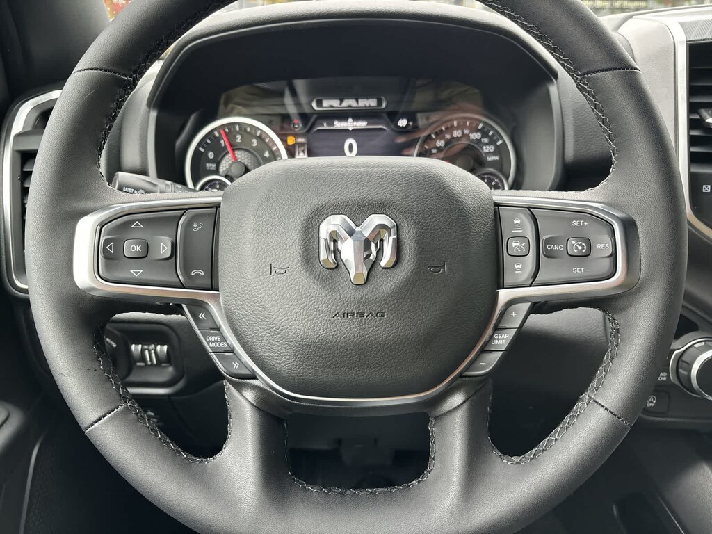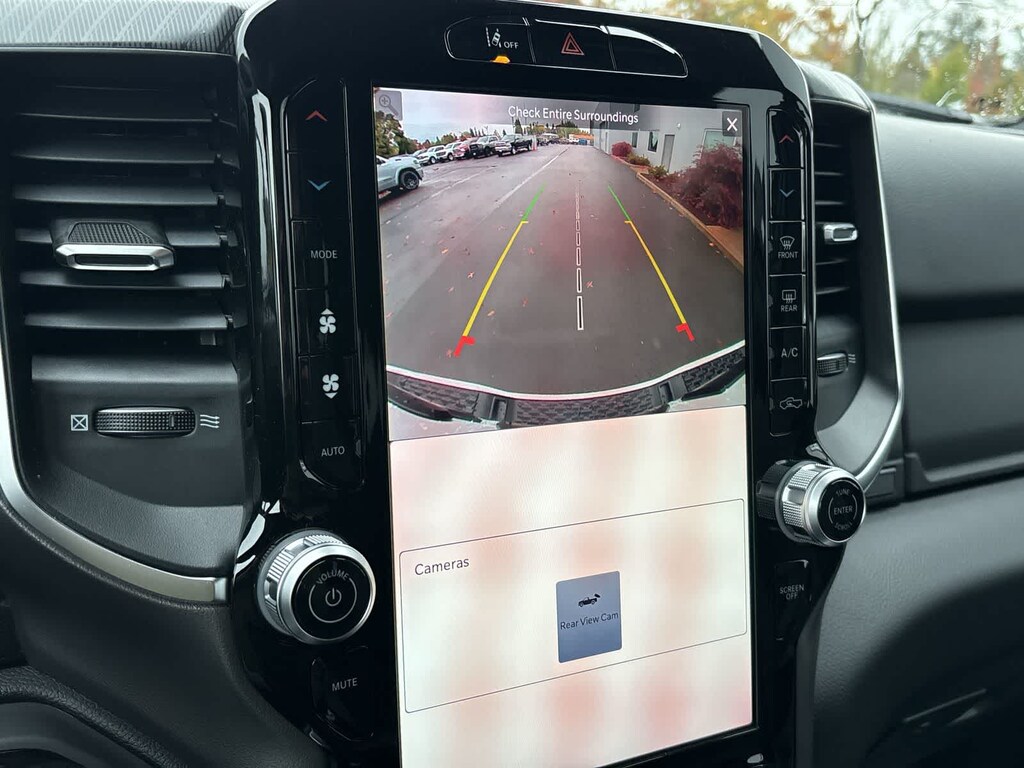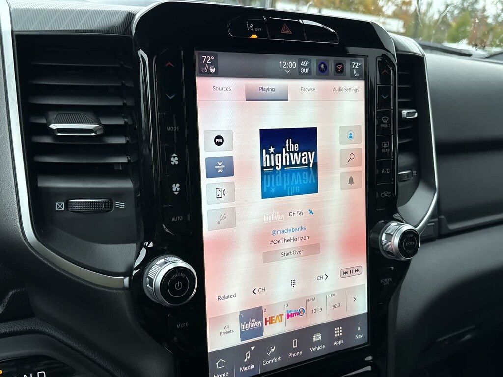 BIG HORN LEVEL 2 EQUIPMENT GROUP SiriusXM Radio Service, Power Adjustable Pedals, Leather Wrapped Steering Wheel, 12 Touchscreen Display, Glove Box Lamp, Auto Power-Folding Mirrors, 115V Auxiliary Rear Power Outlet, Media Hub w/2 Charge Only USBs, Heated Front Seats, Security Alarm, Black Premium Power Mirrors, Premium Overhead Console, 9 Amplified Speakers w/Subwoofer, Disassociated Touchscreen Display, Secondary Active Grille Shutters, Wireless Charging Pad, Body Color Fender Flares, Remote Tailgate Release, 115V Auxiliary Power Outlet, LED Dome Lamp w/On/Off Switch, Universal Garage Door Opener, 2nd Row In Floor Storage Bins, Sun Visors w/Illuminated Vanity Mirrors, LED Footwell Lighting, Rear Window Defroster, Rear View Auto Dim Mirror, Rear Power Sliding Window, GPS Navigation, NIGHT EDITION Tires: 275/55R20 OWL All Season, Bridgestone Brand Tires, Accent Color Premium Power Mirrors, Exterior Mirrors w/Supplemental Signals, Black Headlamp Bezels, Exterior Mirrors Courtesy Lamps, Grille Black Surround Black Mesh, Auto Power-Folding Mirrors, Wheels: 20 x 9.0 Aluminum Painted Clad, Auto Dim Exterior Driver Mirror, Black Exterior Truck Badging, Anti-Spin Differential Rear Axle, Accent Color Door Handles, Accent Color Tailgate Handle, Black Interior Accents, Dual Exhaust w/Black Tips, Body Color Front Bumper, Body Color Rear Bumper w/Step Pads, Black Tail Lamp Bezels, RAM Grille Badge - Black, Black Painted Exterior Mirrors Caps, PROTECTION GROUP Transfer Case Skid Plate, Steering Gear Skid Plate, Fuel Tank Skid Plate, Tow Hooks, MOPAR FRONT & REAR RUBBER FLOOR MATS, TRANSMISSION: 8-SPEED AUTOMATIC (8HP75), ENGINE: 5.7L V8 HEMI MDS VVT ETORQUE Active Noise Control System, Heavy Duty Engine Cooling, Passive Tuned Mass Damper, GVWR: 7,100 lbs, Dual Rear Exhaust w/Bright Tips, G/T Exhaust, 18 Aluminum Spare Wheel, 33 Gallon Fuel Tank. Ram Big Horn with Bright White Clearcoat exterior and Black interior features a 8 Cylinder Engine with 305 HP at 6400 RPM*.
