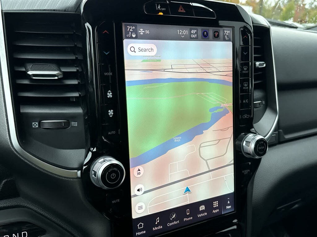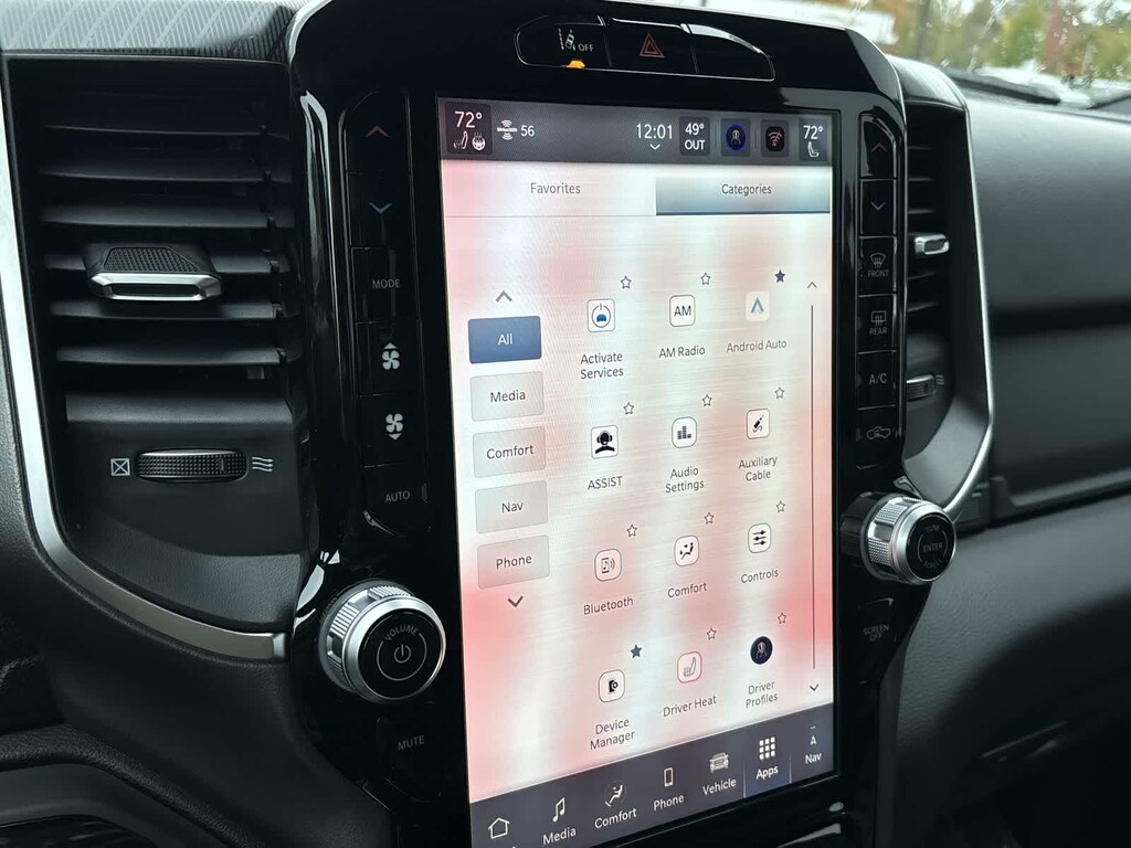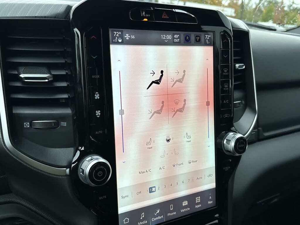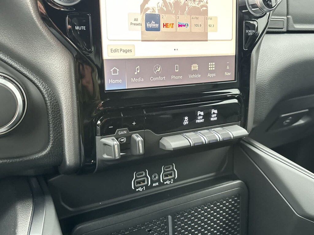 BIG HORN LEVEL 2 EQUIPMENT GROUP SiriusXM Radio Service, Power Adjustable Pedals, Leather Wrapped Steering Wheel, 12 Touchscreen Display, Glove Box Lamp, Auto Power-Folding Mirrors, 115V Auxiliary Rear Power Outlet, Media Hub w/2 Charge Only USBs, Heated Front Seats, Security Alarm, Black Premium Power Mirrors, Premium Overhead Console, 9 Amplified Speakers w/Subwoofer, Disassociated Touchscreen Display, Secondary Active Grille Shutters, Wireless Charging Pad, Body Color Fender Flares, Remote Tailgate Release, 115V Auxiliary Power Outlet, LED Dome Lamp w/On/Off Switch, Universal Garage Door Opener, 2nd Row In Floor Storage Bins, Sun Visors w/Illuminated Vanity Mirrors, LED Footwell Lighting, Rear Window Defroster, Rear View Auto Dim Mirror, Rear Power Sliding Window, GPS Navigation, NIGHT EDITION Tires: 275/55R20 OWL All Season, Bridgestone Brand Tires, Accent Color Premium Power Mirrors, Exterior Mirrors w/Supplemental Signals, Black Headlamp Bezels, Exterior Mirrors Courtesy Lamps, Grille Black Surround Black Mesh, Auto Power-Folding Mirrors, Wheels: 20 x 9.0 Aluminum Painted Clad, Auto Dim Exterior Driver Mirror, Black Exterior Truck Badging, Anti-Spin Differential Rear Axle, Accent Color Door Handles, Accent Color Tailgate Handle, Black Interior Accents, Dual Exhaust w/Black Tips, Body Color Front Bumper, Body Color Rear Bumper w/Step Pads, Black Tail Lamp Bezels, RAM Grille Badge - Black, Black Painted Exterior Mirrors Caps, PROTECTION GROUP Transfer Case Skid Plate, Steering Gear Skid Plate, Fuel Tank Skid Plate, Tow Hooks, MOPAR FRONT & REAR RUBBER FLOOR MATS, TRANSMISSION: 8-SPEED AUTOMATIC (8HP75), ENGINE: 5.7L V8 HEMI MDS VVT ETORQUE Active Noise Control System, Heavy Duty Engine Cooling, Passive Tuned Mass Damper, GVWR: 7,100 lbs, Dual Rear Exhaust w/Bright Tips, G/T Exhaust, 18 Aluminum Spare Wheel, 33 Gallon Fuel Tank. Ram Big Horn with Bright White Clearcoat exterior and Black interior features a 8 Cylinder Engine with 305 HP at 6400 RPM*.
