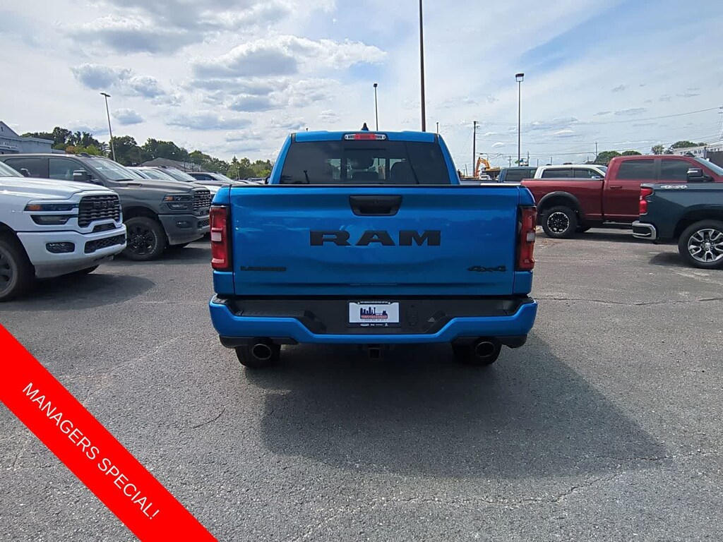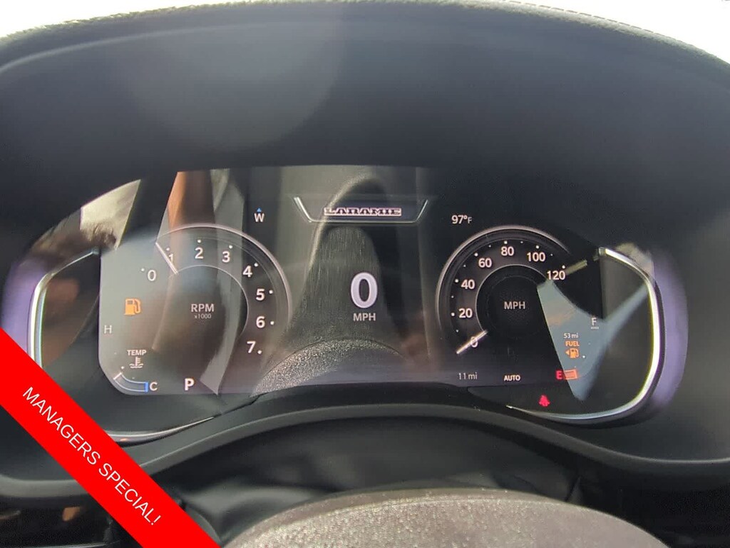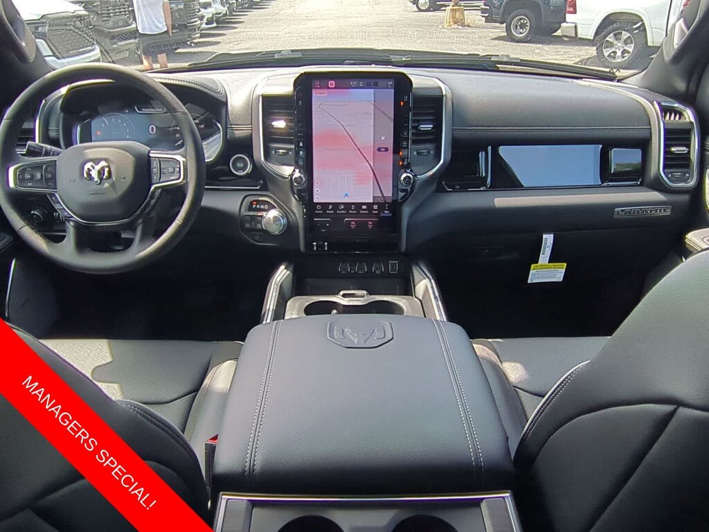 1500 Laramie is nicely equipped with Laramie Level 2 Equipment Group (14.4 Touchscreen Display, 4G LTE Wi-Fi Hot Spot, Cluster 12 TFT Color Display, Connected Travel and Traffic Services, Connectivity - US/Canada, Front Passenger Interactive Display, GPS Navigation, Harman/Kardon 19 Speaker Premium Sound, Integrated Center Stack Radio, Integrated Voice Command with Bluetooth, Power Tailgate, Radio: Uconnect 5 Nav with 14.4 Display, Rain Sensitive Windshield Wipers, SiriusXM Radio Service, SiriusXM with 360L, and USB Host Flip), Night Edition (Accent Color Door Handles, Accent Color Premium Power Mirrors, Accent Color Tailgate Handle, Anti-Spin Differential Rear Axle, Auto Power-Folding Mirrors, Auto-Dimming Exterior Driver Mirror, Black Exterior Truck Badging, Black Headlamp Bezels, Black Interior Accents, Black Painted Exterior Mirrors Caps, Black Tail Lamp Bezels, Body Color Front Bumper, Body Color Rear Bumper with Step Pads, Convex Wide-Angle Exterior Mirror Insert, Dual Exhaust with Black Tips, Exterior Mirrors Approach Lamps, Exterior Mirrors Courtesy Lamps, Exterior Mirrors with Heating Element, Exterior Mirrors with Memory, Exterior Mirrors with Supplemental Signals, Grille Surround 3 Black Texture 2 Black, Pirelli Brand Tires, Proximity Approach/Departure Lamps, RAM Grille Badge - Black, Sport Performance Hood, and Wheels: 22 x 9 Forged Aluminum), Quick Order Package 21H Laramie, 10 Speakers, 3.55 Rear Axle Ratio, 4-Wheel Disc Brakes, ABS brakes, Active Noise Control System, Air Conditioning, Alloy wheels, AM/FM radio: SiriusXM with 360L, Apple CarPlay/Android Auto, Audio memory, Auto High-beam Headlights, Auto-dimming door mirrors, Auto-dimming Rear-View mirror, Automatic temperature control, Brake assist, Bumpers: chrome, Chrome Exterior Mirrors, Compass, Delay-off headlights, Dome Dual LED Reading Lamp, Driver door bin, Driver vanity mirror, Dual front impact airbags, Dual front side impact airbags, Dual-Pane Panoramic Sunroof, Electronic Stability Control, Front anti-roll bar, Front Bucket Seats, Front Center Armrest w/Storage, Front dual zone A/C, Front fog lights, Front reading lights, Front wheel independent suspension, Fully automatic headlights, Garage door transmitter, Heated door mirrors, Heated front seats, Heated rear seats, Heated steering wheel, Illuminated entry, Leather steering wheel, Leather Trimmed Bucket Seats, LED Dome/Reading Lamp, Low tire pressure warning, Memory seat, Navigation System, Occupant sensing airbag, Off-Road Information Pages, Outside temperature display, Overhead airbag, Overhead console, Panic alarm, ParkView Rear Back-Up Camera, Passenger door bin, Passenger vanity mirror, Power Deployable Running Boards, Power door mirrors, Power driver seat, Power passenger seat, Power steering, Power windows, Radio data system, Radio: Uconnect 5 Navigation with 12.0 Display, RAM Grille Badge - Chrome, Rear anti-roll bar, Rear reading lights, Rear seat center armrest, Rear step bumper, Remote keyless entry, Security system, Speed control, Split folding rear seat, Steering wheel mounted audio controls, Tachometer, Telescoping steering wheel, Tilt steering wheel, Traction control, Trailer Brake Control, Trip computer, Turn signal indicator mirrors, Variably intermittent wipers, Ventilated front seats, Voltmeter, and Wheels: 20 x 9 Premium Paint/Polish.