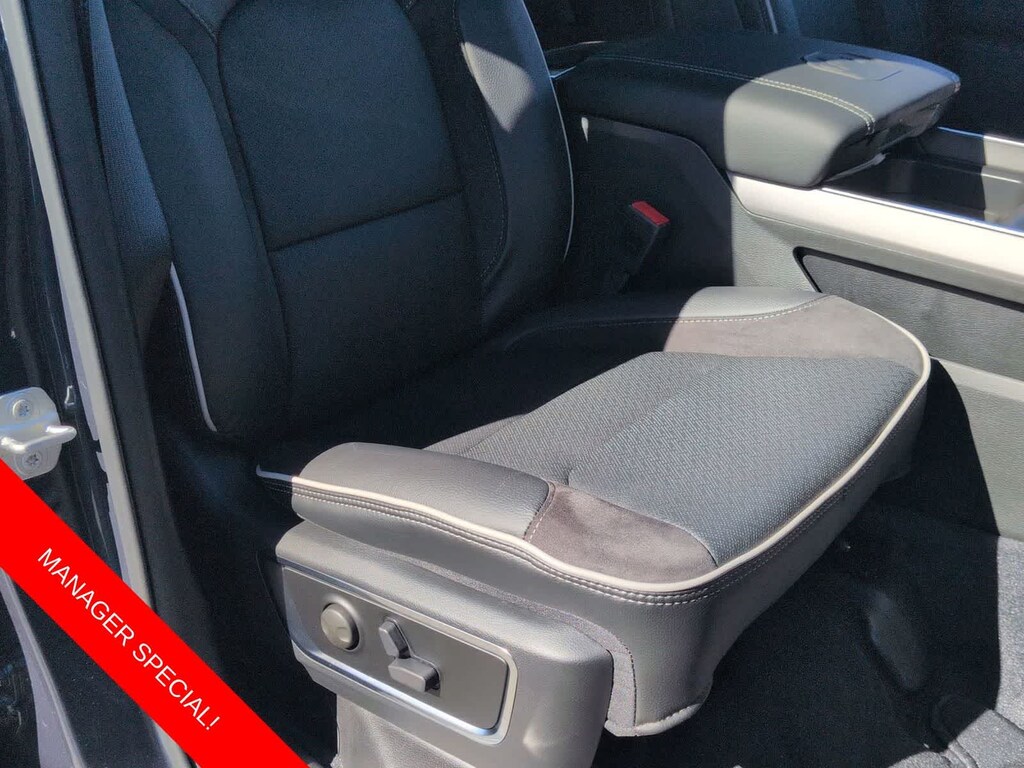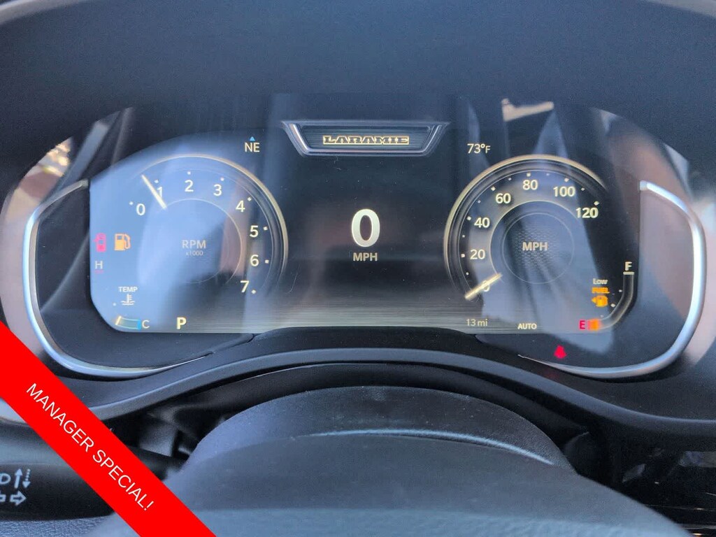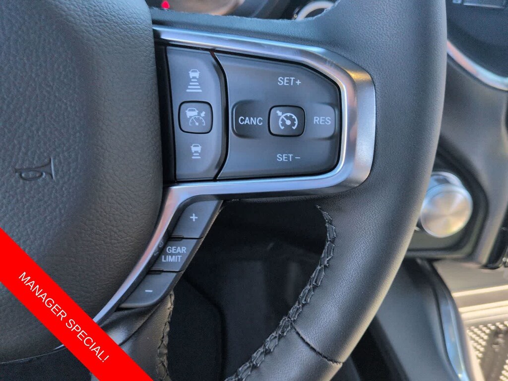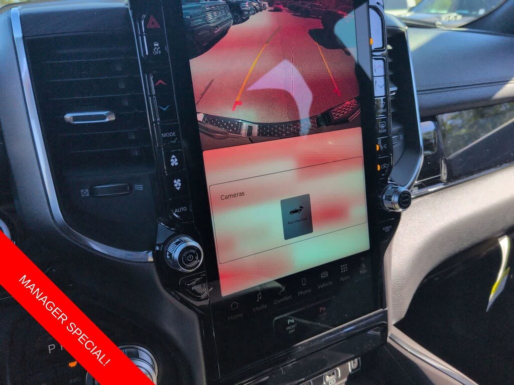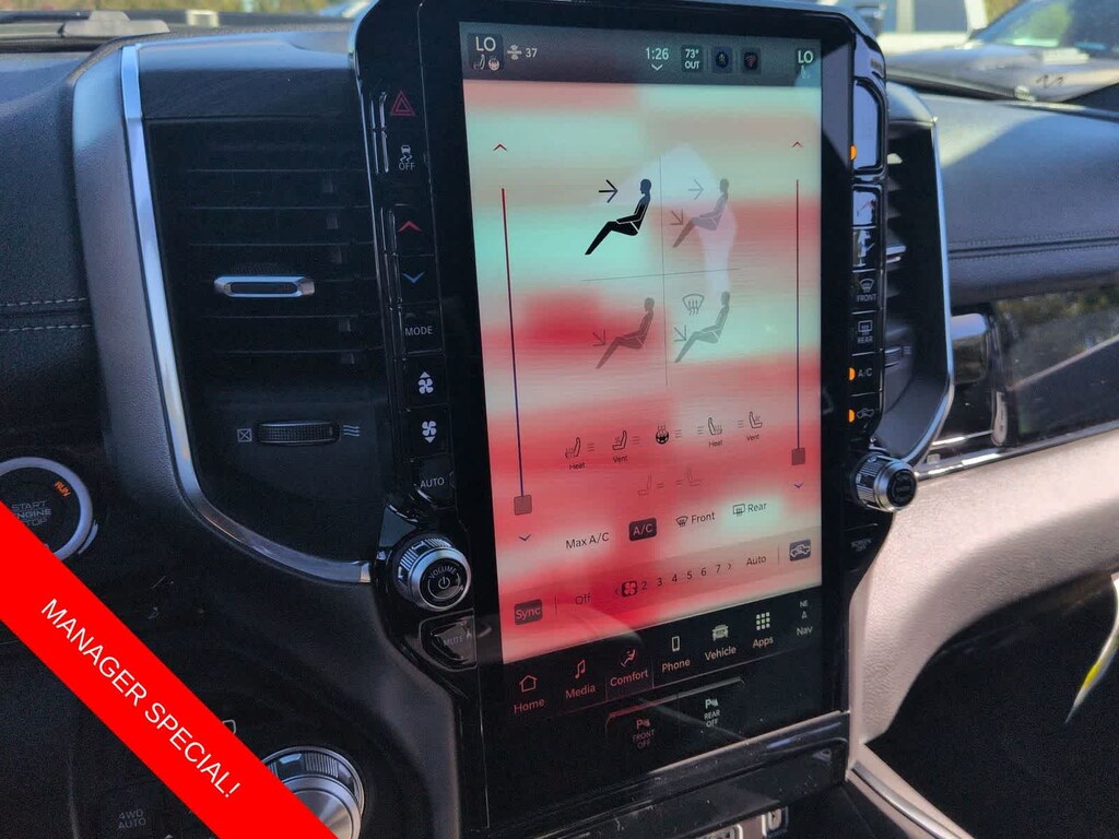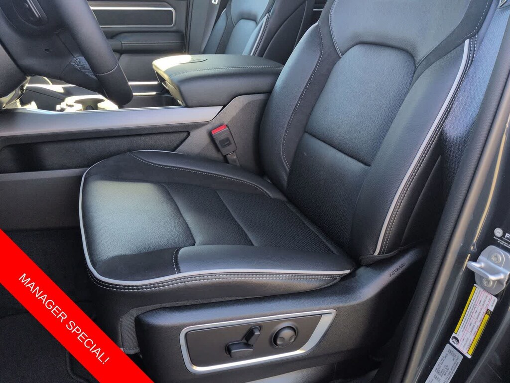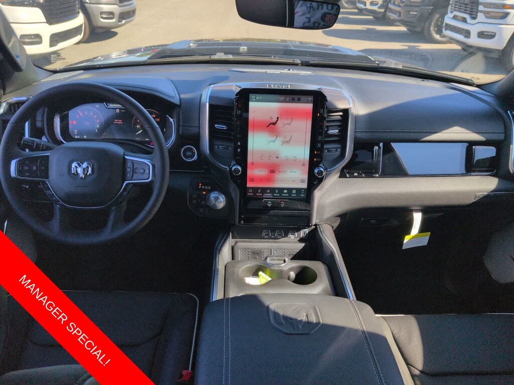 1500 Laramie is nicely equipped with Laramie Level 2 Equipment Group (14.4 Touchscreen Display, 4G LTE Wi-Fi Hot Spot, Cluster 12 TFT Color Display, Connected Travel and Traffic Services, Connectivity - US/Canada, Front Passenger Interactive Display, GPS Navigation, Harman/Kardon 19 Speaker Premium Sound, Integrated Center Stack Radio, Integrated Voice Command with Bluetooth, Power Tailgate, Radio: Uconnect 5 Nav with 14.4 Display, Rain Sensitive Windshield Wipers, SiriusXM Radio Service, SiriusXM with 360L, and USB Host Flip), Night Edition (Accent Color Door Handles, Accent Color Premium Power Mirrors, Accent Color Tailgate Handle, Anti-Spin Differential Rear Axle, Auto Power-Folding Mirrors, Auto-Dimming Exterior Driver Mirror, Black Exterior Truck Badging, Black Headlamp Bezels, Black Interior Accents, Black Painted Exterior Mirrors Caps, Black Tail Lamp Bezels, Body Color Front Bumper, Body Color Rear Bumper with Step Pads, Convex Wide-Angle Exterior Mirror Insert, Dual Exhaust with Black Tips, Exterior Mirrors Approach Lamps, Exterior Mirrors Courtesy Lamps, Exterior Mirrors with Heating Element, Exterior Mirrors with Memory, Exterior Mirrors with Supplemental Signals, Grille Surround 3 Black Texture 2 Black, Pirelli Brand Tires, Proximity Approach/Departure Lamps, RAM Grille Badge - Black, Sport Performance Hood, and Wheels: 22 x 9 Forged Aluminum), Quick Order Package 21H Laramie, 10 Speakers, 3.55 Rear Axle Ratio, 4-Wheel Disc Brakes, ABS brakes, Active Noise Control System, Adjustable pedals, Air Conditioning, Alloy wheels, AM/FM radio: SiriusXM with 360L, Apple CarPlay/Android Auto, Audio memory, Auto High-beam Headlights, Auto-dimming door mirrors, Auto-dimming Rear-View mirror, Automatic temperature control, Brake assist, Bumpers: chrome, Chrome Exterior Mirrors, Compass, Delay-off headlights, Dome Dual LED Reading Lamp, Driver door bin, Driver vanity mirror, Dual front impact airbags, Dual front side impact airbags, Dual-Pane Panoramic Sunroof, Electronic Stability Control, Front anti-roll bar, Front Bucket Seats, Front Center Armrest w/Storage, Front dual zone A/C, Front fog lights, Front reading lights, Front wheel independent suspension, Fully automatic headlights, Garage door transmitter, Heated door mirrors, Heated front seats, Heated rear seats, Heated steering wheel, Illuminated entry, Leather steering wheel, Leather Trimmed Bucket Seats, LED Dome/Reading Lamp, Low tire pressure warning, Memory seat, Navigation System, Occupant sensing airbag, Off-Road Information Pages, Outside temperature display, Overhead airbag, Overhead console, Panic alarm, ParkView Rear Back-Up Camera, Passenger door bin, Passenger vanity mirror, Pedal memory, Power Deployable Running Boards, Power door mirrors, Power driver seat, Power passenger seat, Power steering, Power windows, Radio data system, Radio: Uconnect 5 Navigation with 12.0 Display, RAM Grille Badge - Chrome, Rear anti-roll bar, Rear reading lights, Rear seat center armrest, Rear step bumper, Remote keyless entry, Security system, Speed control, Split folding rear seat, Steering wheel mounted audio controls, Tachometer, Telescoping steering wheel, Tilt steering wheel, Traction control, Trip computer, Turn signal indicator mirrors, Variably intermittent wipers, Ventilated front seats, Voltmeter, and Wheels: 20 x 9 Premium Paint/Polish.