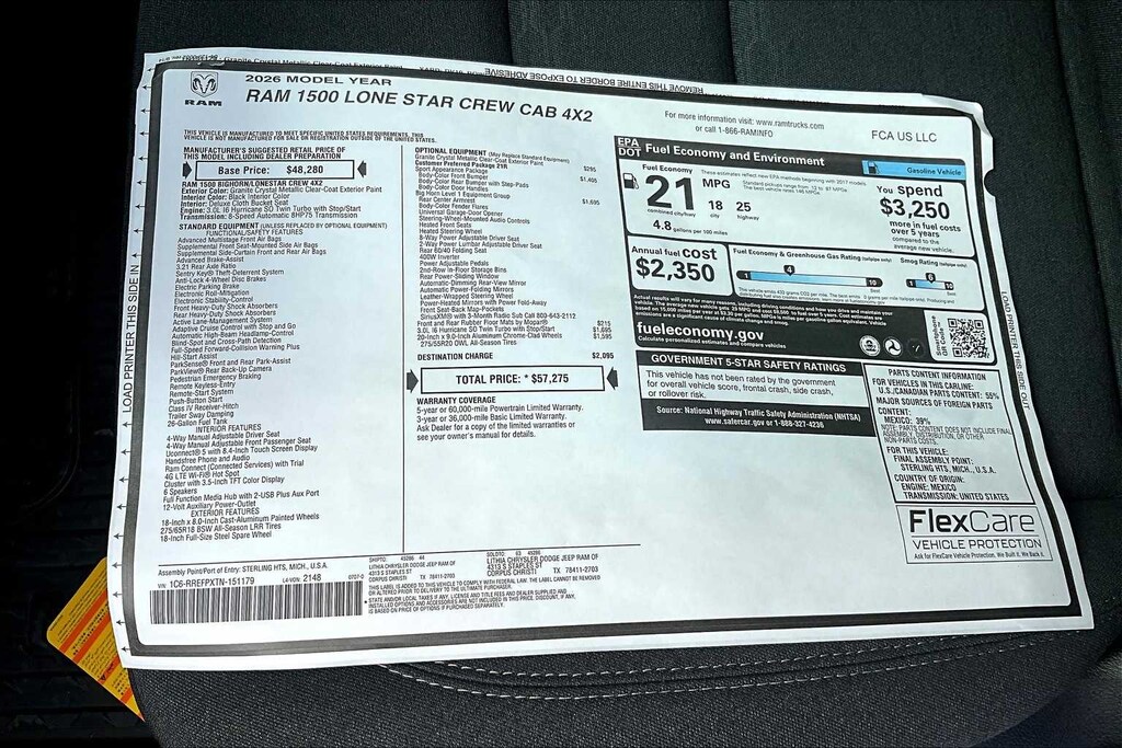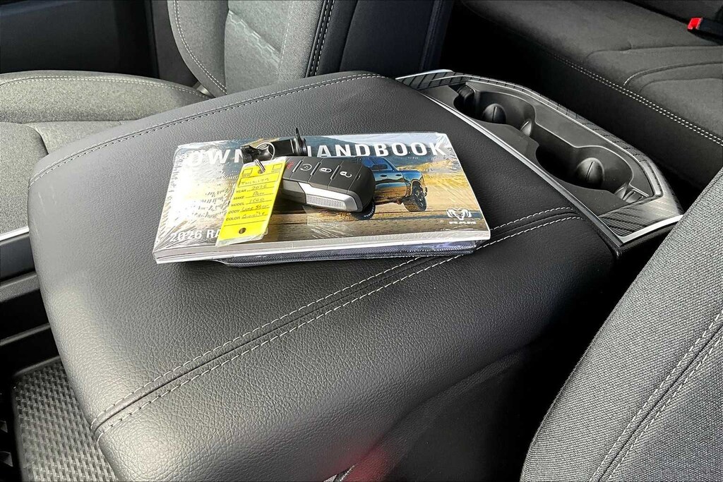Granite Crystal Metallic Clearcoat 2026 Ram 1500 Big Horn/Lone Star RWD 8-Speed Automatic 3.0L I6 FRESH OIL CHANGE, 115V Auxiliary Power Outlet, 2nd Row in Floor Storage Bins, 3 Rear Seat Head Restraints, 3.21 Rear Axle Ratio, 4 Way Front Headrests, 4-Wheel Disc Brakes, 400W Inverter, 48V Belt Starter Generator, 4G LTE Wi-Fi Hot Spot, 6 Speakers, ABS brakes, Air Conditioning, Alloy wheels, AM/FM radio, Apple CarPlay, Apple CarPlay/Android Auto, Auto High-beam Headlights, Auto Power-Folding Mirrors, Auto-Dimming Exterior Driver Mirror, Auto-Dimming Rear-View Mirror, Big Horn Level 1 Equipment Group, Black Exterior Mirrors, Black Interior Accents, Black Premium Power Mirrors, Body Color Door Handles, Body Color Fender Flares, Body Color Front Bumper, Body Color Rear Bumper with Step Pads, Body Color Tailgate Handle, Brake assist, Bucket Seats, Bumpers: chrome, Center Console Parts Module, Cloth Bucket Seats, Compass, Connectivity - US/Canada, Convex Wide-Angle Exterior Mirror Insert, Delay-off headlights, Deluxe Cloth Bucket Seats, Driver door bin, Dual front impact airbags, Dual front side impact airbags, Electronic Stability Control, Exterior Mirrors Courtesy Lamps, Exterior Mirrors with Heating Element, Exterior Mirrors with Supplemental Signals, Exterior Parking Camera Rear, Front anti-roll bar, Front Bucket Seats, Front Center Armrest w/Storage, Front fog lights, Front License Plate Bracket, Front reading lights, Front Seat Back Map Pockets, Front wheel independent suspension, Full Length Floor Console, Fully automatic headlights, Global Telematics Box Module, Glove Box Lamp, Google Android Auto, GPS Antenna Input, Grille Surround 1 Body Color Texture 1 Black, Heated door mirrors, Heated Front Seats, Heated Steering Wheel, Illuminated entry, Integrated Center Stack Radio, Integrated Voice Command with Bluetooth, Leather Wrapped Steering Wheel, Lone Star Badge, Low tire pressure warning, Manual Adjust 4-Way Driver Seat, Manual Adjust 4-Way Front Passenger Seat, Manual Folding Exterior Mirrors, Manufacturers Statement of Origin, MOPAR Front and Rear Rubber Floor Mats, Occupant sensing airbag, Outside temperature display, Overhead airbag, Overhead console, Panic alarm, Passenger door bin, Passenger vanity mirror, Power 2-Way Driver Lumbar Adjust, Power Adjust 8-Way Driver Seat, Power Adjustable Pedals, Power door mirrors, Power steering, Power windows, Quick Order Package 21R Lone Star, Radio data system, Radio: Uconnect 5 W with 8.4 Display, RAM Grille Badge - Chrome, Rear 60/40 Folding Seat, Rear anti-roll bar, Rear Center Armrest, Rear Dome with on/Off Switch Lamp, Rear Power Sliding Window, Rear step bumper, Rear Window Defroster, Remote keyless entry, SiriusXM Radio Service, SiriusXM Satellite Radio, Speed control, Sport Appearance Package, Steering Wheel Mounted Audio Controls, Sun Visors with Illuminated Vanity Mirrors, Supplier Part Tracking (J-1), Tachometer, Telescoping steering wheel, Tilt steering wheel, Traction control, Trip computer, Universal Garage Door Opener, USB Host Flip, Variably intermittent wipers, Voltmeter, Wheels: 18 x 8 Cast-Aluminum Painted. Price includes: $1000 - 2026 Southwest BC State of Texas Regional Bonus Cash . Exp. 03/02/2026 $3500 - 2026 National Retail Consumer Cash . Exp. 03/02/2026 $750 - 2026 Southwest BC Retail Bonus Cash . Exp. 03/02/2026