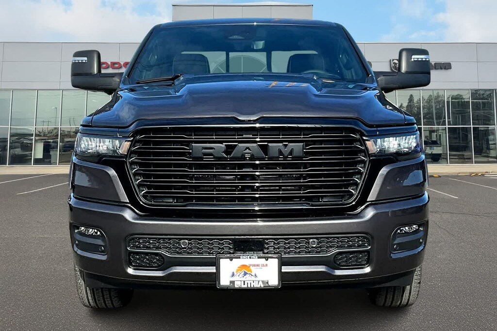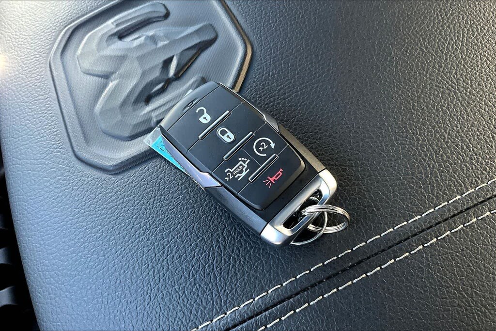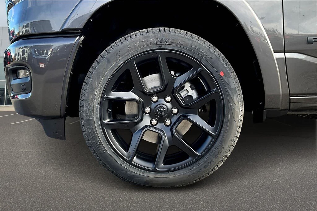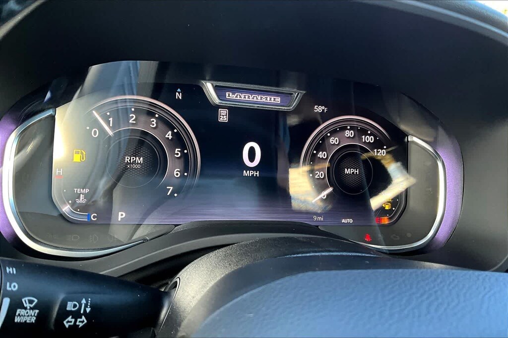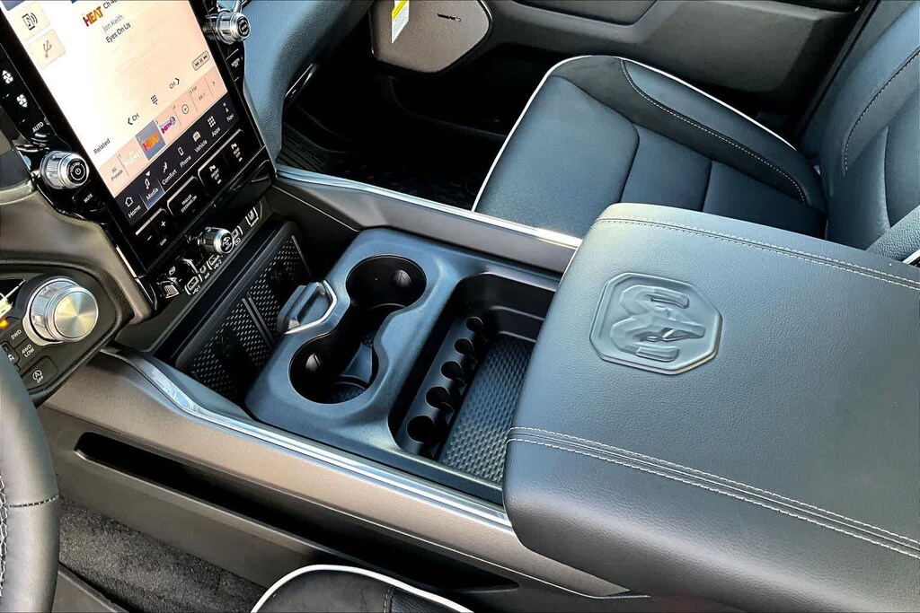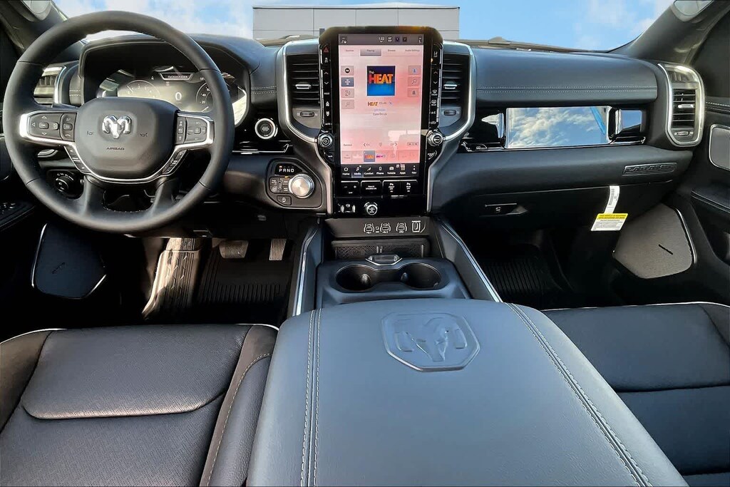 NIGHT EDITION Black Headlamp Bezels, Wheels: 22 x 9 Forged Aluminum, Tires: 285/45R22XL BSW All Season, Pirelli Brand Tires, Proximity Approach/Departure Lamps, Anti-Spin Differential Rear Axle, Accent Color Door Handles, Black Interior Accents, Body Color Front Bumper, Grille Surround 3 Black Texture 2 Black, Body Color Rear Bumper w/Step Pads, RAM Grille Badge - Black, Black Painted Exterior Mirrors Caps, Exterior Mirrors Approach Lamps, Accent Color Premium Power Mirrors, Sport Performance Hood, Black Exterior Truck Badging, Accent Color Tailgate Handle, Dual Exhaust w/Black Tips, Black Tail Lamp Bezels, ADVANCED SAFETY GROUP II Exterior Mirrors Approach Lamps, Active Driving Assist System, Surround View Camera System, Evasive Steer Assist, Drowsy Driver Detection, Intersection Collision Assist System, Traffic Sign Recognition, 12-Way/1-Way Trailer Connector, LARAMIE LEVEL 2 EQUIPMENT GROUP Rain Sensitive Windshield Wipers, Front Passenger Interactive Display, Secondary Active Grille Shutters, Smartphone As A Key Capable, 14.4 Touchscreen Display, Dual Wireless Charging Pad, Radio: Uconnect 5 Nav w/14.4 Display, harman/kardon® 19 Speaker Premium Sound, Cluster 12 TFT Color Display, Power Tailgate, TECHNOLOGY GROUP Head Up Display, LED CHMSL Lamp, 12-Way/1-Way Trailer Connector, MOPAR FRONT & REAR RUBBER FLOOR MATS, TRANSMISSION: 8-SPEED AUTOMATIC (8HP75) (STD), ENGINE: 5.7L V8 HEMI MDS VVT ETORQUE 48V Belt Starter Generator, Heavy Duty Engine Cooling, Passive Tuned Mass Damper, Delete Alternator, Passive Cold End Exhaust, 18 Aluminum Spare Wheel, 33 Gallon Fuel Tank, DUAL-PANE PANORAMIC SUNROOF LED Dome/Reading Lamp, Dome Dual LED Reading Lamp. Ram Laramie with Granite Crystal Metallic Clearcoat exterior and Black interior features a 8 Cylinder Engine with 420 HP at 5200 RPM*.